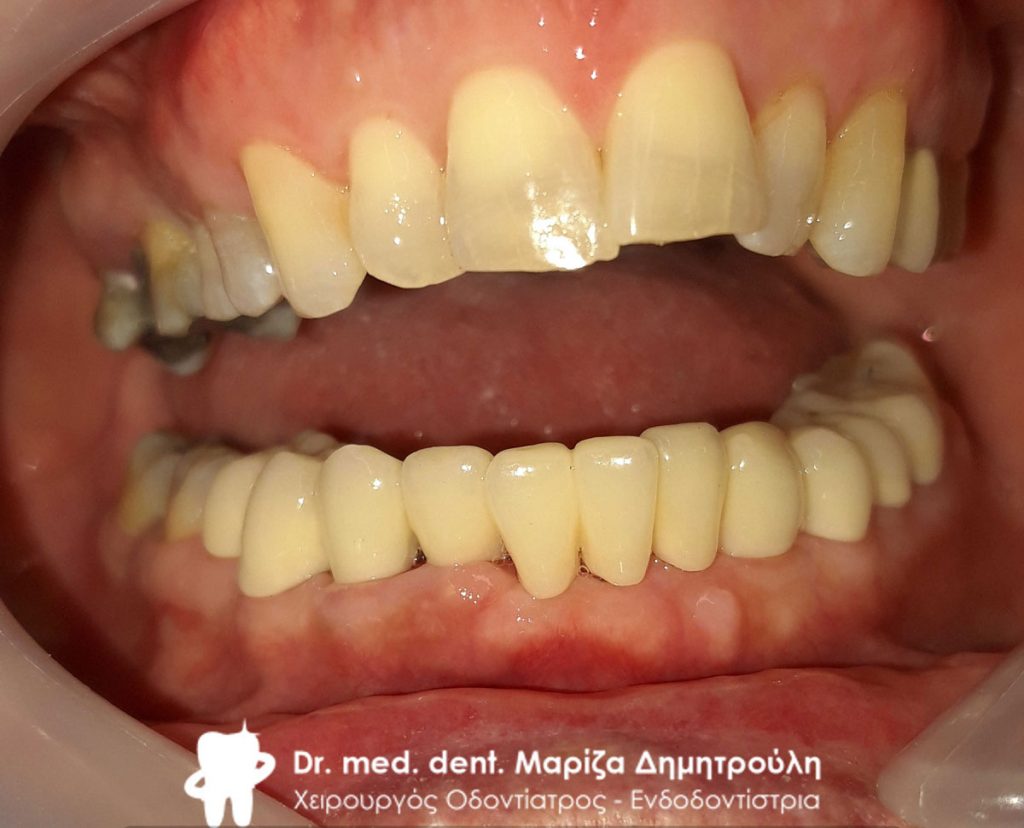 Η ασθενής παραπονιέται οτι την πονούν τα πρόσθια δόντια της κάτω γνάθου. Η κλινική και ακτινογραφική εξέταση αποκάλυψε την έντονη κινητικότητα των κάτω πρόσθιων δοντιών, η οποία οφειλόταν σε περιοδοντίτιδα. Τα δόντια τα οποία είχαν μεγάλη κινητικότητα αναγκαστικά αφαιρέθηκαν από το στόμα. Τα υπόλοιπα δόντια, εφόσον πραγματοποιήθηκαν οι απαραίτητες θεραπείες ( περιοδοντική θεραπεία, απονεύρωση δοντιού, ανασύσταση δοντιού), χρησιμοποιήθηκαν ως στηρίγματα για την ολοκεραμική γέφυρα που αποφασίστηκε να πραγματοποιηθεί στο στόμα της ασθενούς.