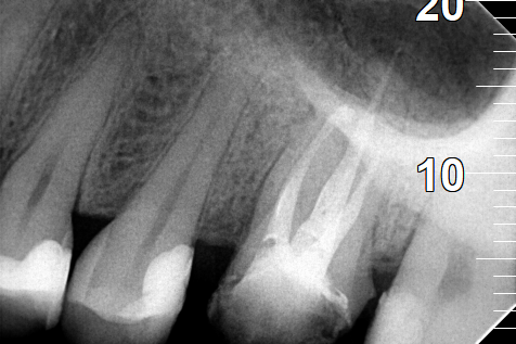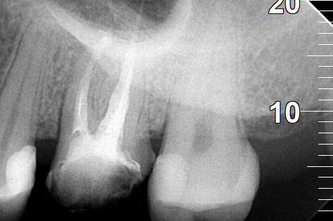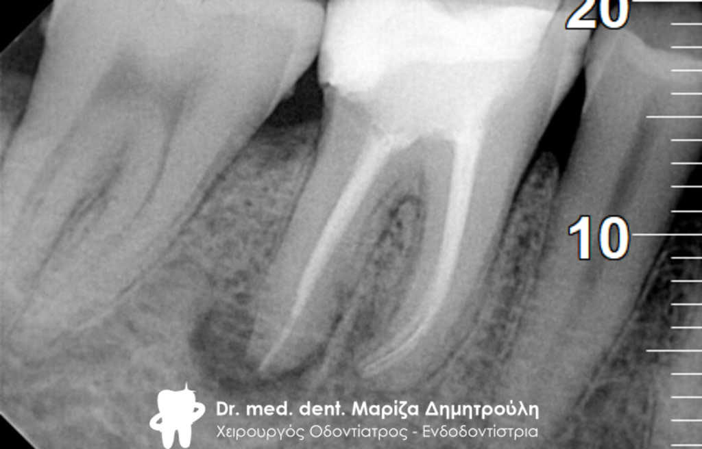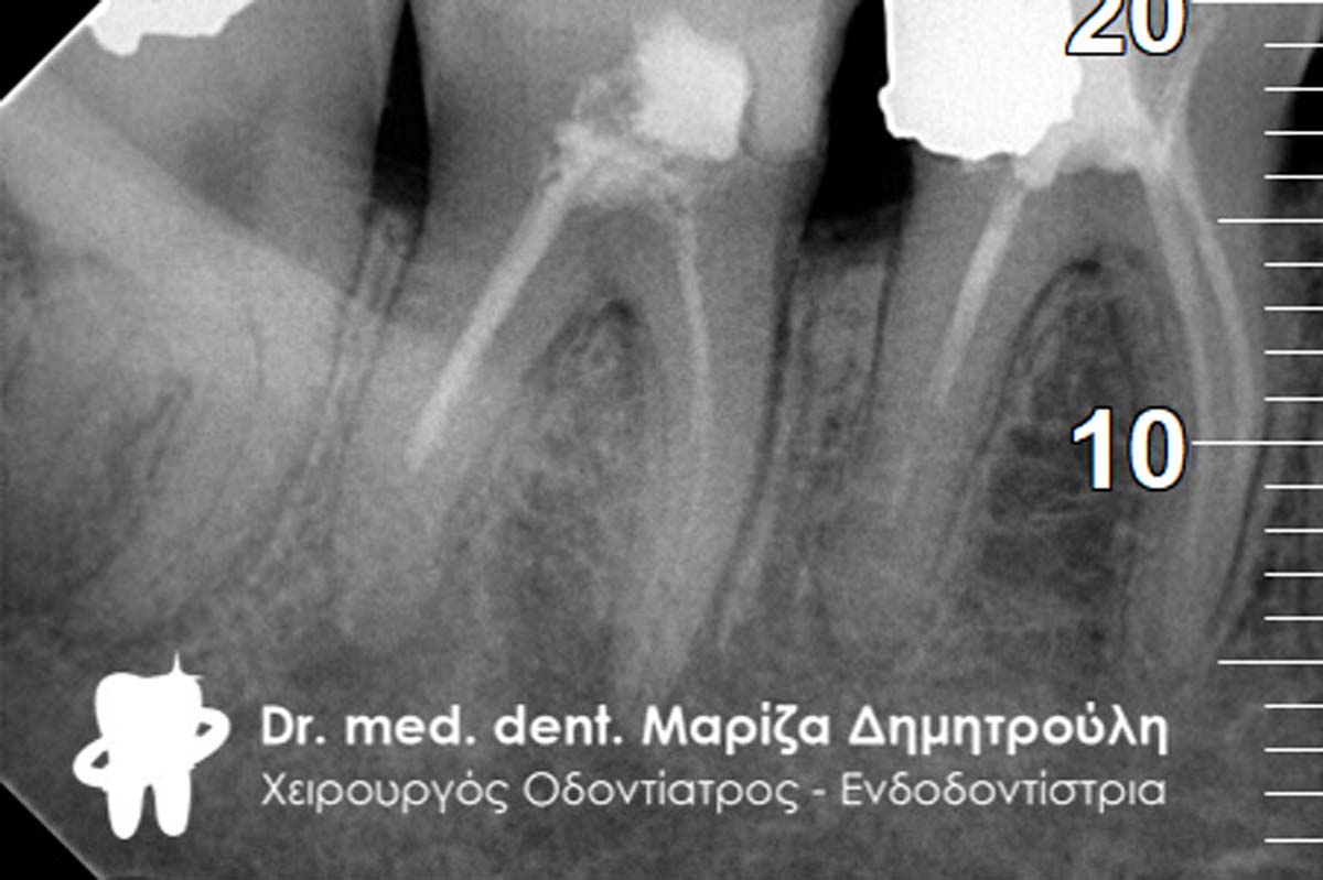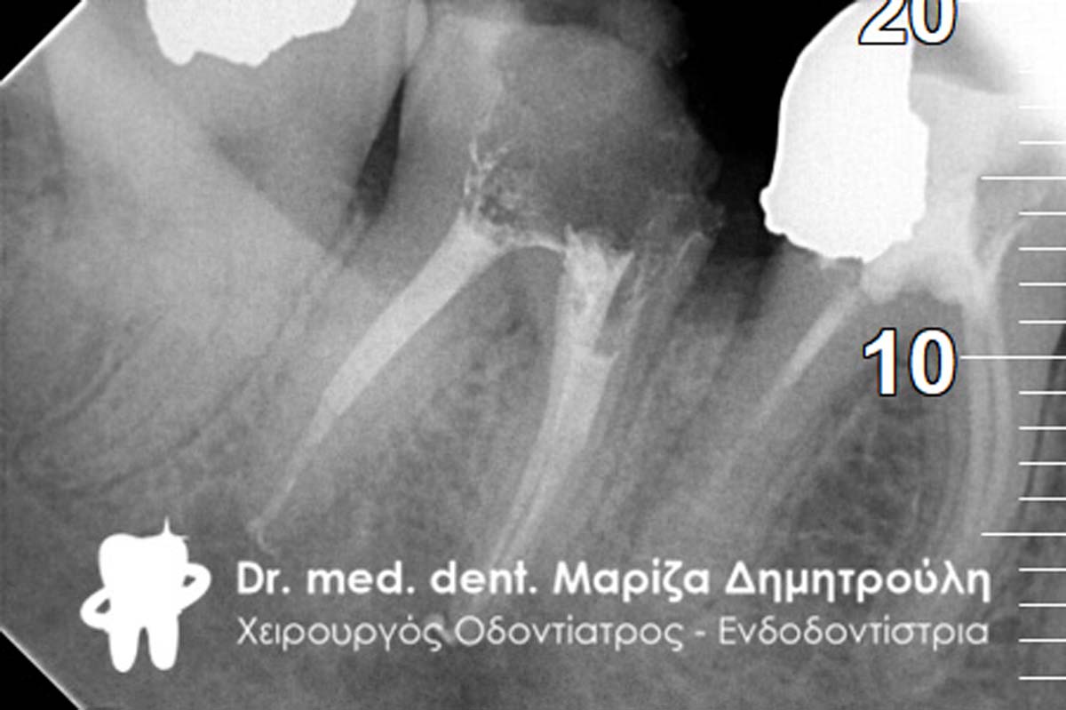 Διαπιστώθηκε η ενσβεστίωση 2 ριζικών σωλήνων του δοντιού (ριζών), κάτι που δεν επέτρεψε την επεξεργασία του δοντιού σε όλο το μήκος αυτών των ριζών. Παρολ΄ αυτά μετά τη δεύτερη συνεδρία ο ασθενής ανέφερε την ανακούφιση και την εξάλειψη των συμπτωμάτων, που τον ταλαιπωρούσαν τα τελευταία χρόνια.