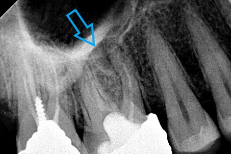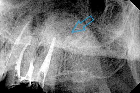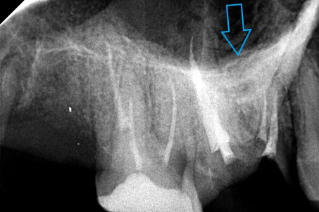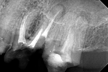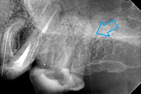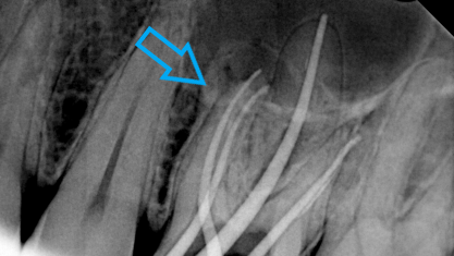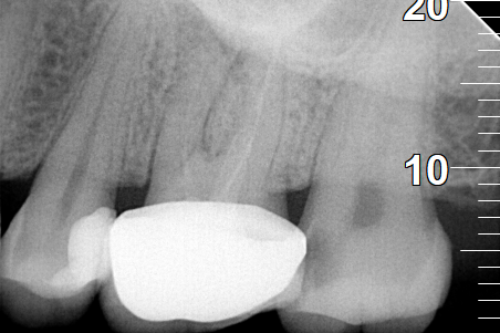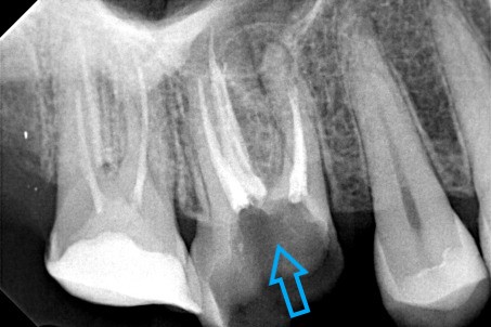 Μετά τη λήψη ακτινογραφίας διαπιστώθηκε οτι οι δύο από τις τρεις ρίζες του δοντιού είχαν μία ατελή έμφραξη, η οποία δεν έφτανε ως το ακρορριζικό τρήμα του δοντιού. Κλινικά το δόντι πονούσε έντονα κατά την επίκρουση.