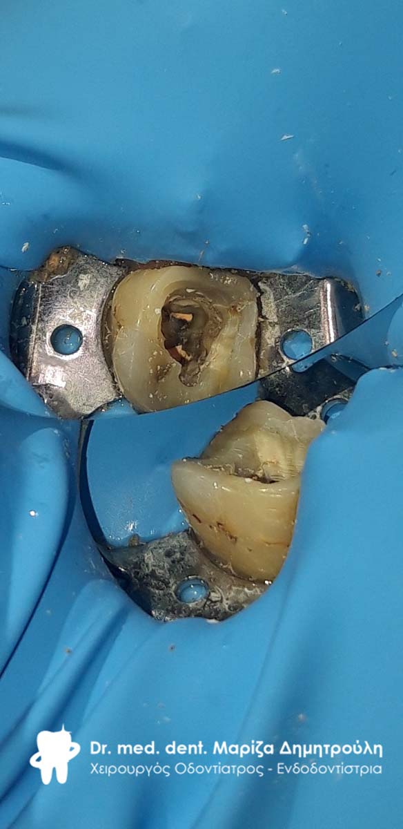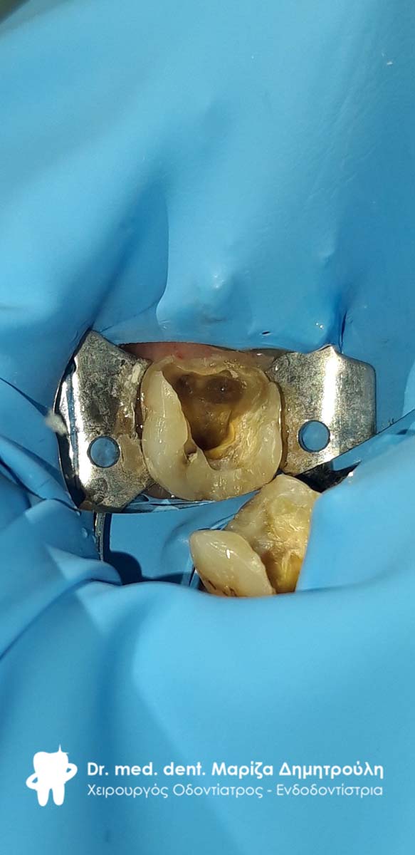 Μετά την χορήγηση τοπικής αναισθησίας τοποθετήθηκε ελαστικός απομονωτήρας (λάστιχο) και έγινε διάνοιξη του δοντιού. Στη συνέχεια ξεκίνησε η επανάληψη της ενδοδοντικής θεραπείας (απονεύρωση) με την αφαίρεση του παλιού εμφρακτικού υλικού σε όλο το μήκος των τριών ριζών του δοντιού. Ακολούθησε η επεξεργασία του δοντιού με μηχανοκίνητα εργαλεία και οι διακλυσμοί ( έκπλυση ) στο εσωτερικό των ριζών για την απομάκρυνση των νεκρών οδοντικών ιστών / κυττάρων και την απολύμανση των ριζών. Έγινε τοποθέτηση φαρμάκου και έγινε προγραμματισμός για τη συνέχιση της απονεύρωσης σε επόμενο ραντεβού.