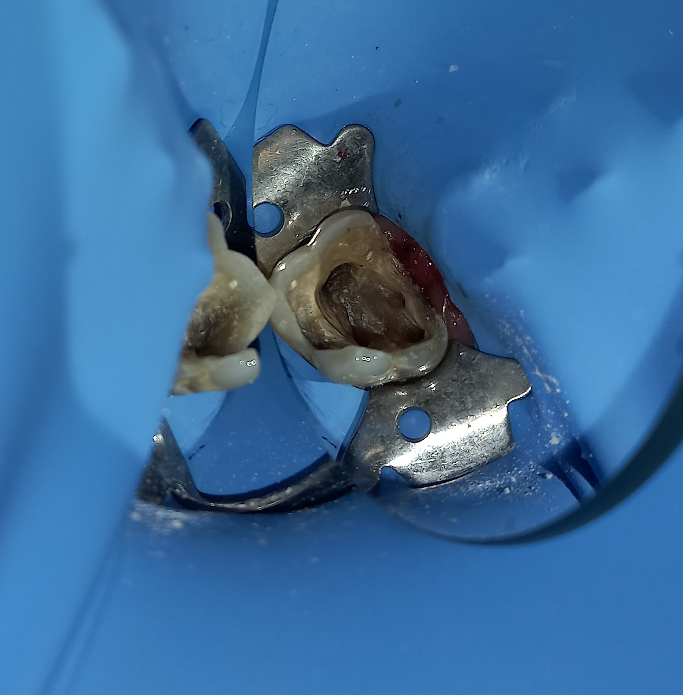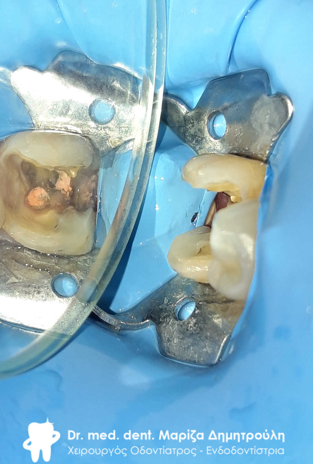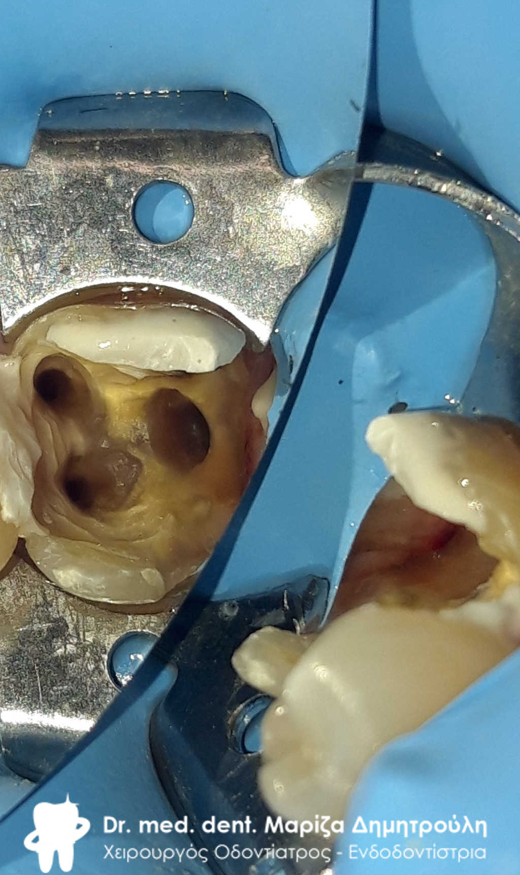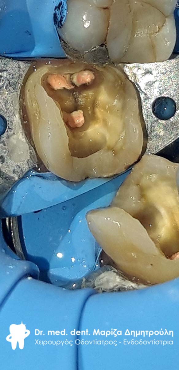 Το δόντι με τον απομονωτήρα. Διακρίνονται 4 ριζικοί σωλήνες