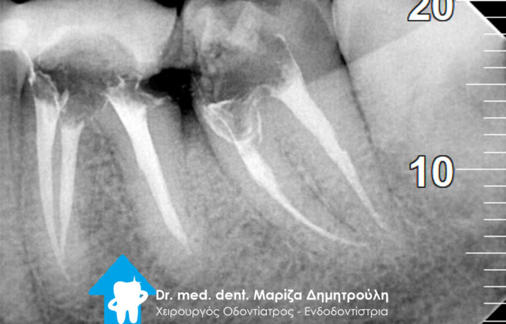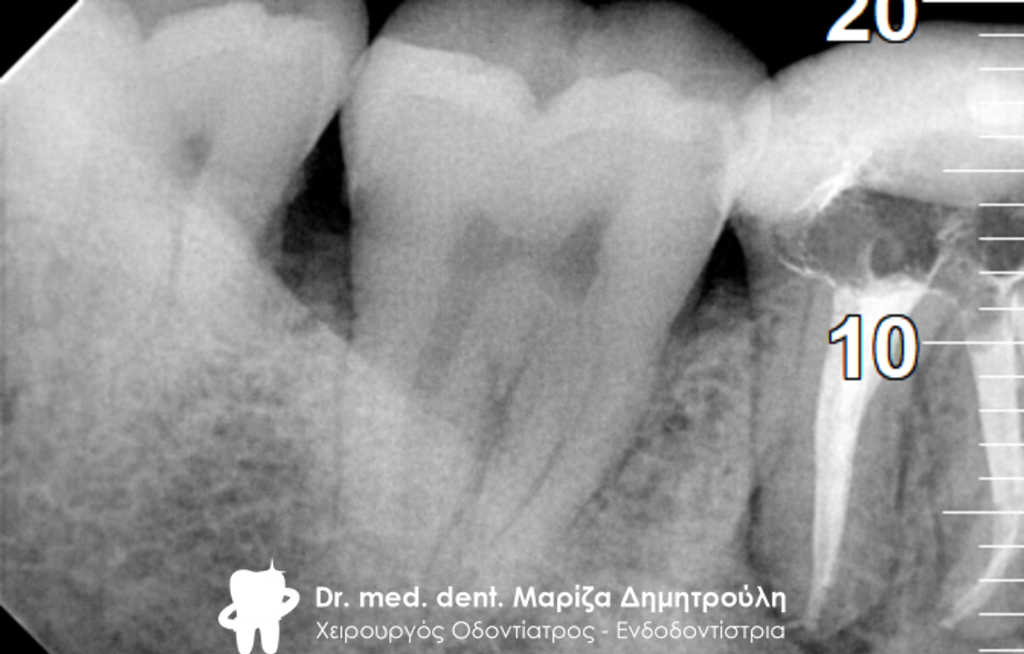 Ο ασθενής τον τελευταίο καιρό ταλαιπωρείται από έντονα συμπτώματα πόνου στη δεξιά μεριά της κάτω γνάθου. Σύμφωνα με τα λεγόμενα του στο δόντι είχε πραγματοποιηθεί απονεύρωση και στη συνέχεια τοποθετήθηκε ένθετο για την αποκατάσταση του οδοντικού ελλείμματος. Κατευθείαν πραγματοποιήθηκε ακτινογραφία του δοντιού, η οποία έδειξε την ατελή έμφραξη των ριζικών σωλήνων του δοντιού, καθώς το υλικό έμφραξης δεν εκτεινόταν σε όλο το μήκος των ριζών του δοντιού. Η κλινική εξέταση επιβεβαίωσε την έντονη αντίδραση του δοντιού κατά την επίκρουση του.