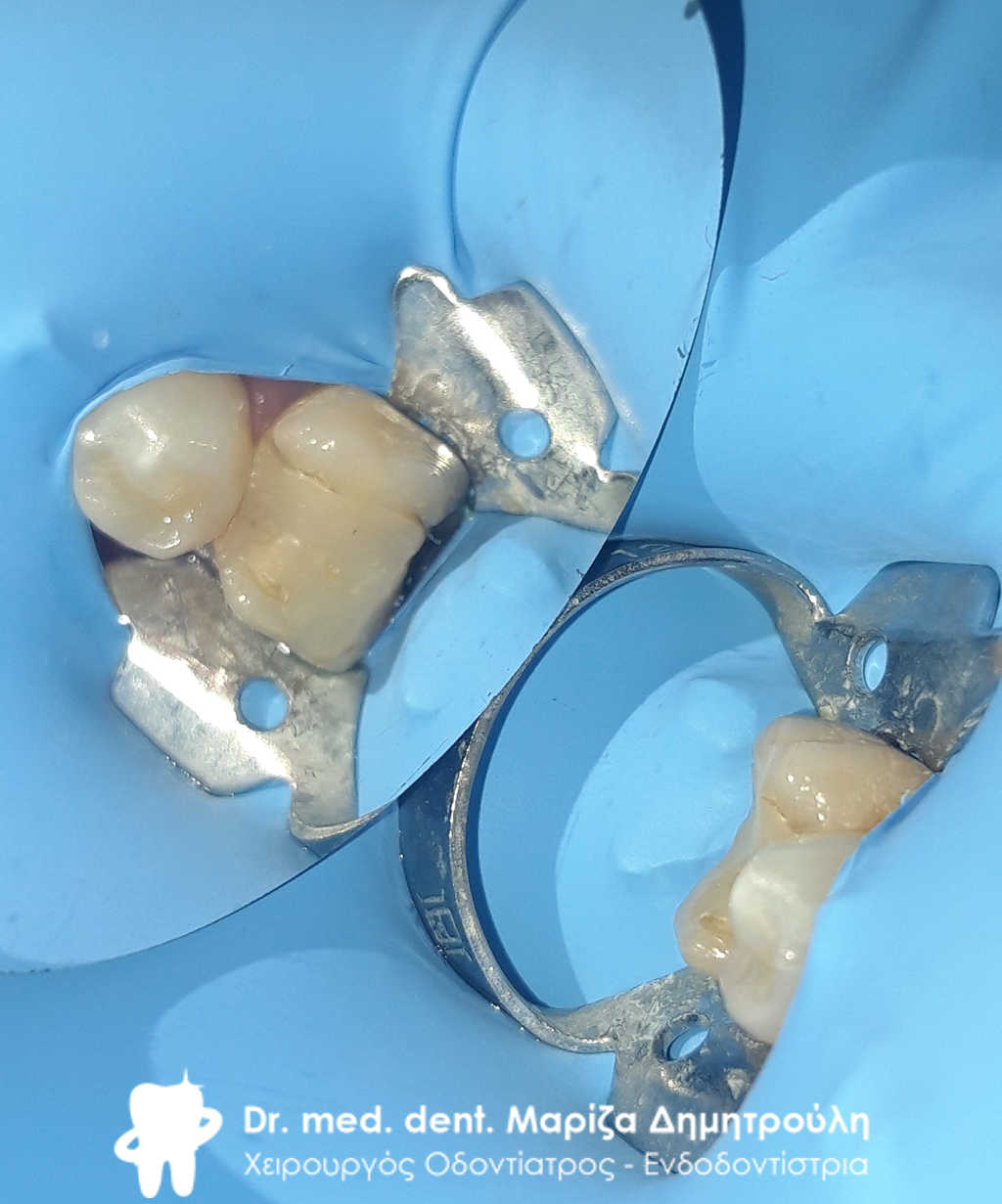 Η τελική αποκατάσταση του δοντιού πραγματοποιήθηκε με μεταλλοκεραμική στεφάνη δοντιού για την καλύτερη προστασία του ταλαιπωρημένου δοντιού.