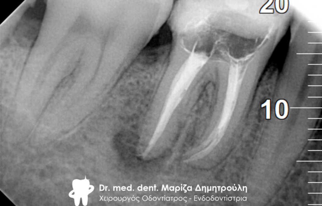 Λόγω του οιδήματος στην περιοχή το δόντι δεν εμφάνιζε συμπτώματα πόνου στο τρίτο ραντεβού, οπότε και ολοκληρώθηκε η ενδοδοντική θεραπεία με την έμφραξη των ριζικών σωλήνων με το υλικό της γουταπέρκας.
