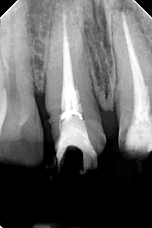 Μετά λοιπόν την αφαίρεση του παλιού σφραγίσματος εντοπίστηκε ο τρίτος ριζικός σωλήνας που δεν είχε βρεθεί στην παλιά πρώτη απονεύρωση, όπως δείχνει και η φωτογραφία της αρχικής κλινικής εικόνας. Στη συνέχεια καθαρίστηκαν και επεξεργάστηκαν όλοι οι ριζικοί σωλήνες (Για περισσότερες πληροφορίες Βλέπε Επανάληψη απονεύρωσης). Η διαδικασία ολοκληρώθηκε με την έμφραξη των ριζικών σωλήνων του δοντιού και την ανασύσταση της εκτεταμένης κοιλότητας με ειδικό άξονα υαλονημάτων και ρητίνη. Ακολούθως το δόντι τροχίστηκε, λήφθηκαν αποτυπώματα και όταν ο οδοντοτεχνίτης είχε έτοιμη τη θήκη του δοντιού αυτή κολλήθηκε στο δόντι.