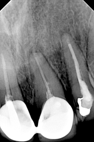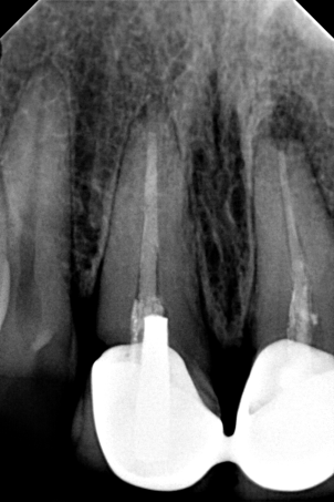 Αφού ολοκληρώθηκαν οι παραπάνω εργασίες πραγματοποιήθηκε αποκατάσταση των δοντιών με άξονες υαλονημάτων και κατασκεύη καινούριων στεφανών. Οπώς φαίνεται και στην τελική ακτινογραφία 6 μήνες μετά την διεκπεραίωση του σχεδίου θεραπείας η φλεγμονή στο ακρορρίζιο του δοντιού είχε ήδη υποχωρήσει.