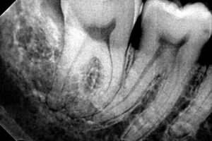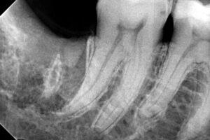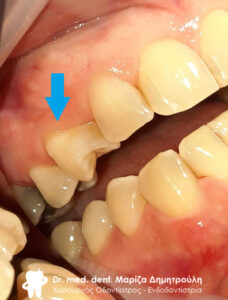 Η ασθενής είχε ένα δόντι στο οποίο είχε ξεκινήσει η διαδικασία απονεύρωσης, αλλά καθυστέρησε να ολοκληρωθεί εγκαίρως. Τα ενδοδοντικά θεραπευμένα δόντια είναι ευαίσθητα και σπάζουν πολύ πιο εύκολα συγκριτικά με ένα ζωντανό, μη απονευρωμένο δόντι. Για το λόγο αυτό είναι σημαντικό η απονεύρωση ενός δοντιού να τελειώνει σε 2 – 3 ραντεβού σε διάστημα 2 εβδομάδων, εφόσον όλα βαίνουν καλώς και το δόντι δεν παρουσιάζει κάποιο ιδιαίτερο πρόβλημα.