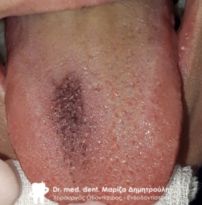 Σε κάποιες περιπτώσεις είναι δυνατόν η γλώσσα του ασθενή να χρωματιστεί μαύρη. Σίγουρα ο ασθενής τρομάζει και θορυβείται. Είναι όμως συνετό να απευθυνθεί άμεσα στον οδοντίατρο ή στο στοματολόγο για την έγκυρη διάγνωση και θεραπεία. Στο παρακάτω περιστατικό η ασθενής χρησιμοποιούσε για συγκεκριμένο χρονικό διάστημα στοματικό διάλυμα χλωρεξιδίνης για την αντιμετώπιση ενός προβλήματος που παρουσίαζαν τα ούλα της. Σταδιακά παρατήρησε το χρωματισμό της γλώσσας της, ο οποίος έγινε ιδιαίτερα έντονος μετά από δύο εβδομάδες. Αμέσως μετά τη διακοπή χρήσης χλωρεξιδίνης η γλώσσα της επανήλθε στο φυσιολογικό ροζ χρώμα.