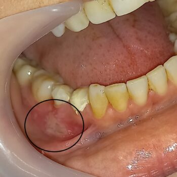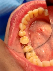 Σε πολλές περιπτώσεις είναι πιθανόν κατά τη διάρκεια της απονεύρωσης να ερεθιστεί ο βλεννογόνος της γειτονικής περιοχής του δοντιού που θεραπεύεται. Ο ερεθισμός αυτός έχει την κλινική εικόνα που παρουσιάζεται στην παρακάτω φωτογραφία. Ο ερεθισμός αυτός δεν είναι καθόλου ανησυχητικός και προκύπτει όταν δεν χρησιμοποιείται ο κατάλληλος προστατευτικός εξοπλισμός, δηλαδή ο απομονωτήρας. Με το πέρσμα 1- 2 εβδομάδων ο βλεννογόνος ηρεμεί και επανέρχεται στην αρχική φυσιολογική του κατάσταση.