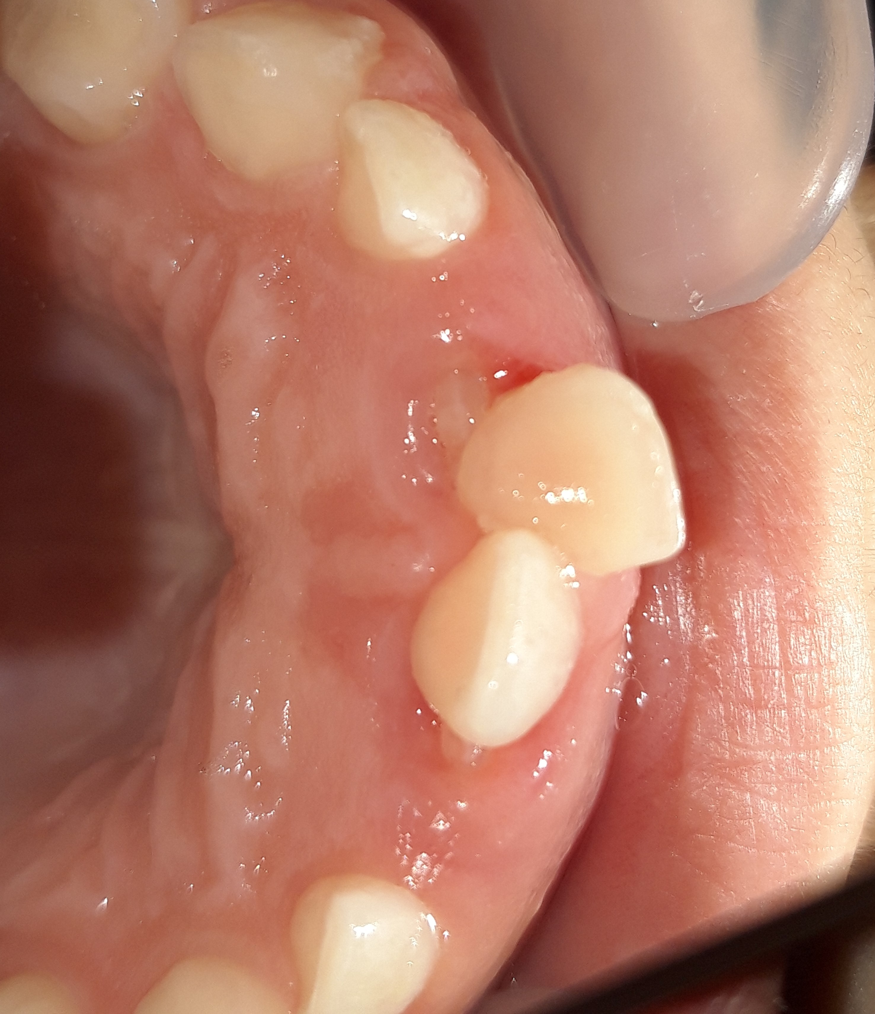 Οι γονείς παρατήρησαν οτι ο αριστερός νεογιλός τομέας δεν “κουνιέται” παρόλο που είχαν κάνει την εμφάνιση τους τα δύο μόνιμα πρόσθια κάτω δόντια. Μετά την κλινική εξέταση επιβεβαιώθηκε οτι το παιδικό δοντάκι δεν είχε καμία κινητικότητα, οπότε και αποφασίστηκε η αφαίρεση στο ιατρείο, μετά από χορήγηση τοπικής αναισθησίας.