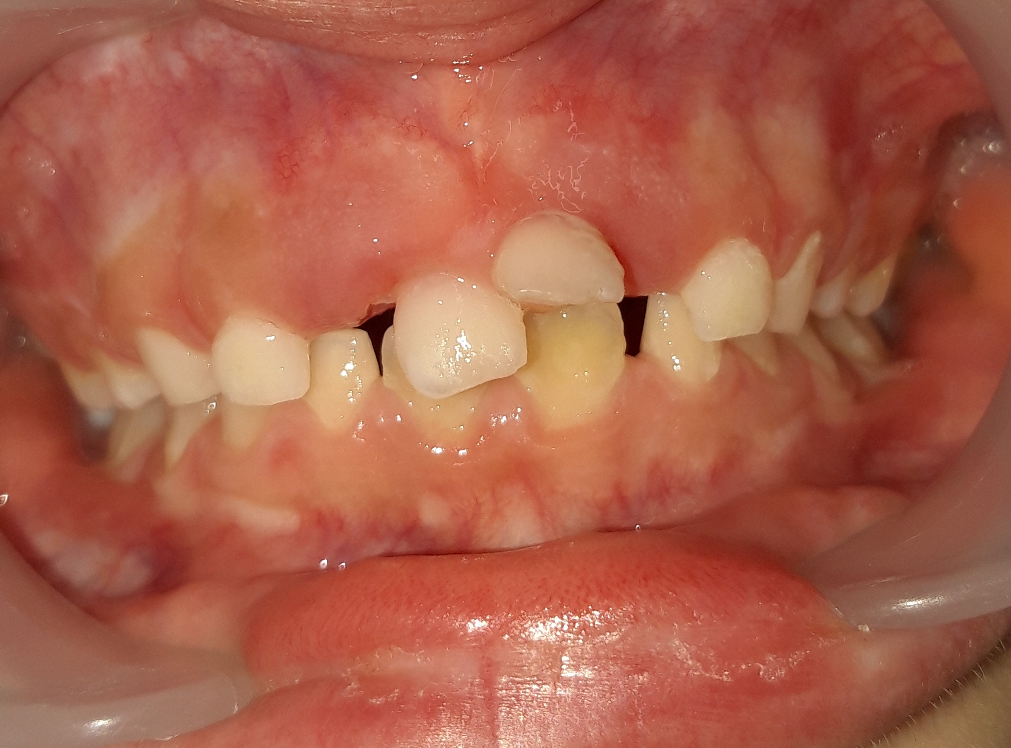 Το παιδικό δοντάκι στη μικρή ασθενή είχε παραμείνει στη θέση του, ενώ είχε κάνει την εμφάνιση του το αντίστοιχο μόνιμο δόντι. Η φωτογραφία δείχνει την εικόνα του στόματος του κοριτσιού αμέσως μετά την εξαγωγή του νεογιλού τομέα. Το μόνιμο δοντάκι που βρισκόταν πίσω από το αντίστοιχο νεογιλό θα πάρει την τελική του θέση μέσα στο στόμα του παιδιού σε διάστημα 3 – 4 εβδομάδων.