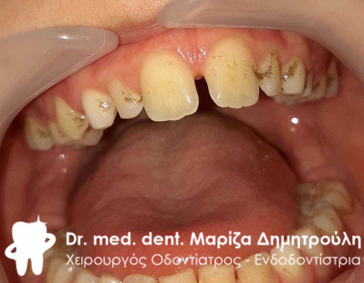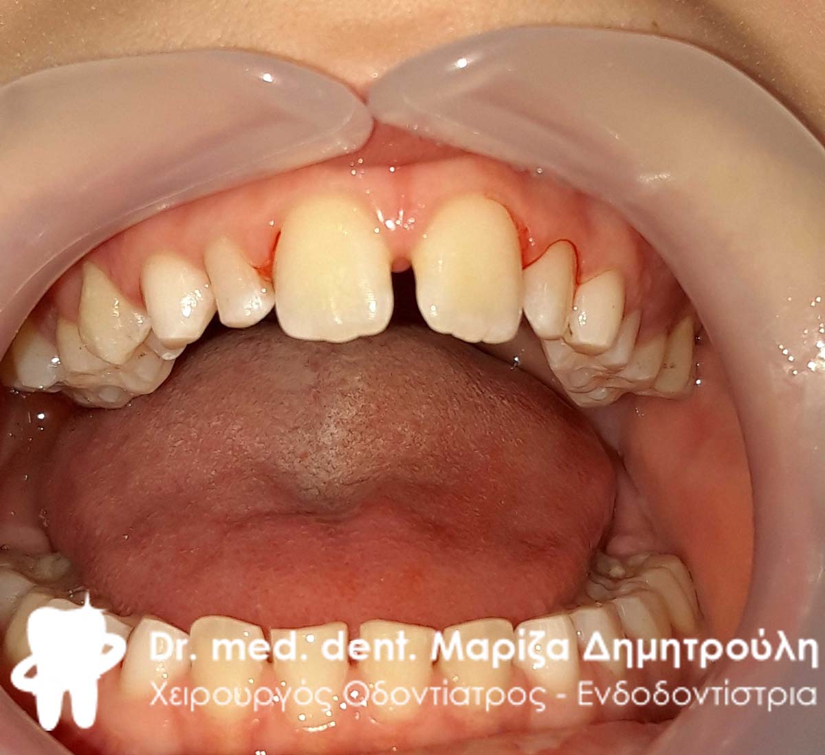 Ο μικρός ασθενής είχε την επιθυμία να καθαρίσουν τα δοντάκια του από τα μαύρα στίγματα. Έγινε λεπτομερής καθαρισμός των δοντιών και το αγοράκι απέκτησε ξανά ένα όμορφο και λαμπερό χαμόγελο. Το ένα και μοναδικό δόντι που δε καθαρίστηκε (κάτω δεξί πρόσθιο δόντι) αφαιρέθηκε την ίδια μέρα στο ιατρείο γιατί κουνιόταν κ ήταν έτοιμο να πέσει.