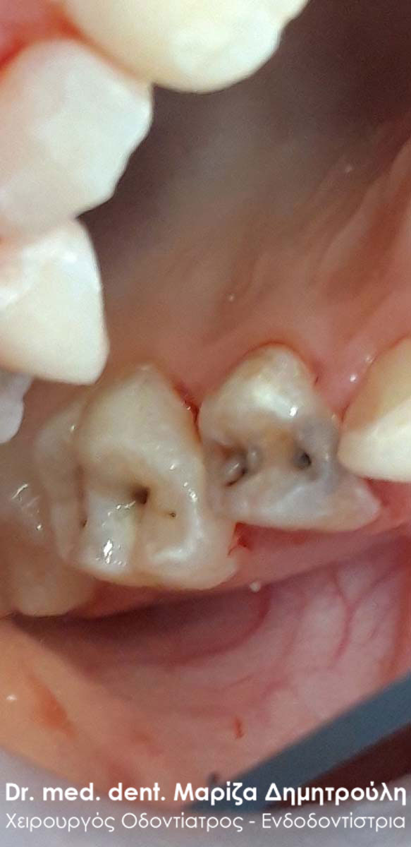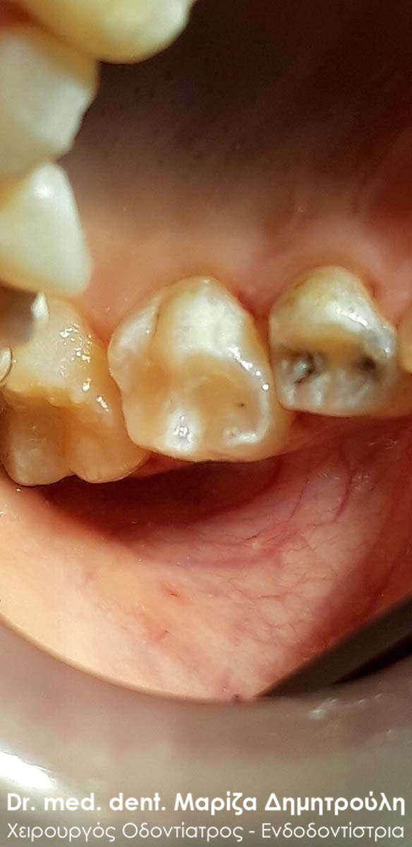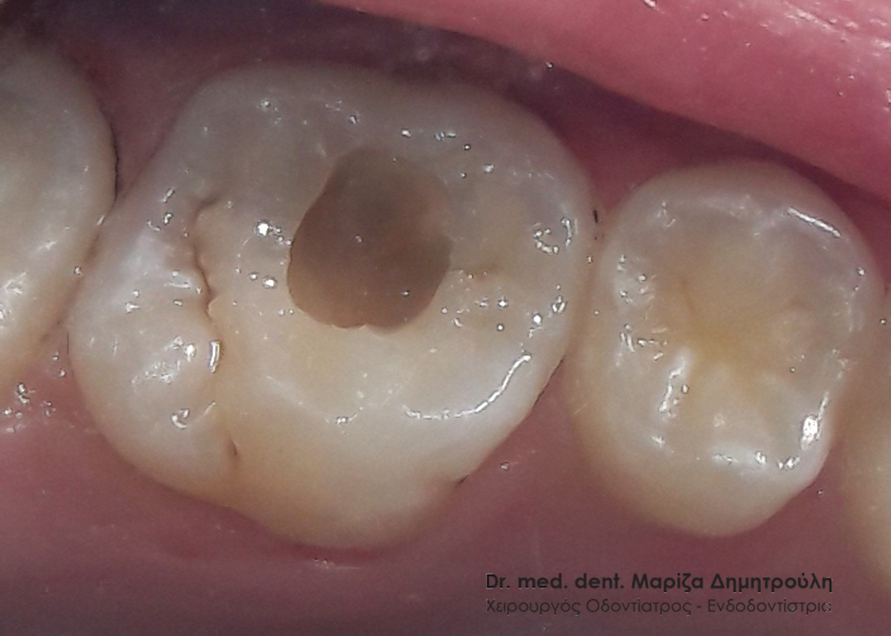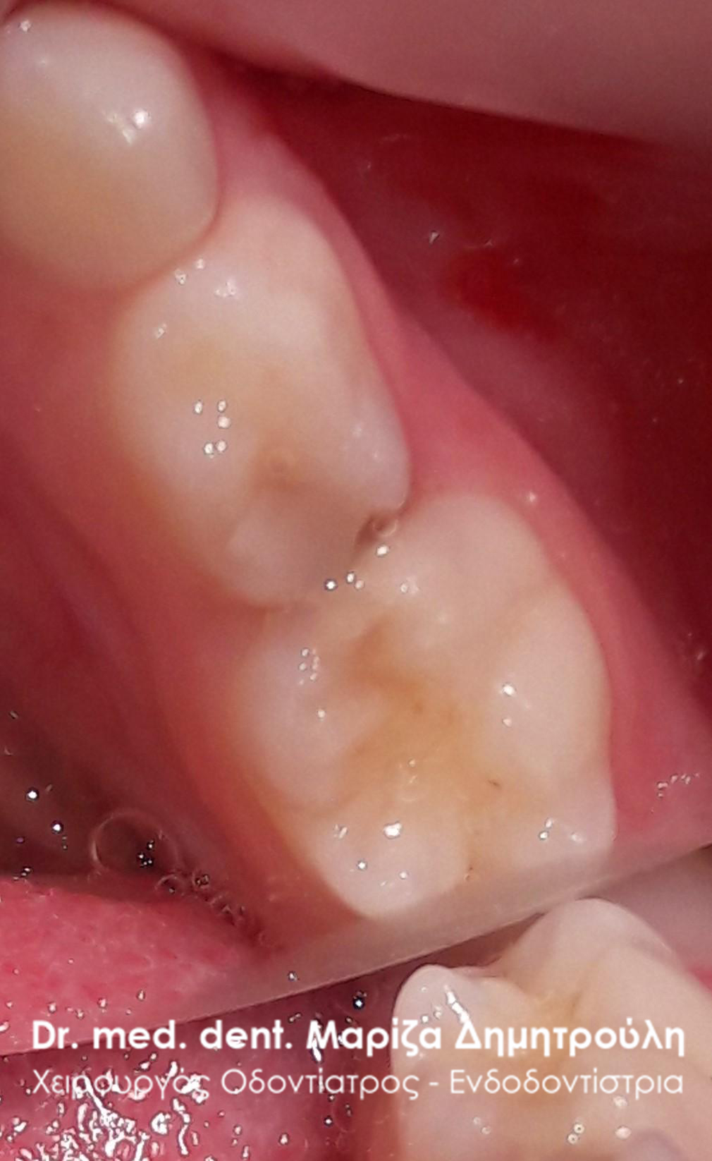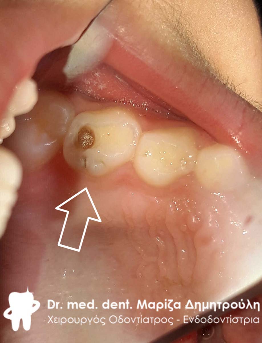 Κορίτσι ηλικίας 9 ετών αναφέρει οτι πονάει στην πάνω αριστερή πλευρά του στόματος της όταν μασάει. Μετά την κλινική εξέταση διαπιστώθηκε η ύπαρξη 2 τερηδονισμένων δοντιών. Στον πρώτο μόνιμο αριστερό γομφίο είναι εμφανής η ύπαρξη τερηδόνας, της οποίας η έκταση αποδείχτηκε αρκετά βαθιά κατά τη διάνοιξη του δοντιού. Στο δεύτερο νεογιλό (παιδικό) γομφίο παρατηρήθηκε η ύπαρξη τερηδονικής κοιλότητας μεσαίου βάθους.