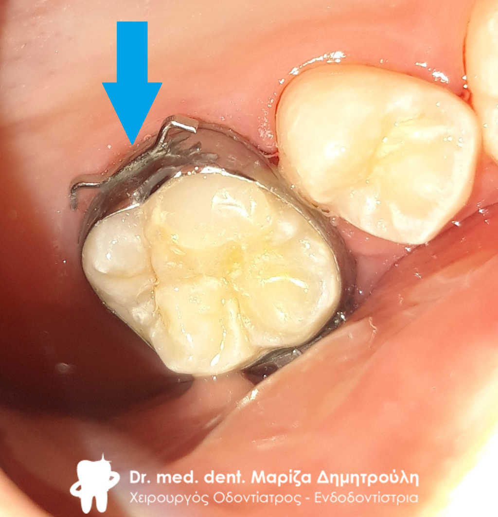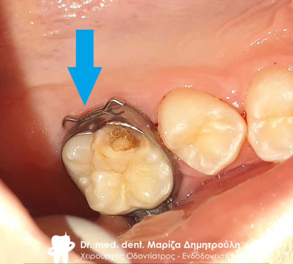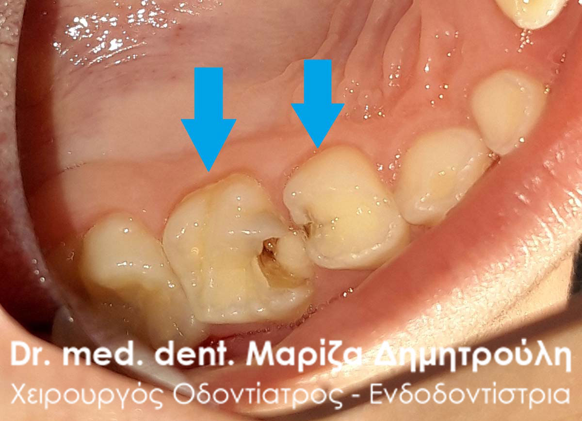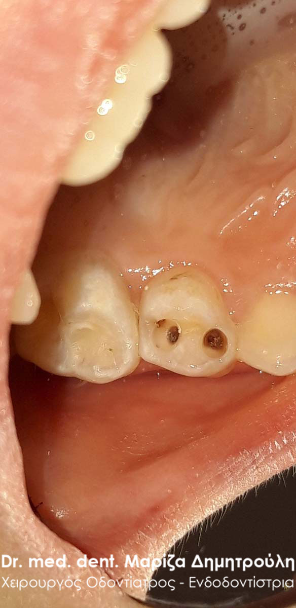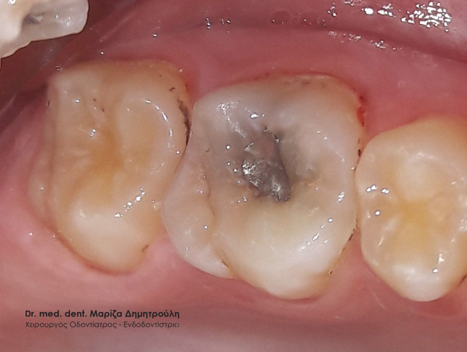Κορίτσι ηλικίας 9 ετών αναφέρει οτι πονάει στην πάνω αριστερή πλευρά του στόματος της όταν μασάει. Μετά την κλινική εξέταση διαπιστώθηκε η ύπαρξη 2 τερηδονισμένων δοντιών. Στον πρώτο μόνιμο αριστερό γομφίο είναι εμφανής η ύπαρξη τερηδόνας, της οποίας η έκταση αποδείχτηκε αρκετά βαθιά κατά τη διάνοιξη του δοντιού. Στο δεύτερο νεογιλό (παιδικό) γομφίο παρατηρήθηκε η ύπαρξη τερηδονικής κοιλότητας μεσαίου βάθους.