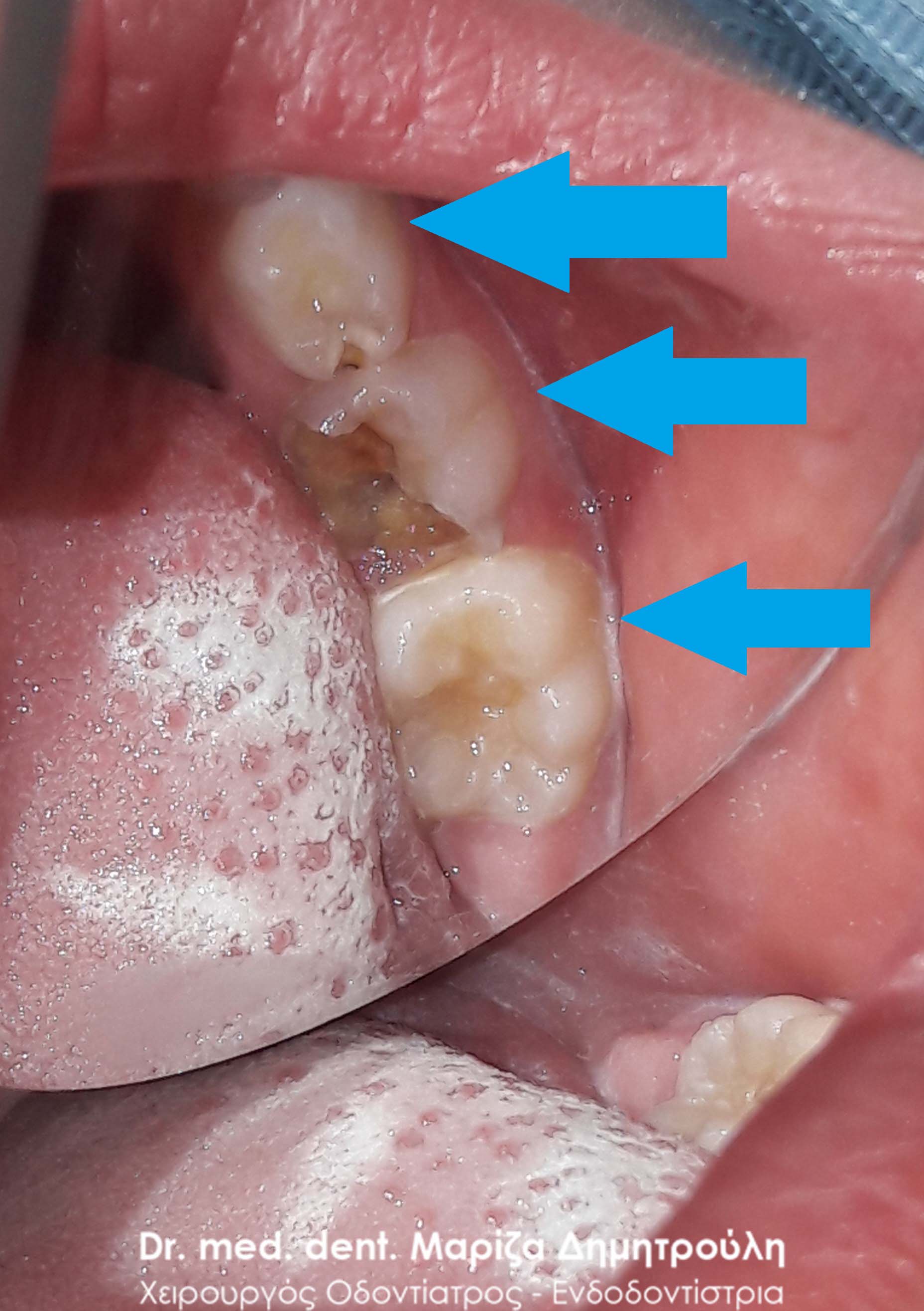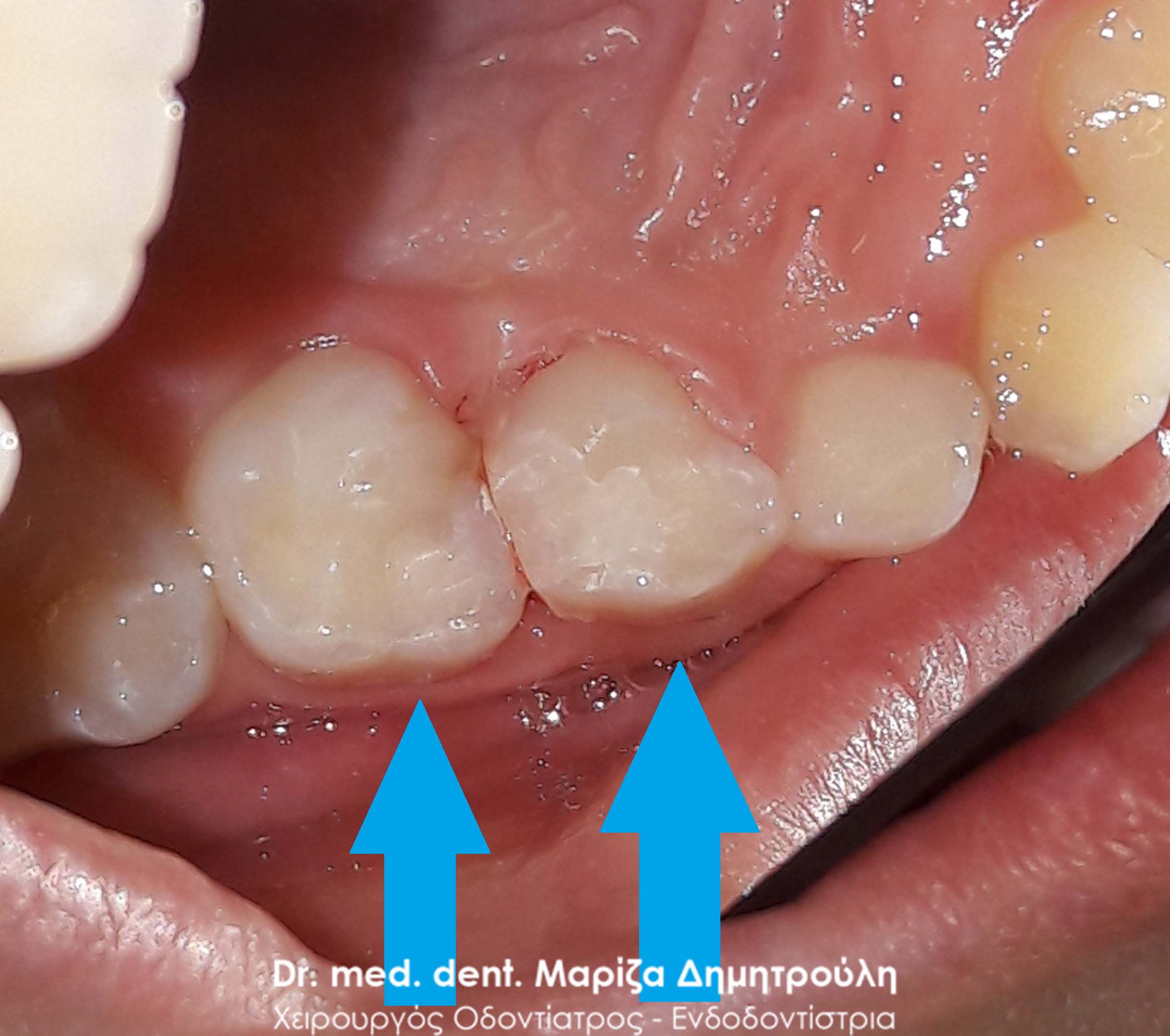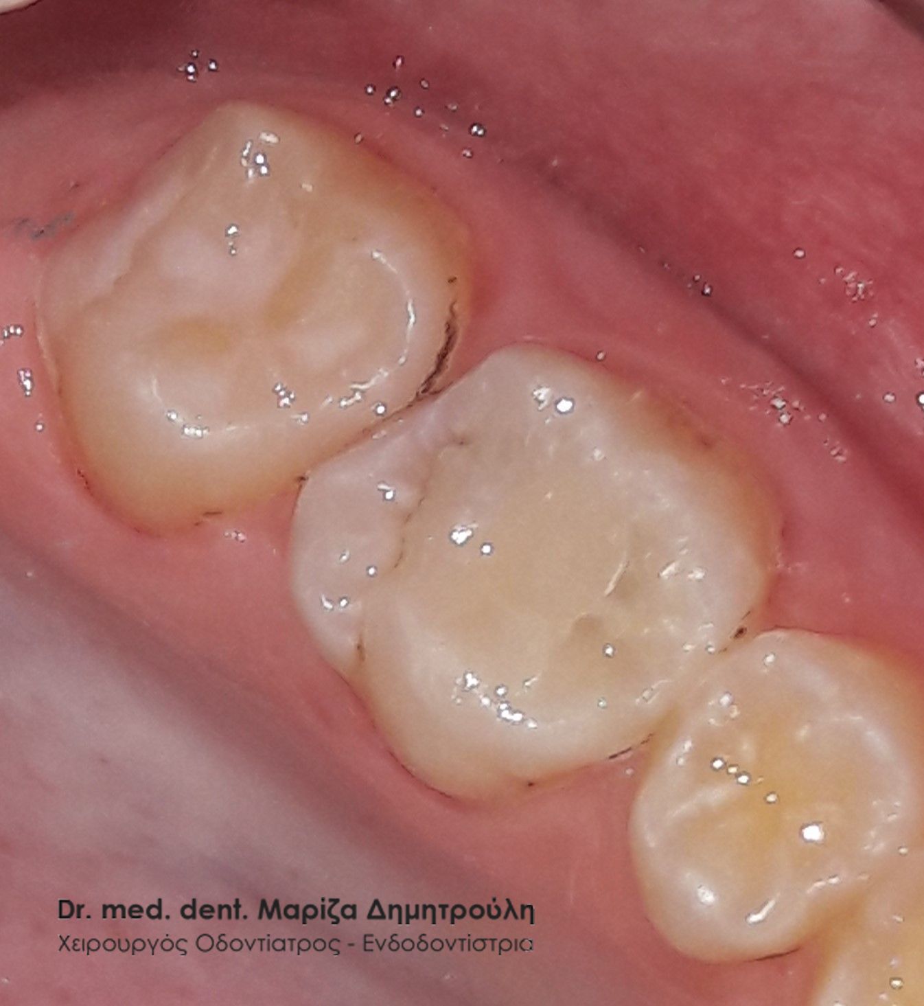 Στο συγκεκριμένο περιστατικό απουσιάζει η αρχική κλινική εικόνα των δύο δοντιών, τα οποία λόγω τερηδόνας αποκαταστάθηκαν με λευκά σφραγίσματα ρητίνης.