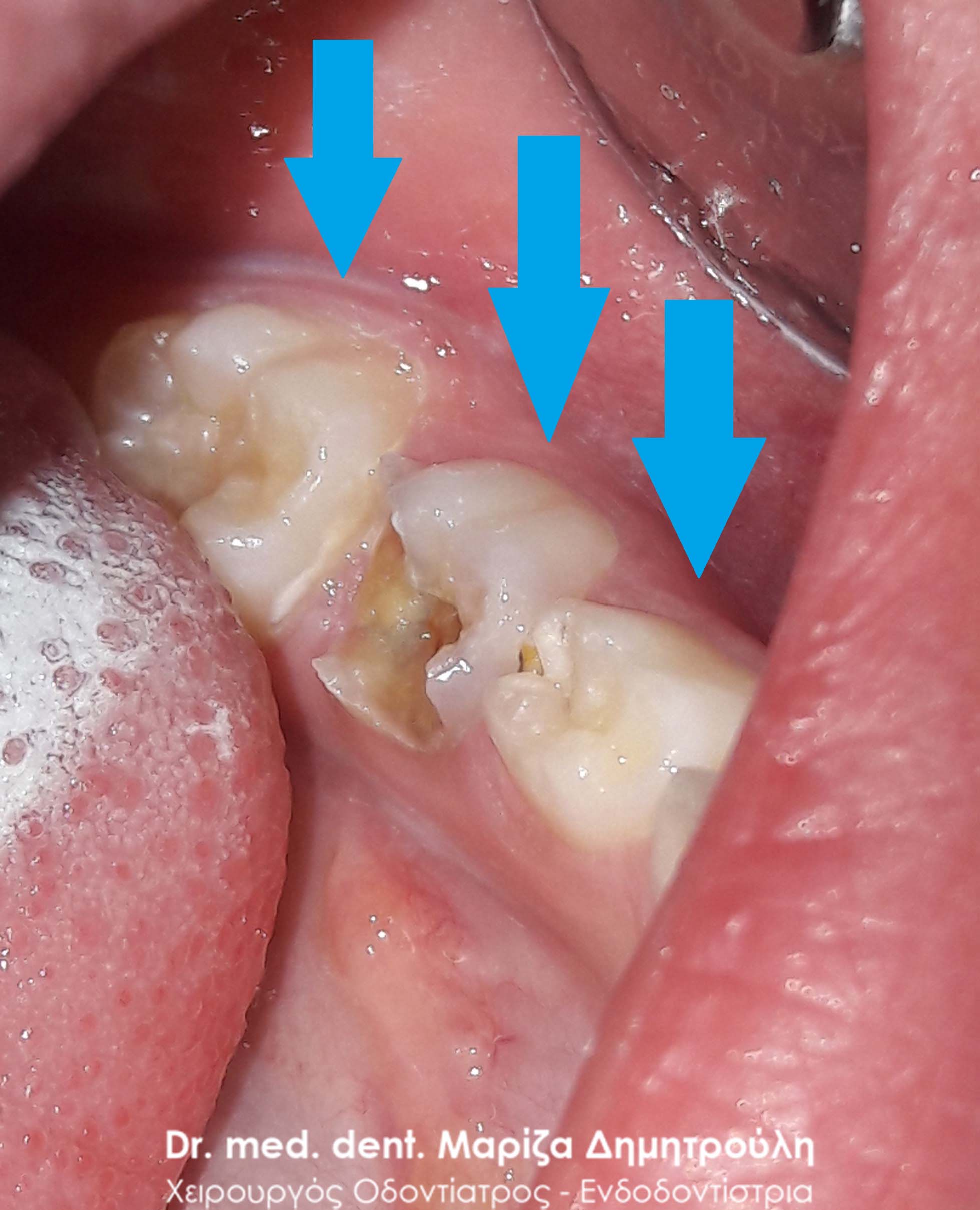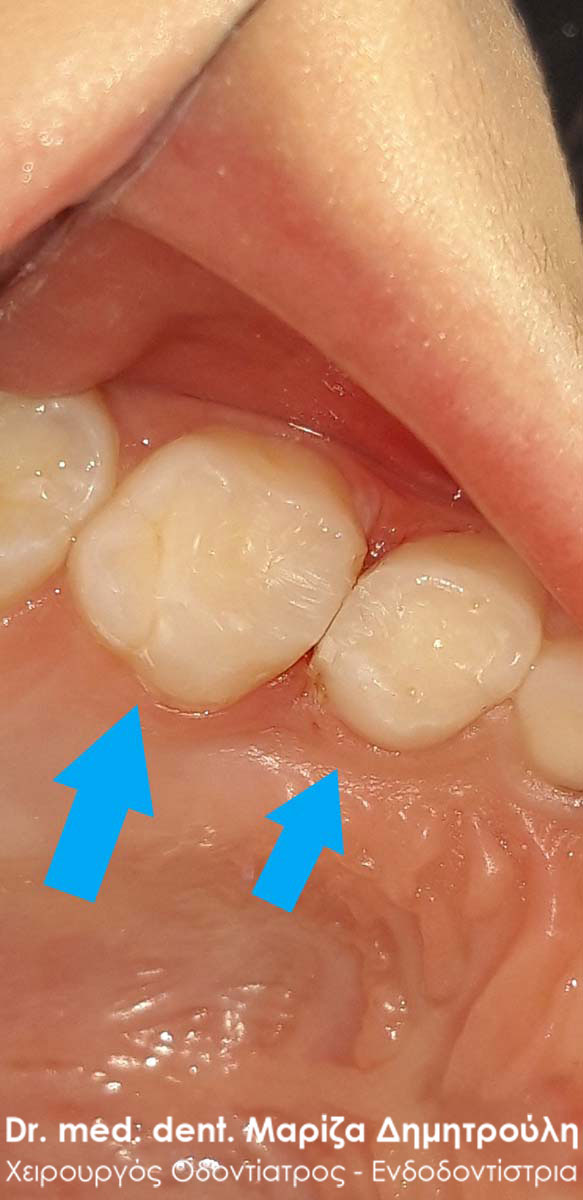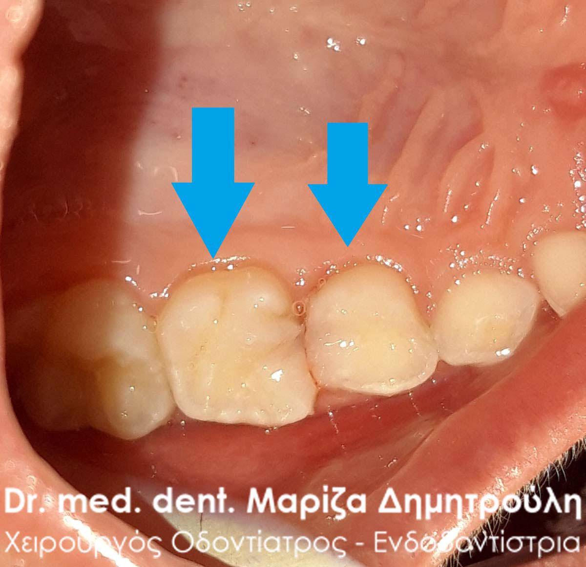 Στο συγκεκριμένο περιστατικό απουσιάζει η αρχική κλινική εικόνα των δύο δοντιών, τα οποία λόγω τερηδόνας αποκαταστάθηκαν με λευκά σφραγίσματα ρητίνης.