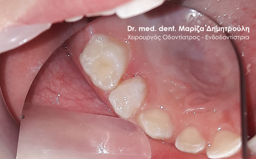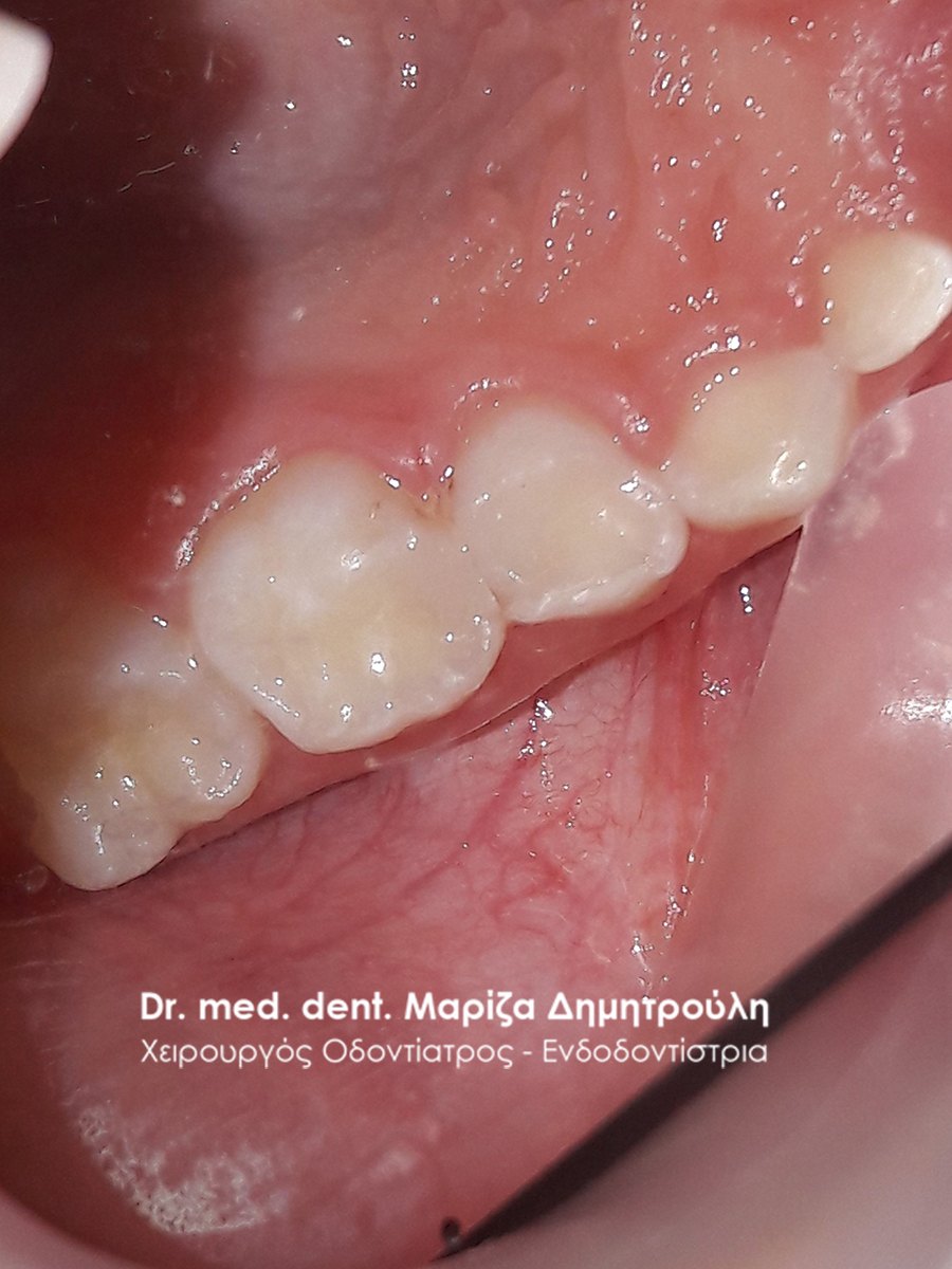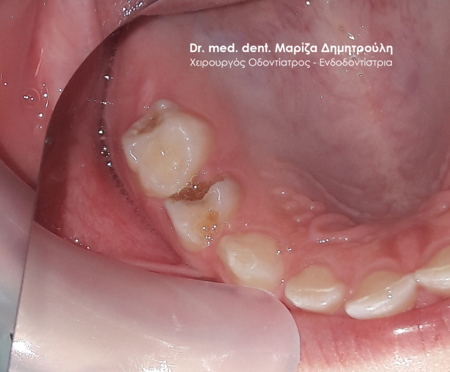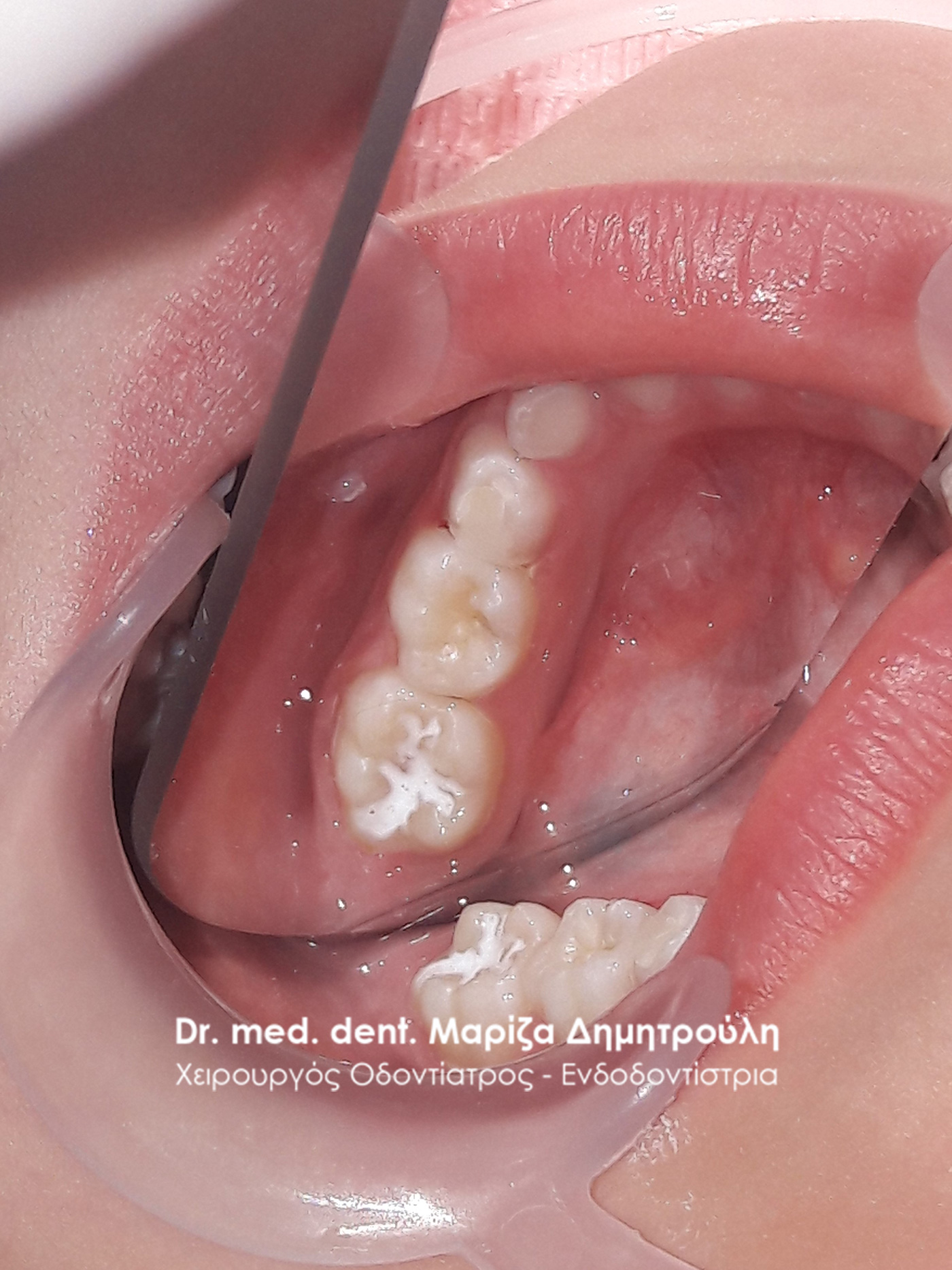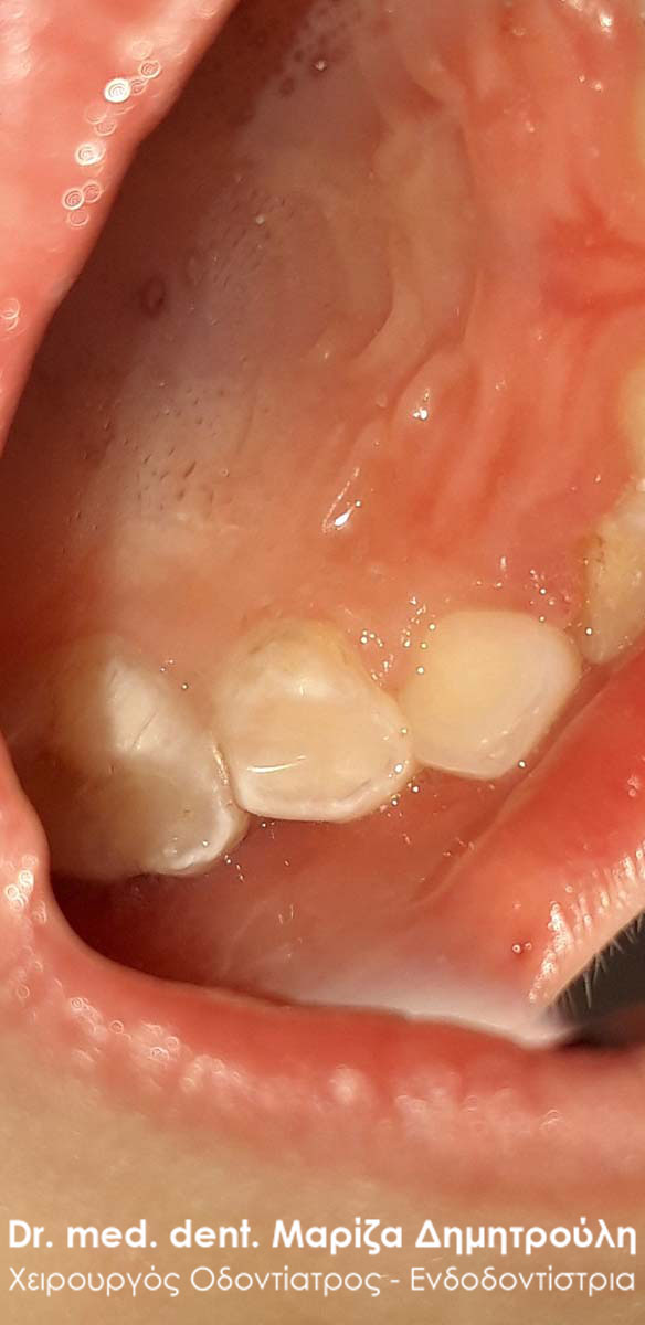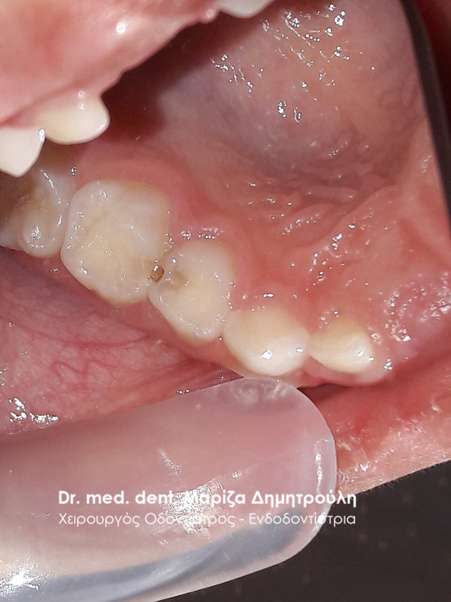 Η μικρή ασθενής πονούσε στην αριστερή πλευρά της άνω γνάθου. Μετά την κλινική εξέταση διαπιστώθηκε η ύπαρξη μιας μετρίου βαθμού τερηδονικής κοιλότητας. Μετά τον εκτροχισμό του δοντιού και την αφαίρεση της τερηδόνας το παιδικό δοντάκι αποκαταστάθηκε με λευκό σφράγισμα ρητίνης.