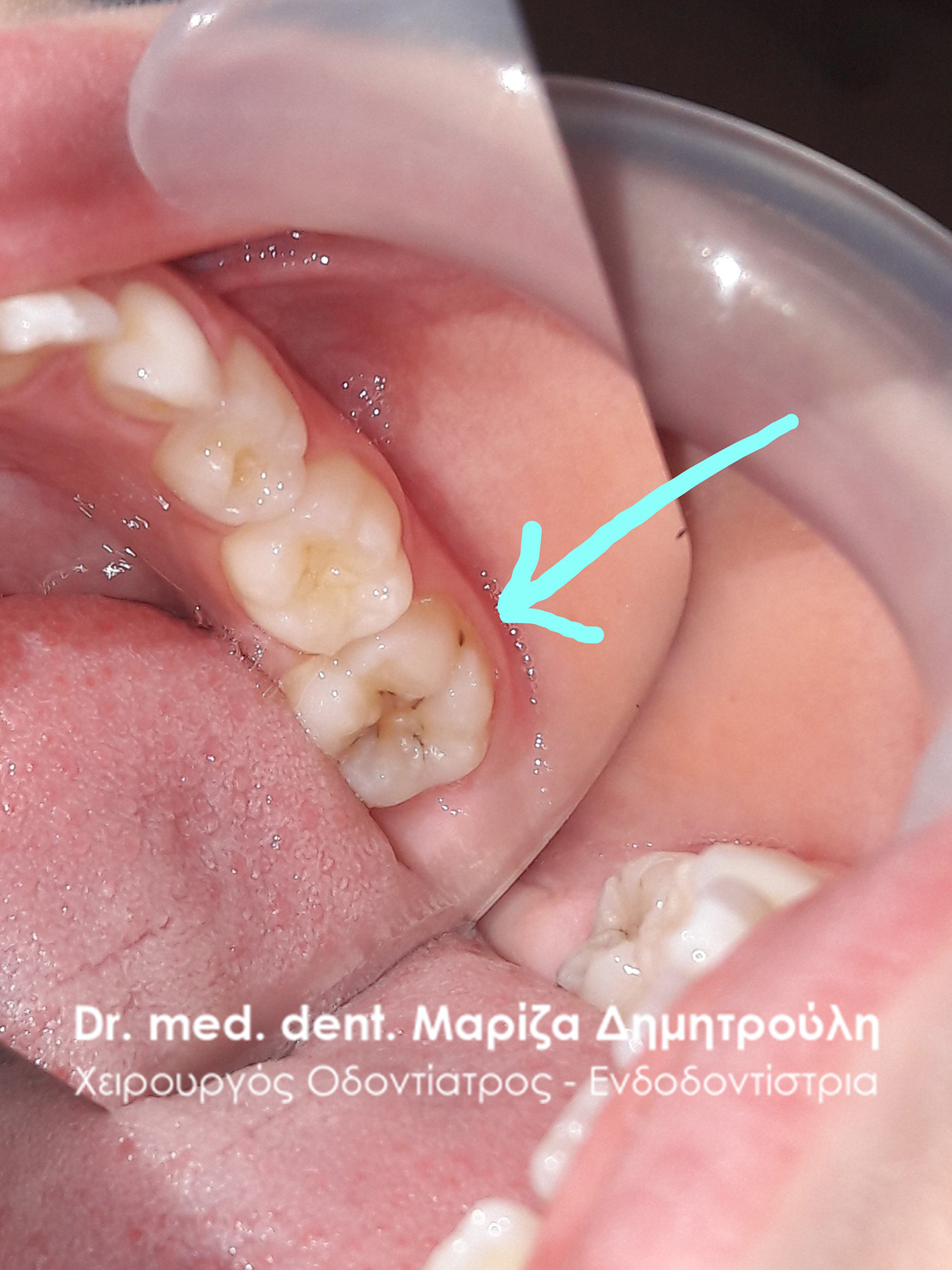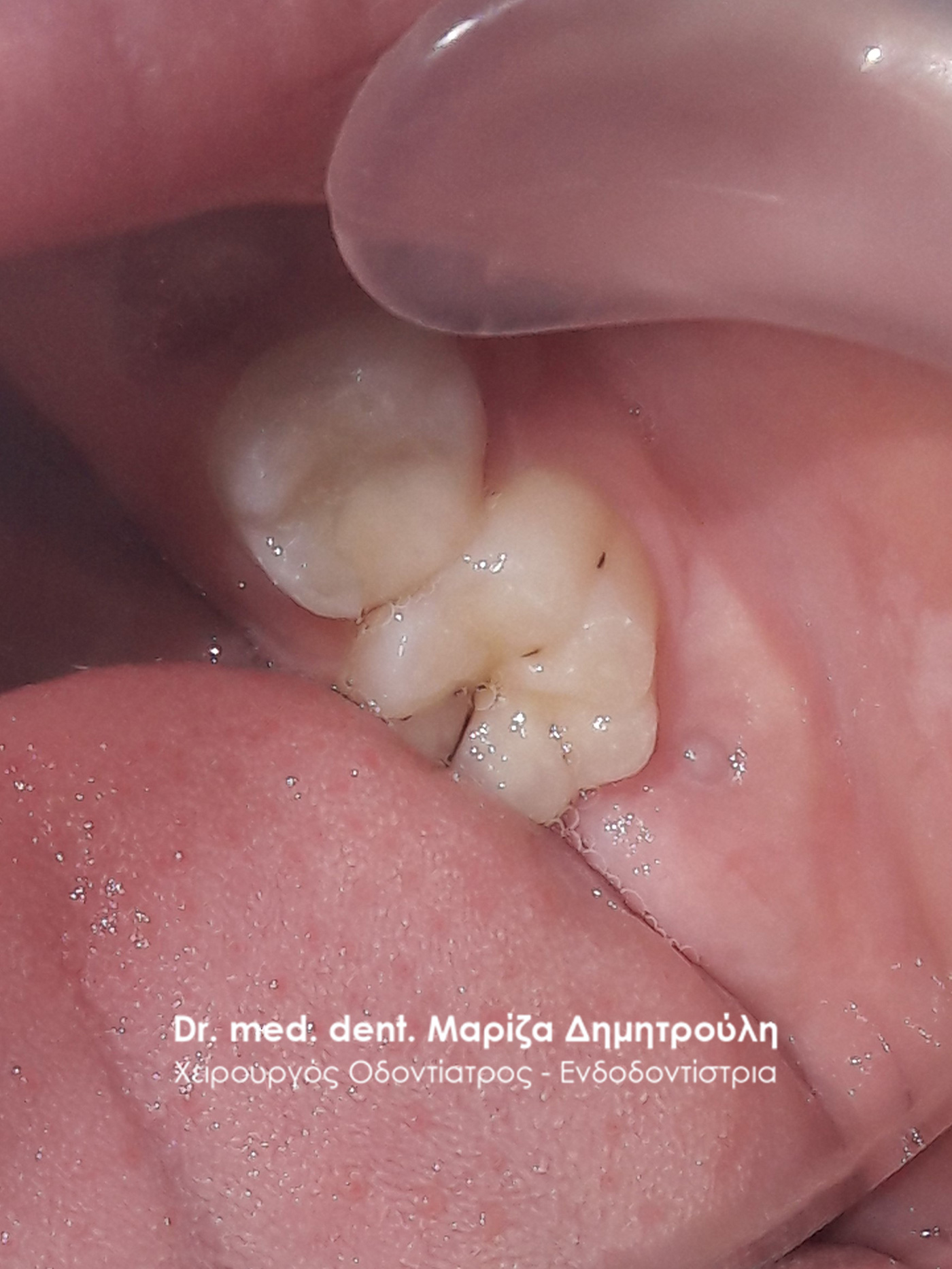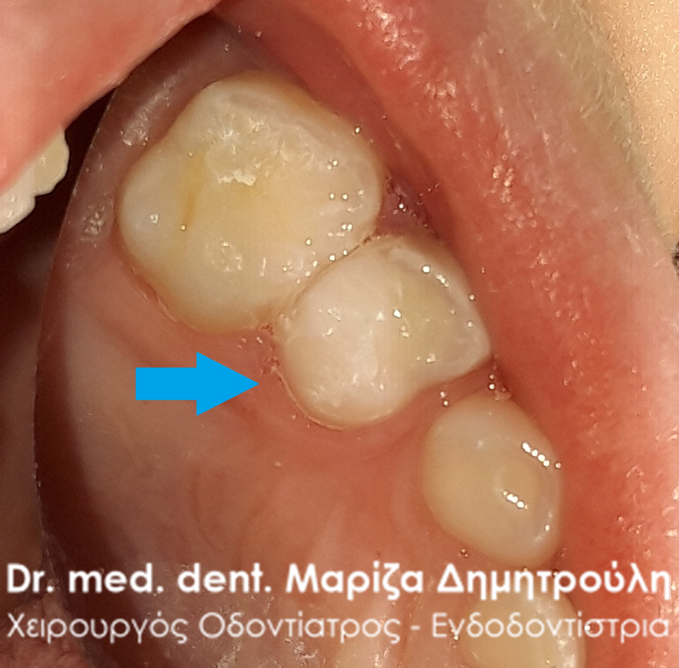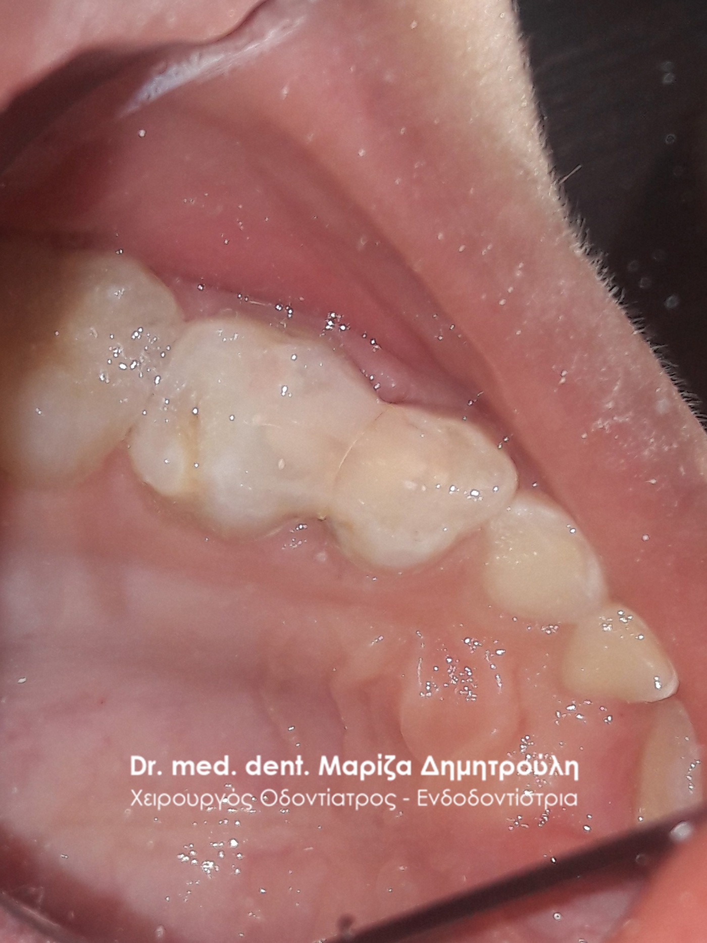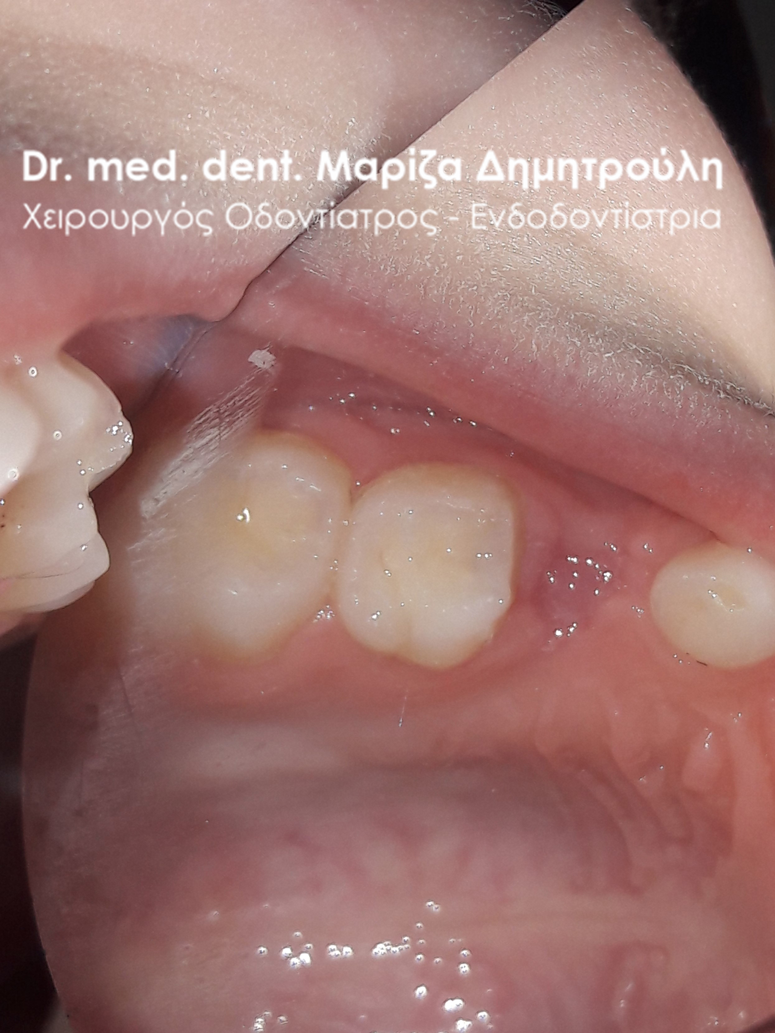 Η μικρή ασθενής πονούσε στην αριστερή πλευρά της άνω γνάθου. Μετά την κλινική εξέταση διαπιστώθηκε η ύπαρξη μιας μετρίου βαθμού τερηδονικής κοιλότητας. Μετά τον εκτροχισμό του δοντιού και την αφαίρεση της τερηδόνας το παιδικό δοντάκι αποκαταστάθηκε με λευκό σφράγισμα ρητίνης.