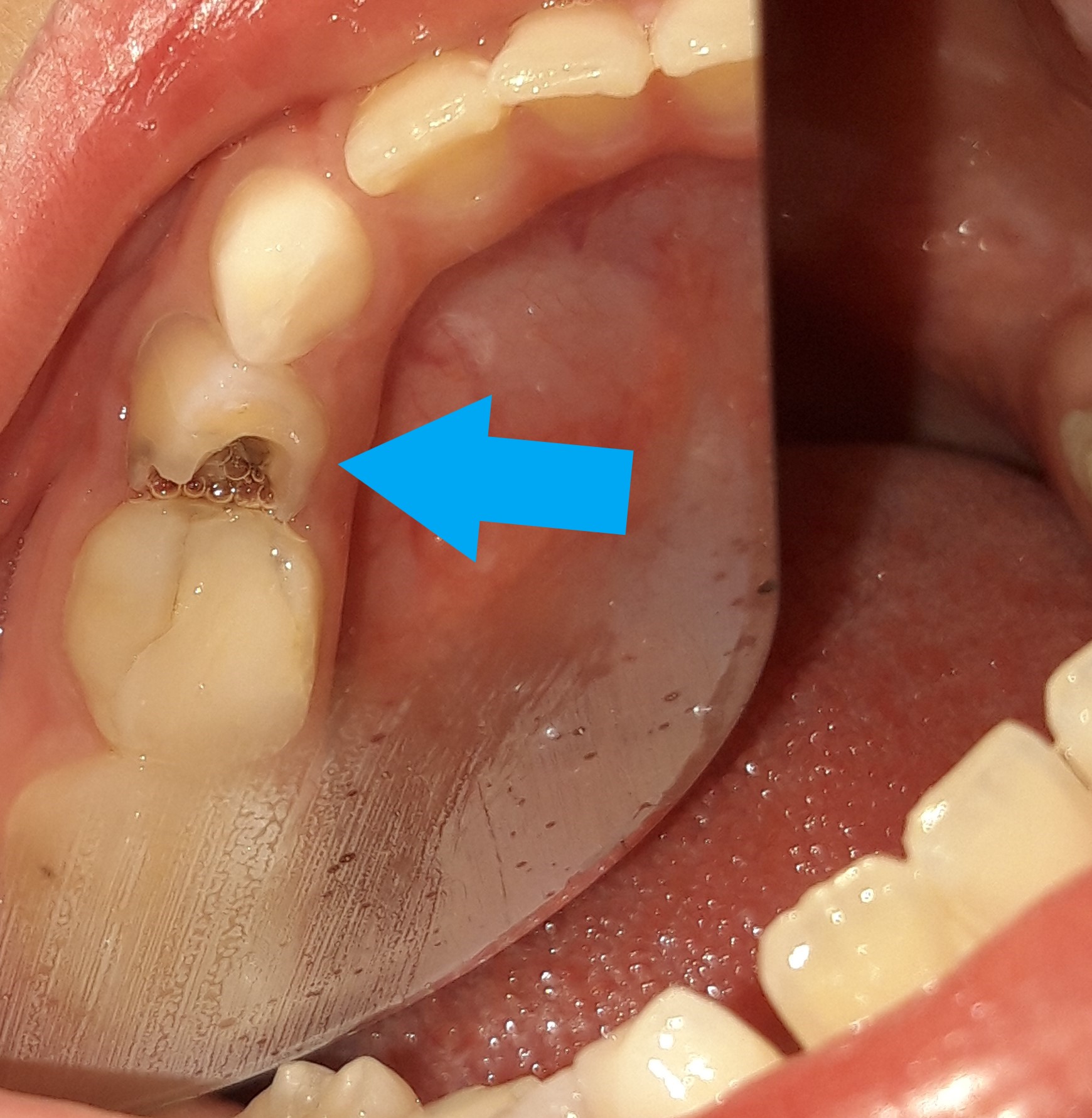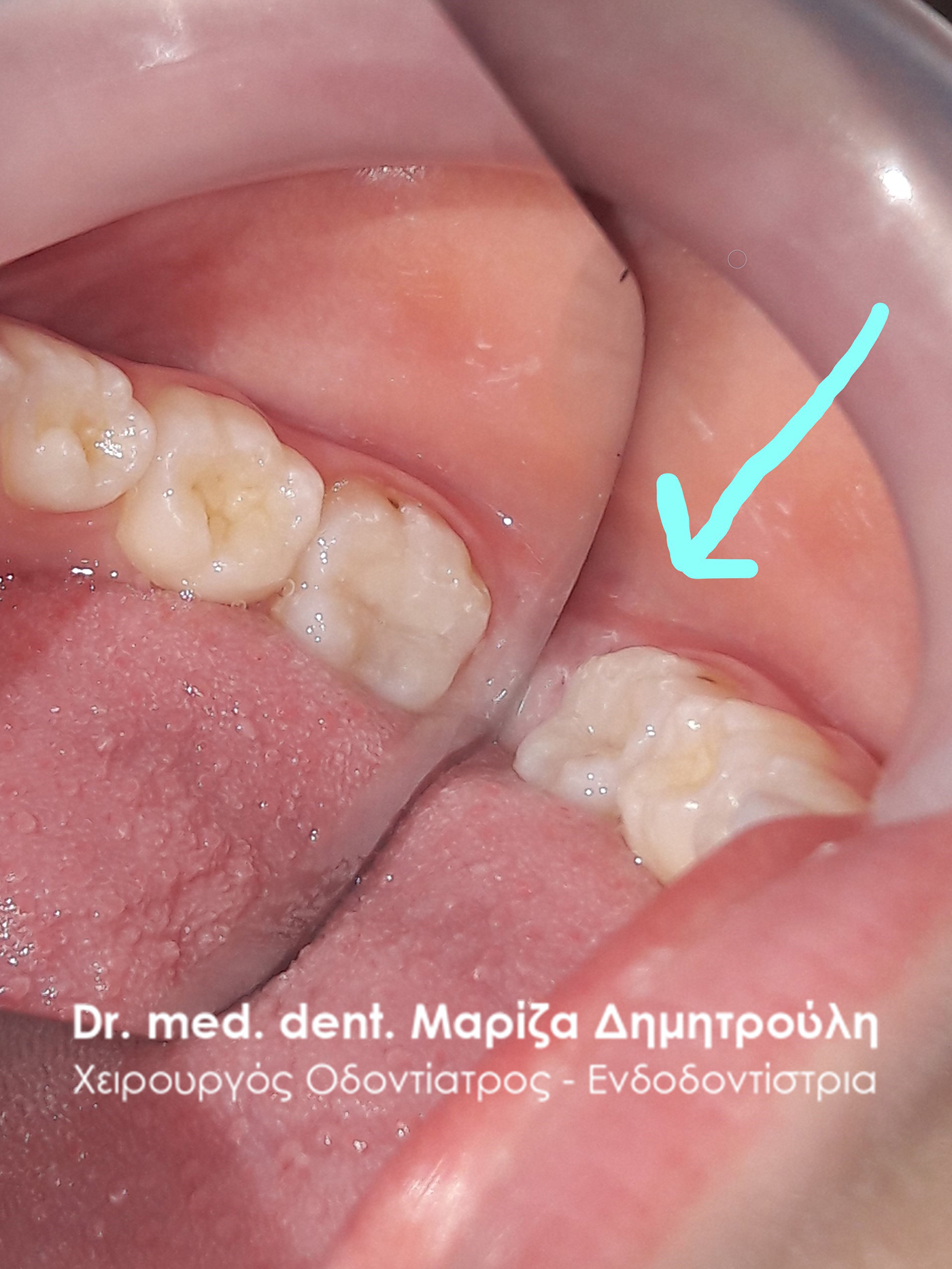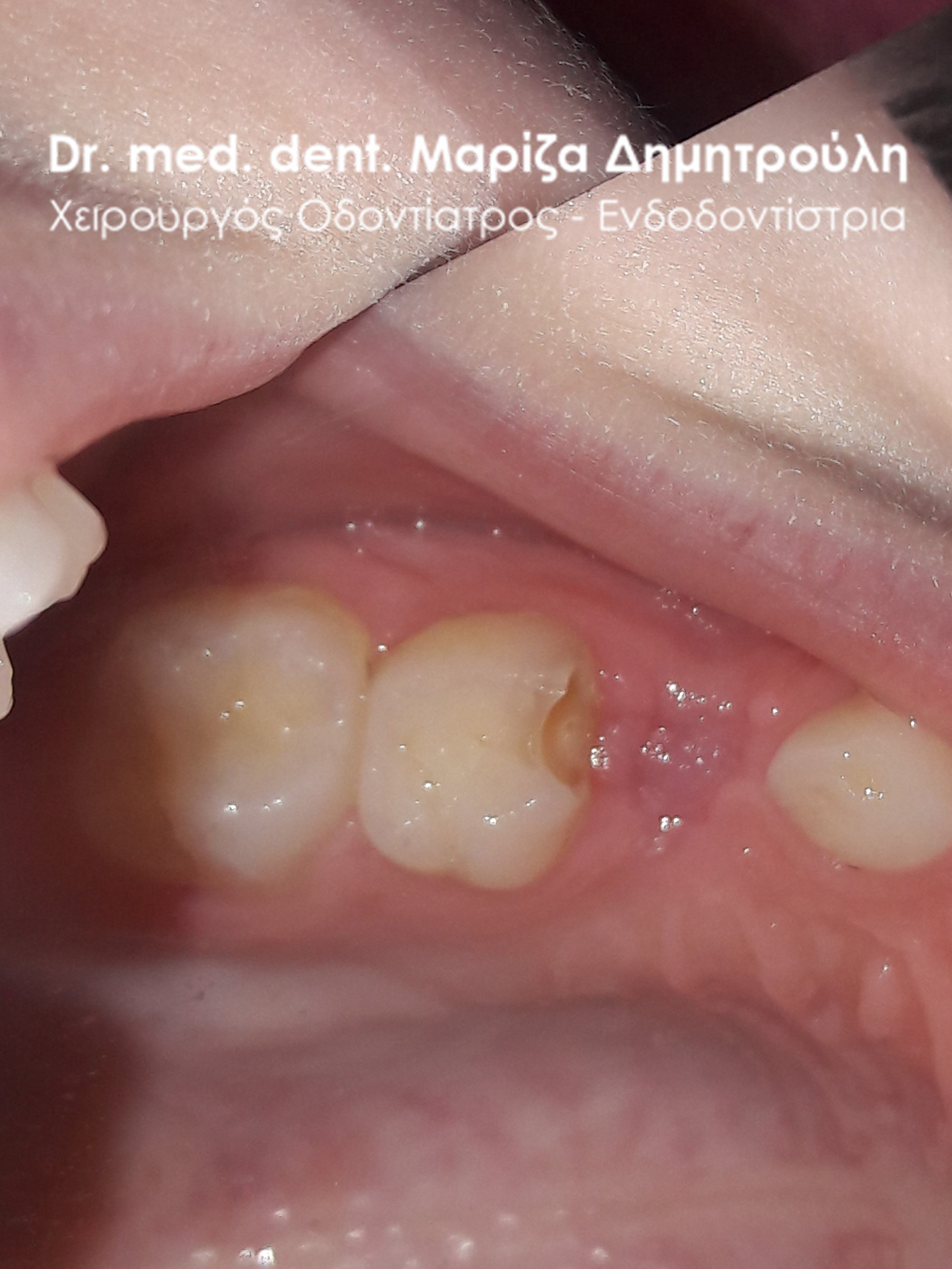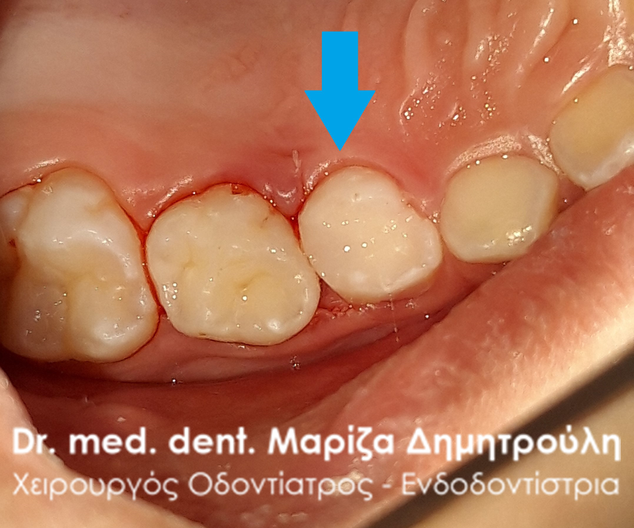 Το οδοντικό έλλειμμα στη μικρή ασθενή είναι πολύ μεγάλο και την πονά. Στο κορίτσι χορηγήθηκε τοπική αναισθησία για την εξασφάλιση μιας ανώδυνης οδοντιατρικής θεραπείας. Το δόντι δεν πονά πλέον την μικρή ασθενή, η οποία μπορεί άφοβα να τρώει από την κάτω δεξιά πλευρά χωρίς παράπονα.