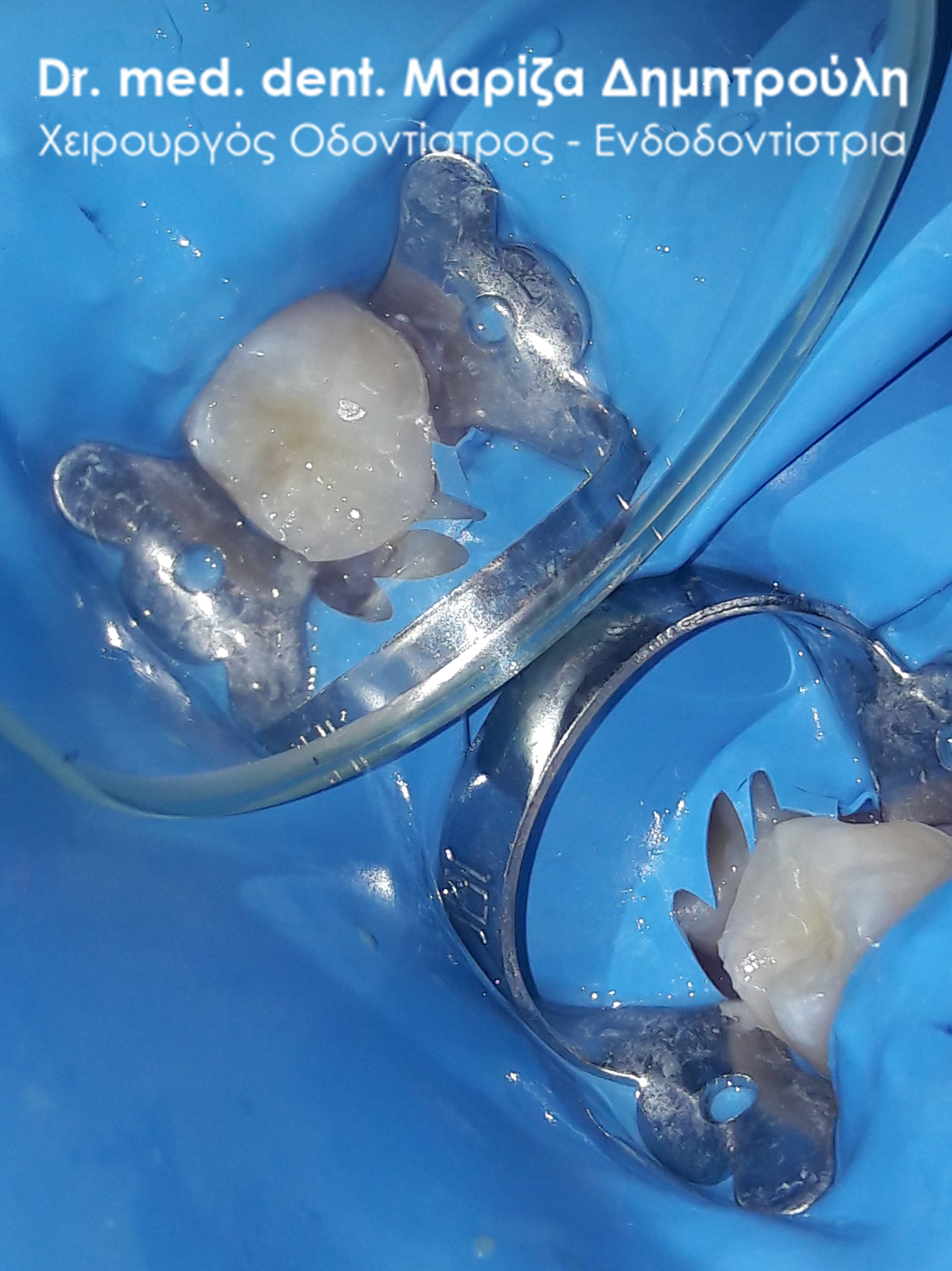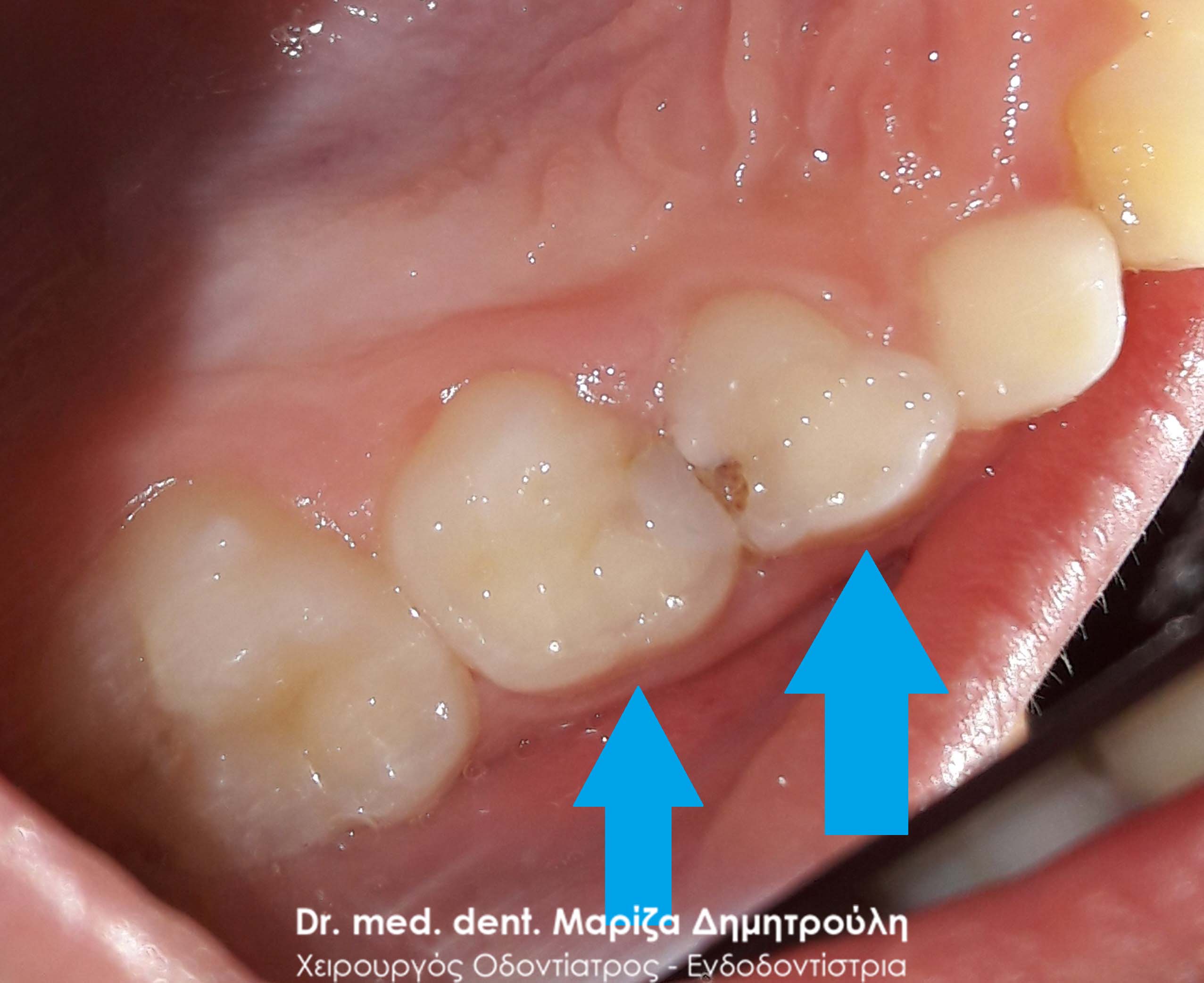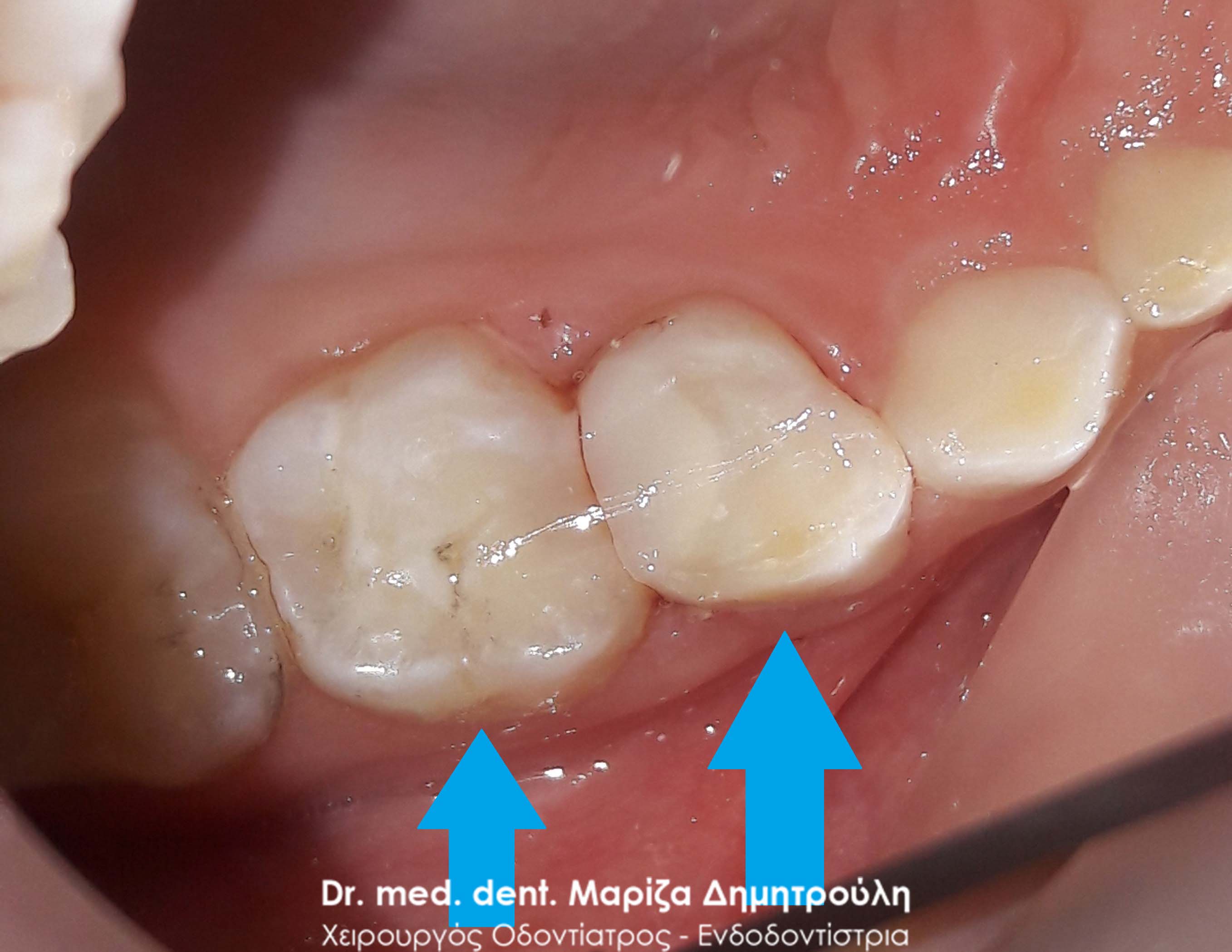 Στο συγκεκριμένο περιστατικό είναι διαθέσιμη μόνο η τελική εικόνα αποκατάστασης των δύο παιδικών δοντιών με λευκά σφραγίσματα ρητίνης. Στον πρώτο παιδικό γομφίο πραγματοποιήθηκε και πολφοτομή του δοντιού, λόγω βαθιάς έκτασης της τερηδόνας στο ύψος του νεύρου του δοντιού.