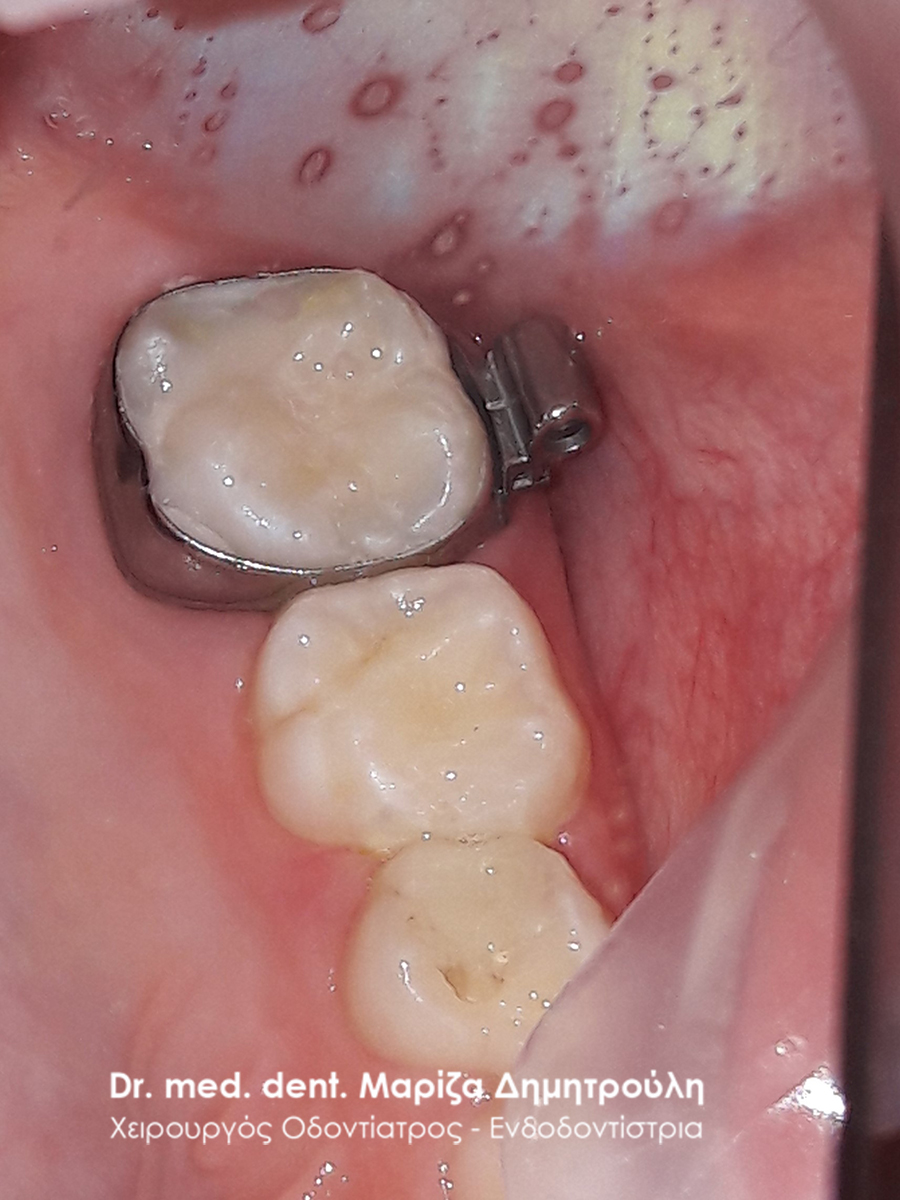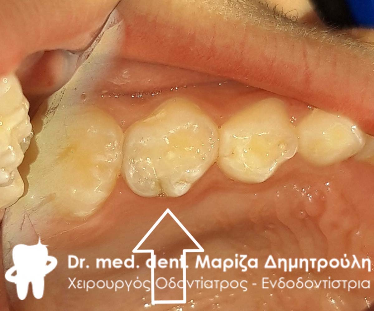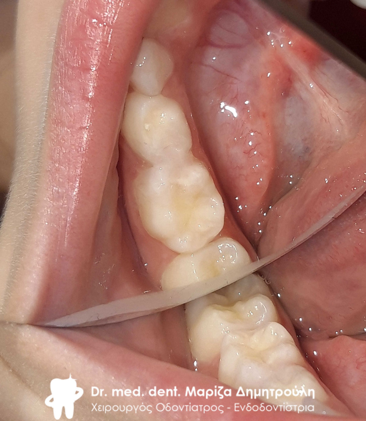 Η μικρή κυρία είχε μία μεσαίου βαθμού τερηδονικής κοιλότητας στον πρώτο μόνιμο γομφίο στη δεξιά πλευρά της άνω γνάθου. Στο συγκεκριμένο δόντι έχει τοποθετηθεί από τον ορθοδοντικό ειδικός ορθοδοντικός δακτύλιος και είναι απαραίτητη η διατήρηση του δοντιού σε υγιή κατάσταση μέσα στο στόμα. Στο συγκεκριμένο κορίτσι αφότου αφαιρέθηκε η τερηδόνα πραγματοποιήθηκε στην κοιλότητα λευκό σφράγισμα ρητίνης για την αποκατάσταση της βλάβης.