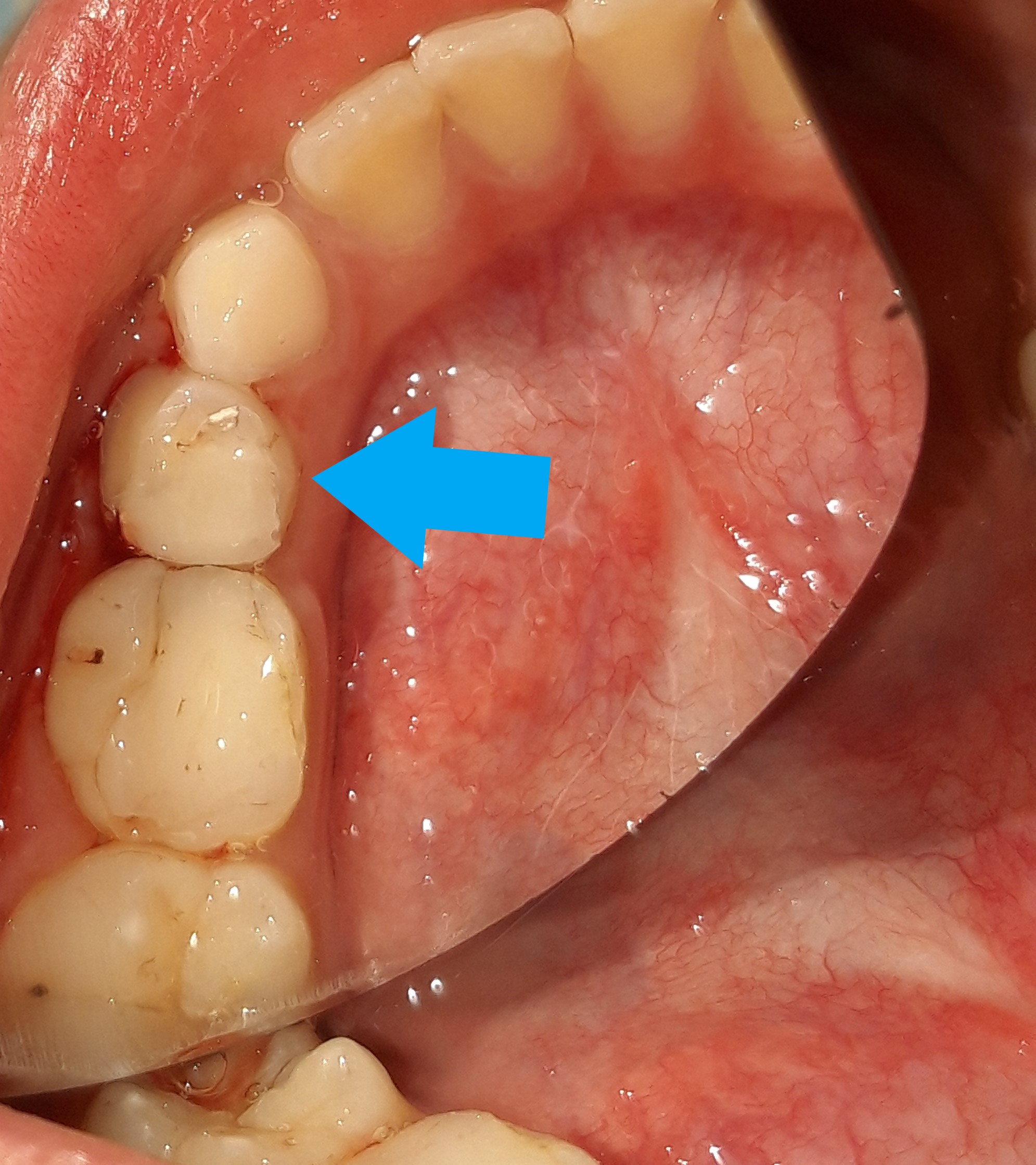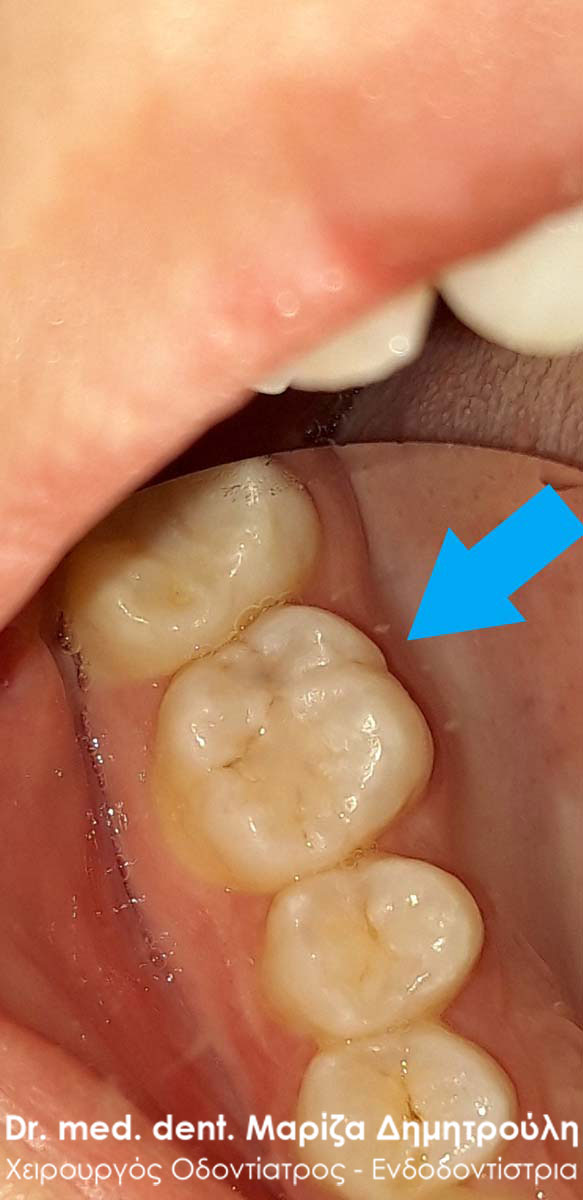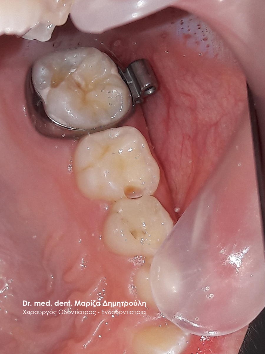 Ο συγκεκριμένος ασθενής προσήλθε στο ιατρείο, καθώς πονούσε στην αριστερή πλευρά της κάτω γνάθου κατά τη μάσηση. Μετά την κλινική εξέταση διαπιστώθηκε μία μικρή τερηδονική κοιλότητα στα όρια των δύο τελευταίων κάτω δοντιών, η οποία αποκαταστάθηκε με λευκό σφράγισμα ρητίνης.