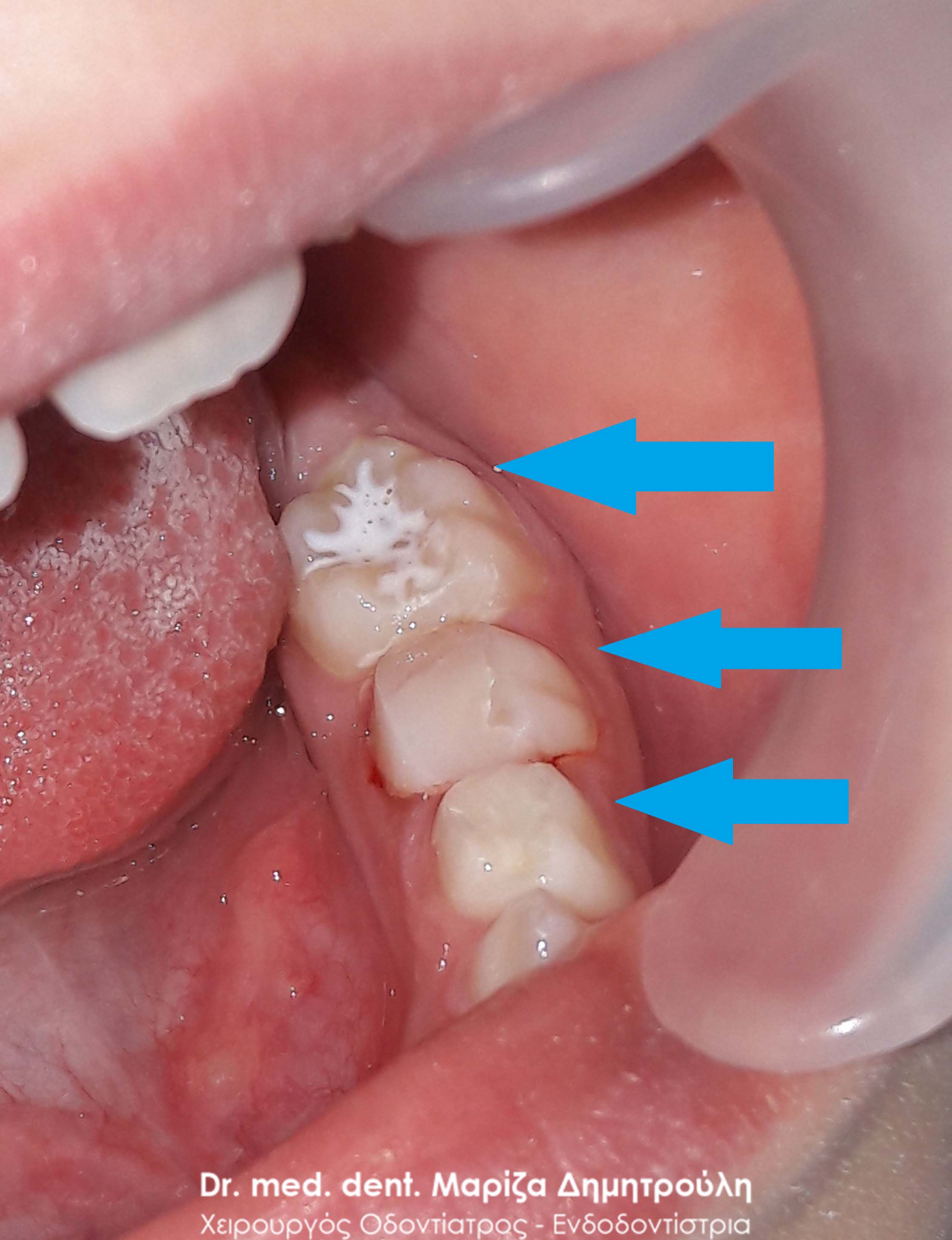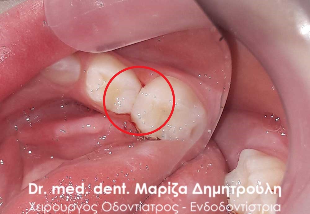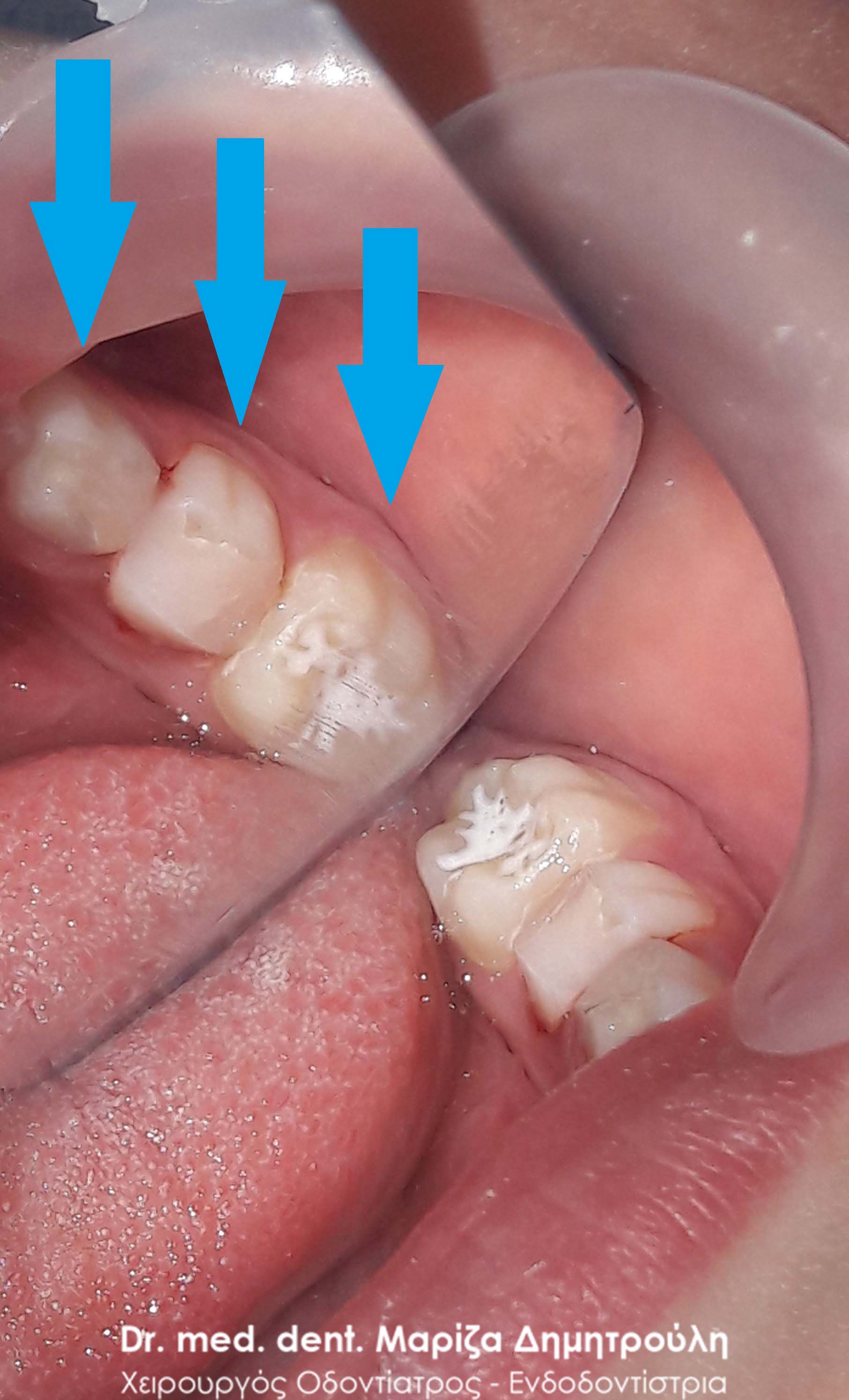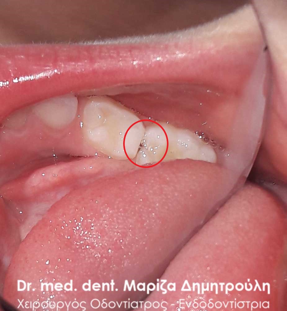 Το συγκεκριμένο παιδάκι παραπονιόταν στη μητέρα του οτι πονούσε όταν έτρωγε στην αριστερή πλευρά της άνω γνάθου. Μετά την κλινική εξέταση διαπιστώθηκε η ύπαρξη τερηδόνας σε δύο παιδικά δοντάκια χωρίς να έχει δημιουργηθεί τρύπα, ώστε να είναι ορατή η αιτία πόνου του παιδιού. Σε πολλά περιστατικά, ακόμη και σε ενήλικες, συμβαίνει η τερηδόνα να δρα και να “τρώει” το δόντι χωρίς όμως να καταστρέφεται η αδαμαντίνη (επιφανειακό στρώμα του δοντιού).