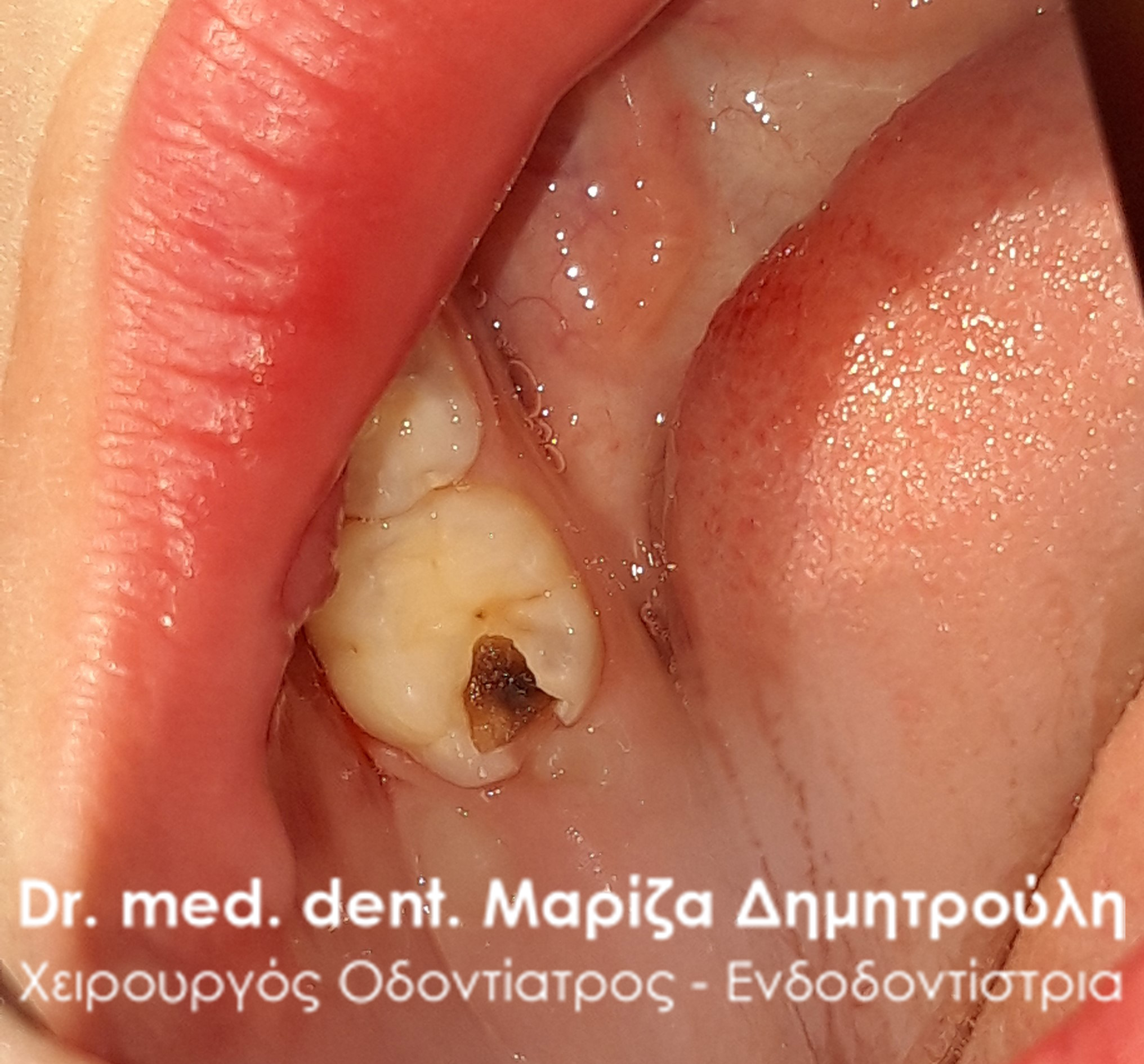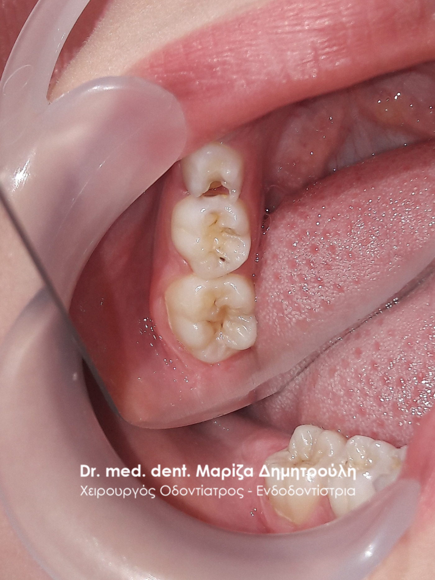 Η μικρή ασθενής ταλαιπωρείται από πόνο στην κάτω αριστερή μεριά της κάτω γνάθου. Μετά την κλινική εξέταση διαπιστώθηκε η ύπαρξη μιας μεγάλης τερηδονικής κοιλότητας στο κάτω δεύτερο αριστερό νεογιλό γομφίο και μίας μικρότερης στον αριστερό κάτω νεογιλό γομφίο