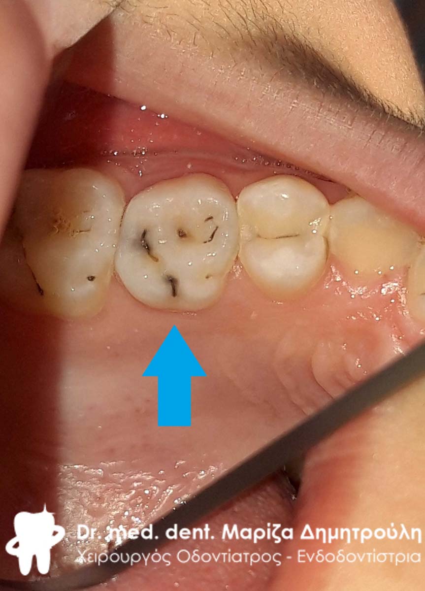 Ο συγκεκριμένος ασθενής πονούσε περιοδικά στη δεξιά πλευρά της άνω γνάθου. Μετά την κλινική επισκόπηση αποκαλύφθηκε στον πρώτο μόνιμο γομφίου του αγοριού μία μετρίου βαθμού τερηδονική αλλοίωση,η οποία όπως φαίνεται και στη φωτογραφία “μαύριζε”. Το δόντι αποκαταστάθηκε με λευκό σφράγισμα ρητίνης.