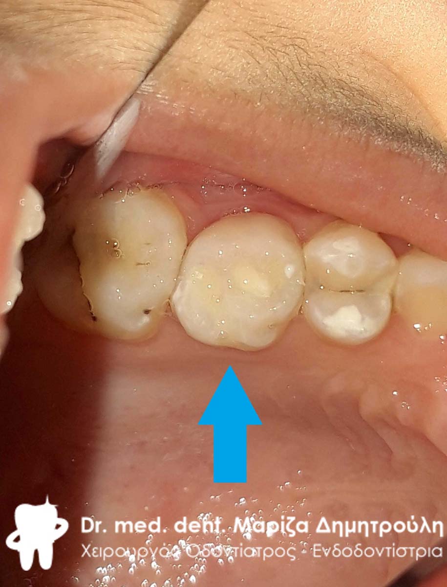 Το αγοράκι ηλικίας 8 ετών παραπονούνταν στη μητέρα οτι πονούσε όταν έτρωγε. Η κλινική εξέταση αποκάλυψε την ύπαρξη μιας κοιλότητας στο αριστερό πρώτο γομφίο της άνω γνάθου. Μετά τη διάνοιξη του δοντιού και την αφαίρεση της τερηδόνας το δόντι αποκαταστάθηκε με λευκό σφράγισμα σύνθετης ρητίνης.