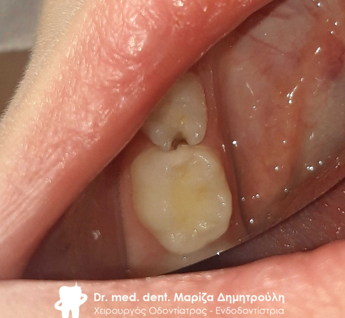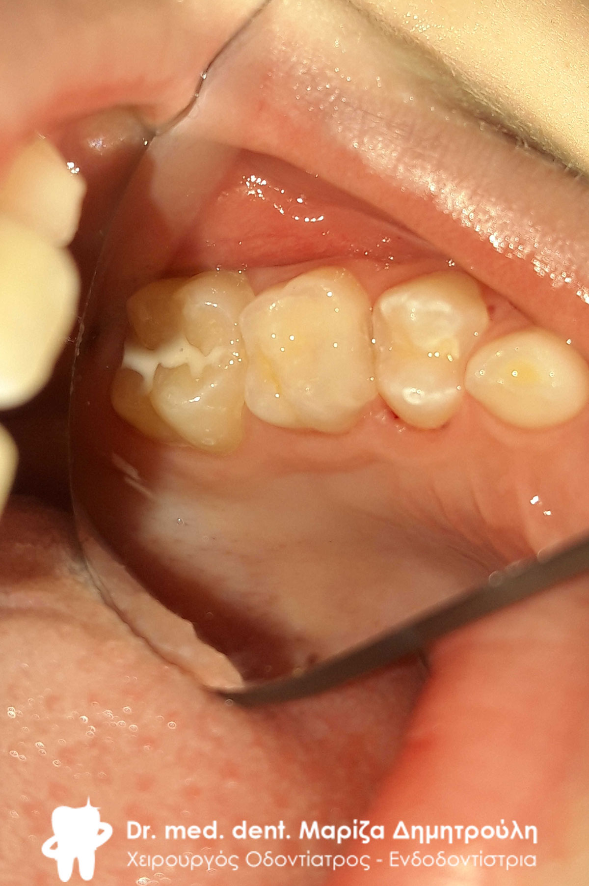Κορίτσι ηλικίας 8 ετών πονούσε κατά τη μάσηση στην αριστερή πλευρά της άνω γνάθου. Η κλινική εξέταση αποκάλυψε την ύπαρξη μιας βαθιάς τερηδόνας σε ένα από τα πίσω παιδικά δοντάκια. Μετά τον εκτροχισμό του δοντιού και την απομάκρυνση της τερηδόνας, το οδοντικό έλλειμμα αποκαταστάθηκε με λευκό σφράγισμα σύνθετης ρητίνης.
