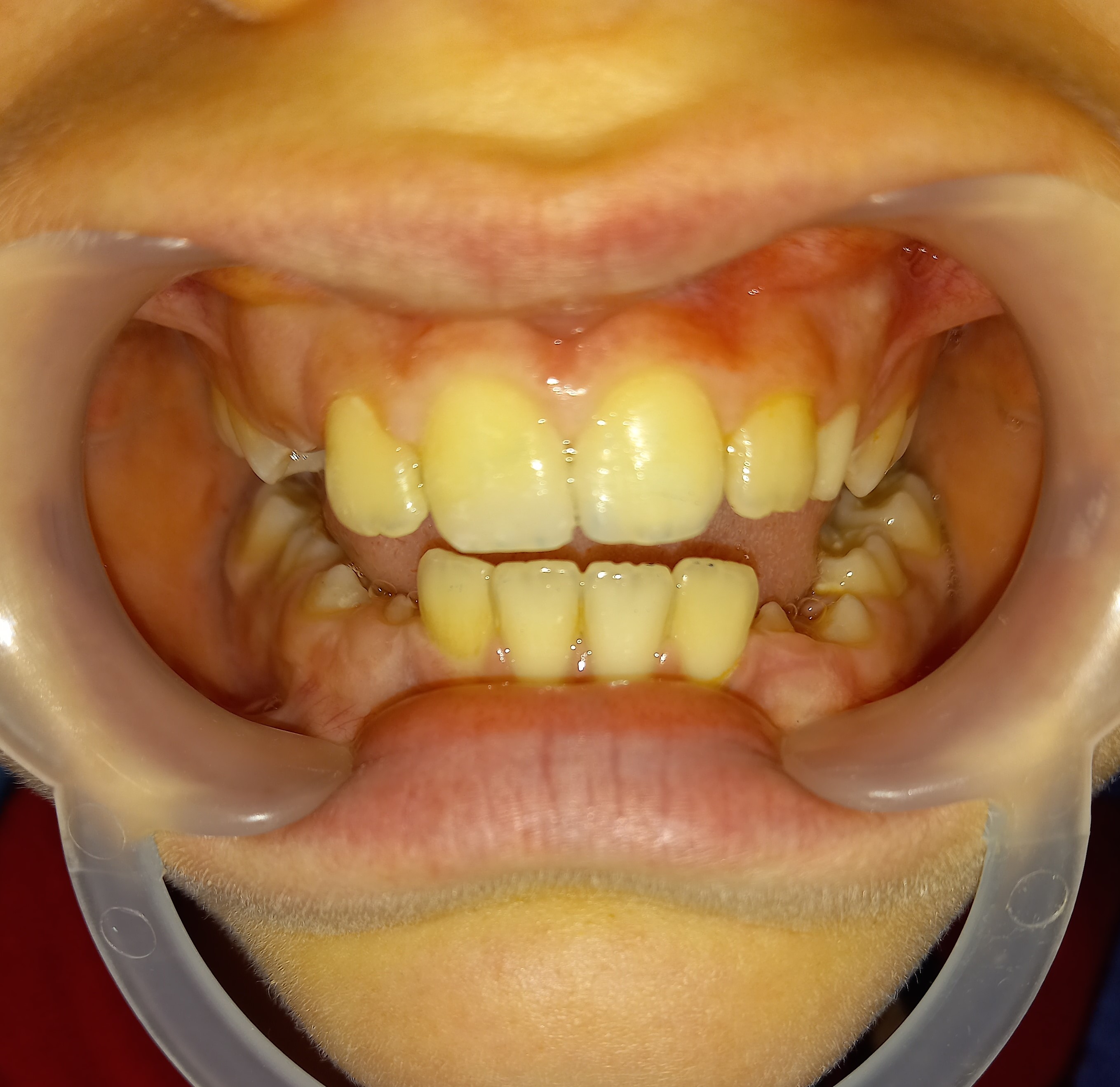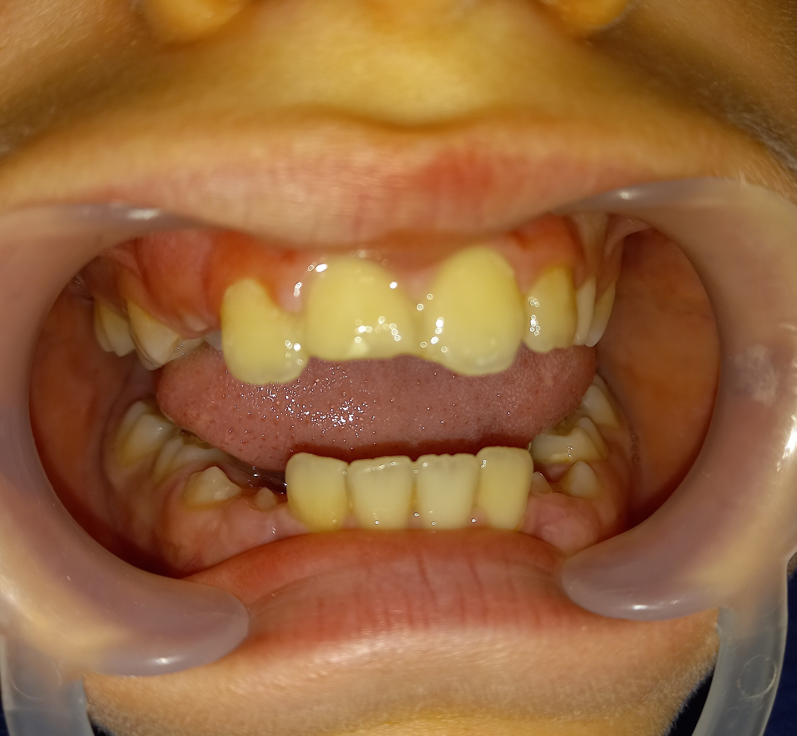 Οι δύο κεντρικοί τομείς στον μικρό ασθενή προεξείχαν έντονα. Οι γονείς του είχαν ενημερωθεί οτι θα έπρεπε να επισκεφτούν ορθοδοντικό, παρόλα αυτά το αμέλησαν. Αποτέλεσμα ήταν το παιδί να χτυπήσει τα δύο κεντρικά δόντια του και να τα σπάσει. Είναι σημαντικό οποιαδήποτε έκτοπη θέση ενός ή περισσότερων δοντιών να διορθώνεται με την άμεση θεραπεία στον ορθοδοντικό. Διαφορετικά προκύπτουν δυσάρεστα αποτελέσματα με μικρό ή μεγάλο αντίκτυπο στην υγεία των δοντιών. Ο συγκεκριμένος ασθενής ήταν τυχερός γιατί δεν επηρεάστηκε το νεύρο / ζωτικότητα του δοντιού.