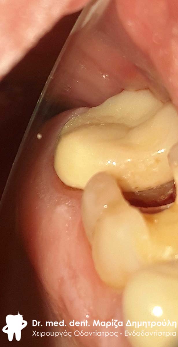 Ο κάτω δεξιός δεύτερος γομφίος αποκαταστάθηκε πριν ένα μήνα με σφράγισμα ρητίνης. Η ασθενής επισκέφτηκε το ιατρείο γιατί το δόντι την πονούσε συνεχόμενα μετά τη δημιουργία του σφραγίσματος. Μετά τη χορήγηση τοπικής αναισθησίας τροχίστηκε το παλιό λευκό σφράγισμα και διαπιστώθηκε οτι το υλικό του σφραγίσματος εκτεινόταν στο ύψος του νεύρου του δοντιού. Το γεγονός αυτό προκαλούσε τα συμπτώματα πόνου στην ασθενή. Στο δόντι τοποθετήθηκε ειδικό υλικό έμφραξης με καταπραϋντική και επουλωτική ιδιότητα. Σε δεύτερο ραντεβού εφόσον η ασθενής πλέον δεν πονούσε, το δόντι αποκαταστάθηκε με το νέο τελικό λευκό σφράγισμα σύνθετης ρητίνης.