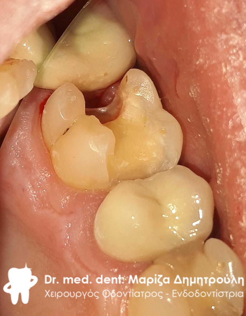 Ο ασθενής συνηδειτοποίησε οτι έσπασε ένα κομμάτι από το παλιό σφράγισμα αμαλγάματος που είχε στο δεξιό κάτω πρώτο γομφίο. Η κλινική εξέταση αποκάλυψε οτι μαζί με κομμάτι του αμαλγάματος έσπασε επιπρόσθετα και κομμάτι του δοντιού. Η πρώτη φωτογραφία δείχνει την εικόνα του δοντιού αμέσως μετά την αφαίρεση του εναπομείναντος αμαλγάματος και τον εκτροχισμό των τερηδονισμένων οδοντικών ιστών. Στον ασθενή εξηγήθηκε οτι το έλλειμμα ήταν μεγάλο και για την καλύτερη προστασία του δοντιού θα έπρεπε να κατασκεαστεί στεφάνη / θήκη δοντιού. Ο ασθενής προτίμησε για οικονομικούς λόγους την αποκατάσταση του δοντιού με λευκό σφράγισμα σύνθετης ρητίνης.