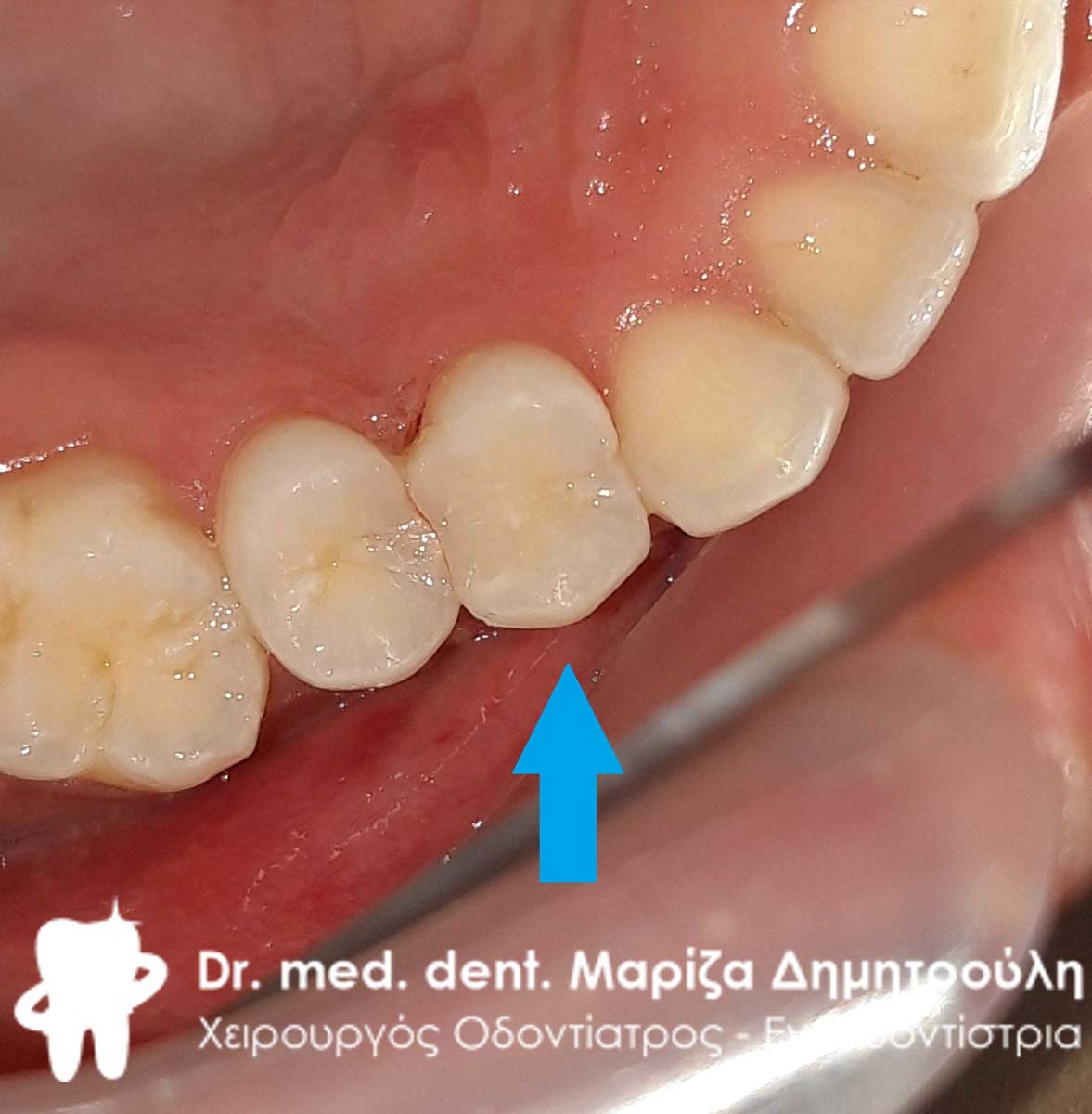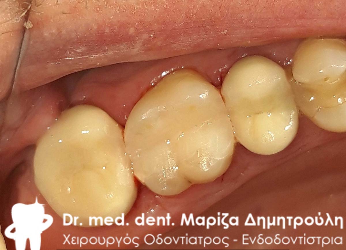 Ο ασθενής παραπονιέται οτι ανάμεσα στον προγόμφιο και τη θήκη δοντιού στον πρώτο γομφίο μαζεύονται τροφές. Απαραίτητο για να λυθεί το πρόβλημα αυτό ήταν η αντικατάσταση του παλιού λευκού σφραγίσματος στον προγόμφιο με νέο λευκό σφράγισμα. Μετά την αντικατάσταση του σφραγίσματος υπήρχε άψογο σημείο επαφής μεταξύ του δοντιού και της θήκης, όπως φαίνεται άλλωστε και στην τελική φωτογραφία.