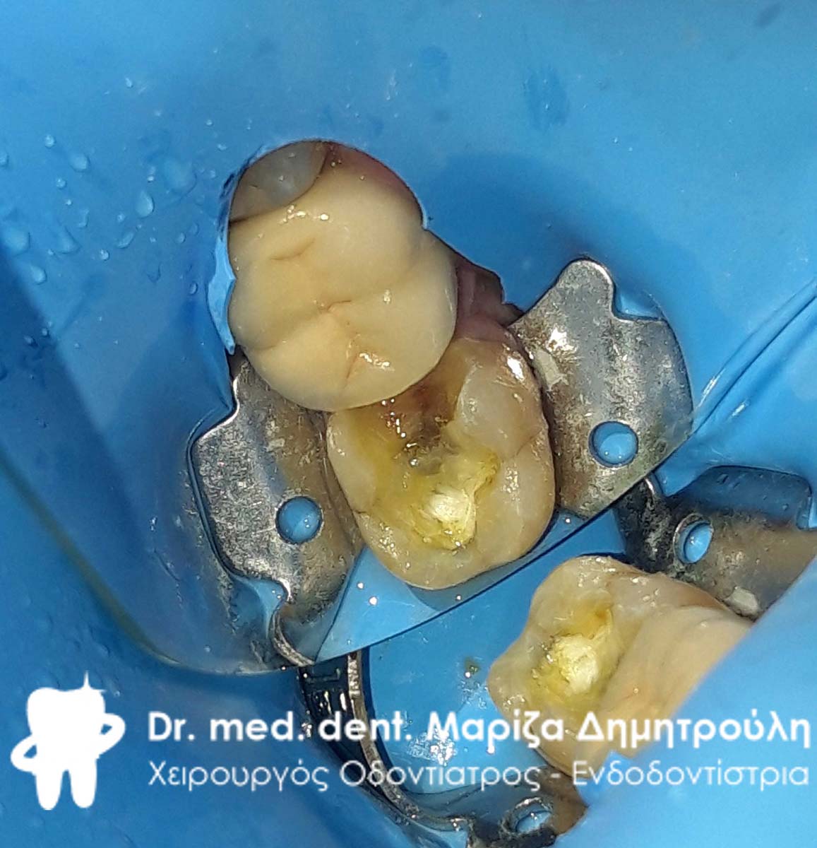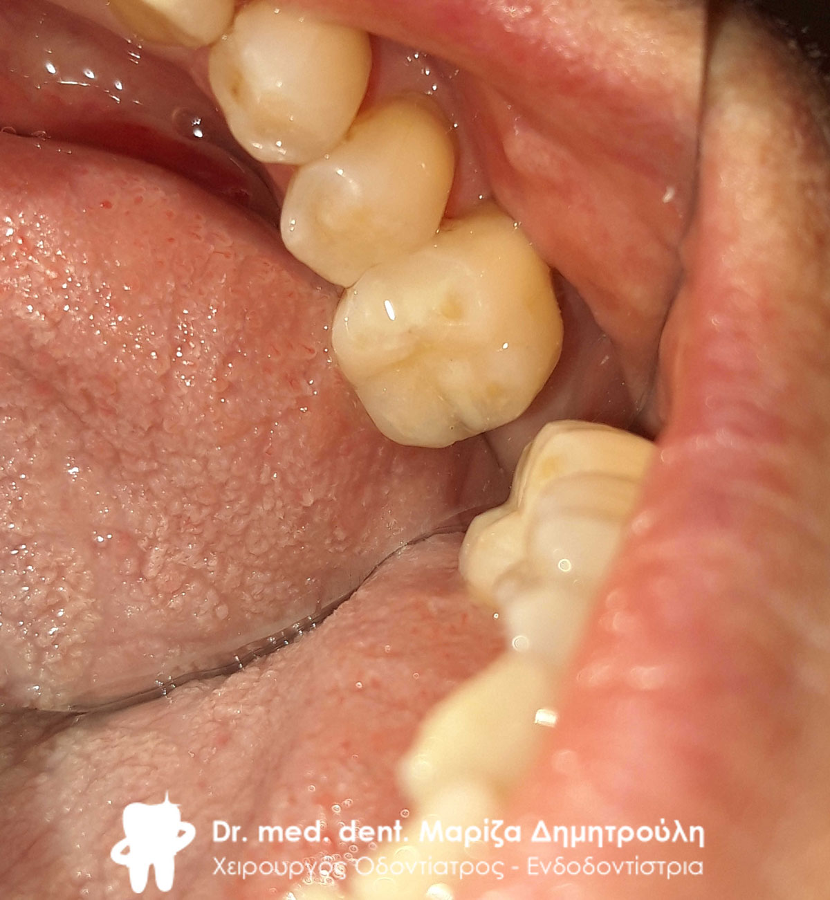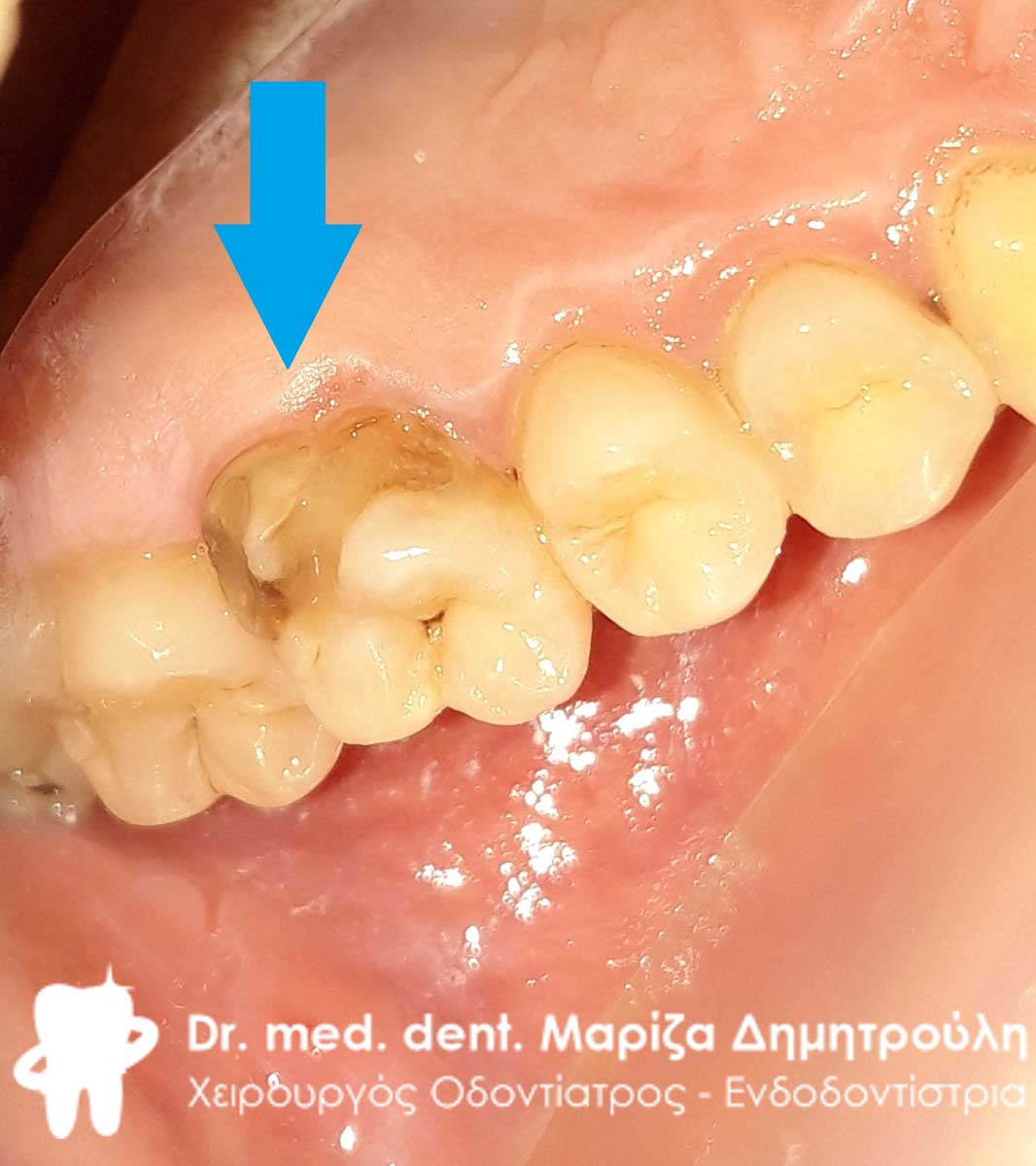 Η ασθενής πονούσε περιστασιακά στον κάτω δεξιό γομφίο. Μετά την χορήγηση τοπικής αναισθησίας, το δόντι τροχίστηκε, καθαρίστηκε η τερηδόνα και το έλλειμμα αποκαταστήθηκε με λευκό σφράγισμα.