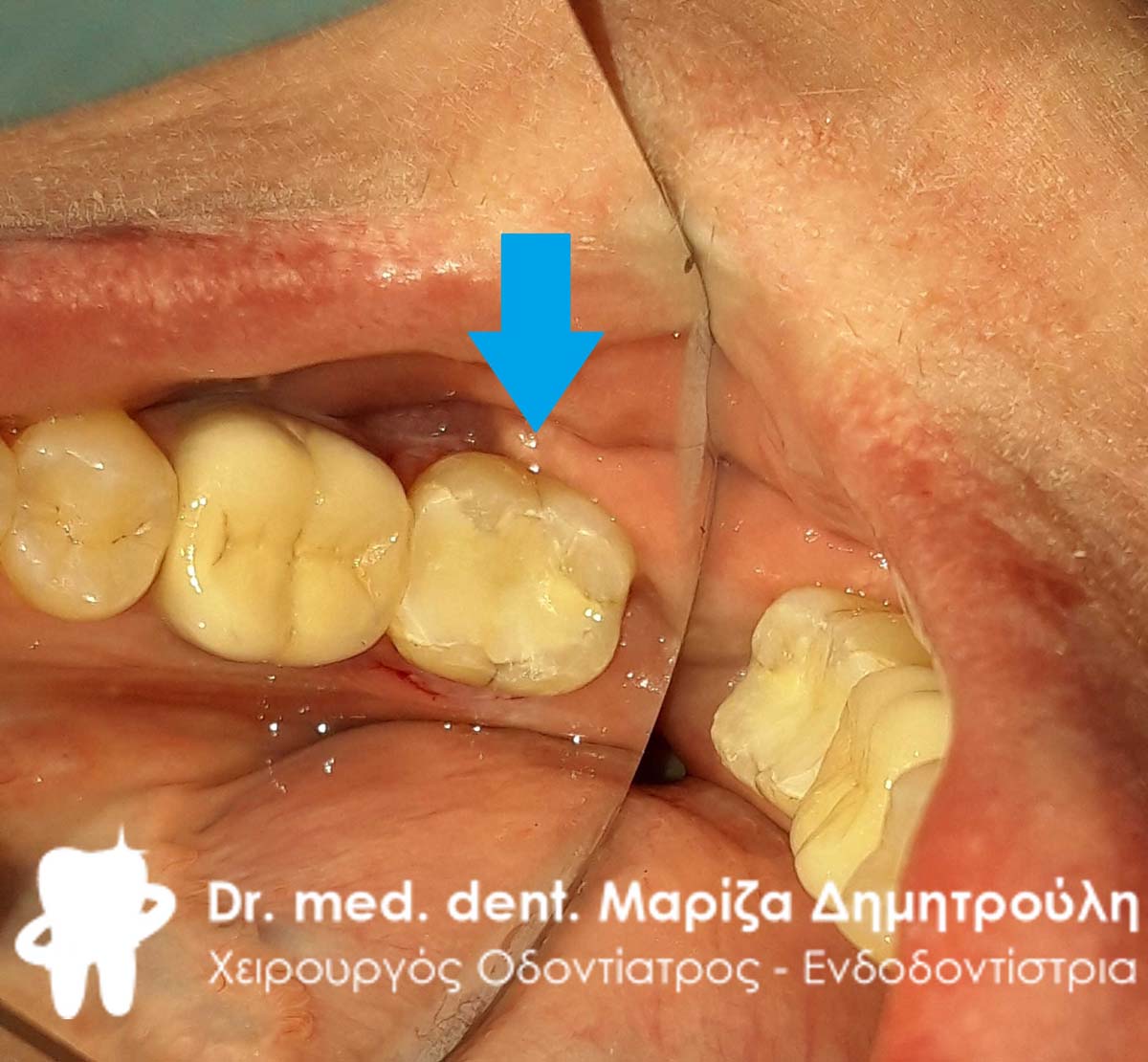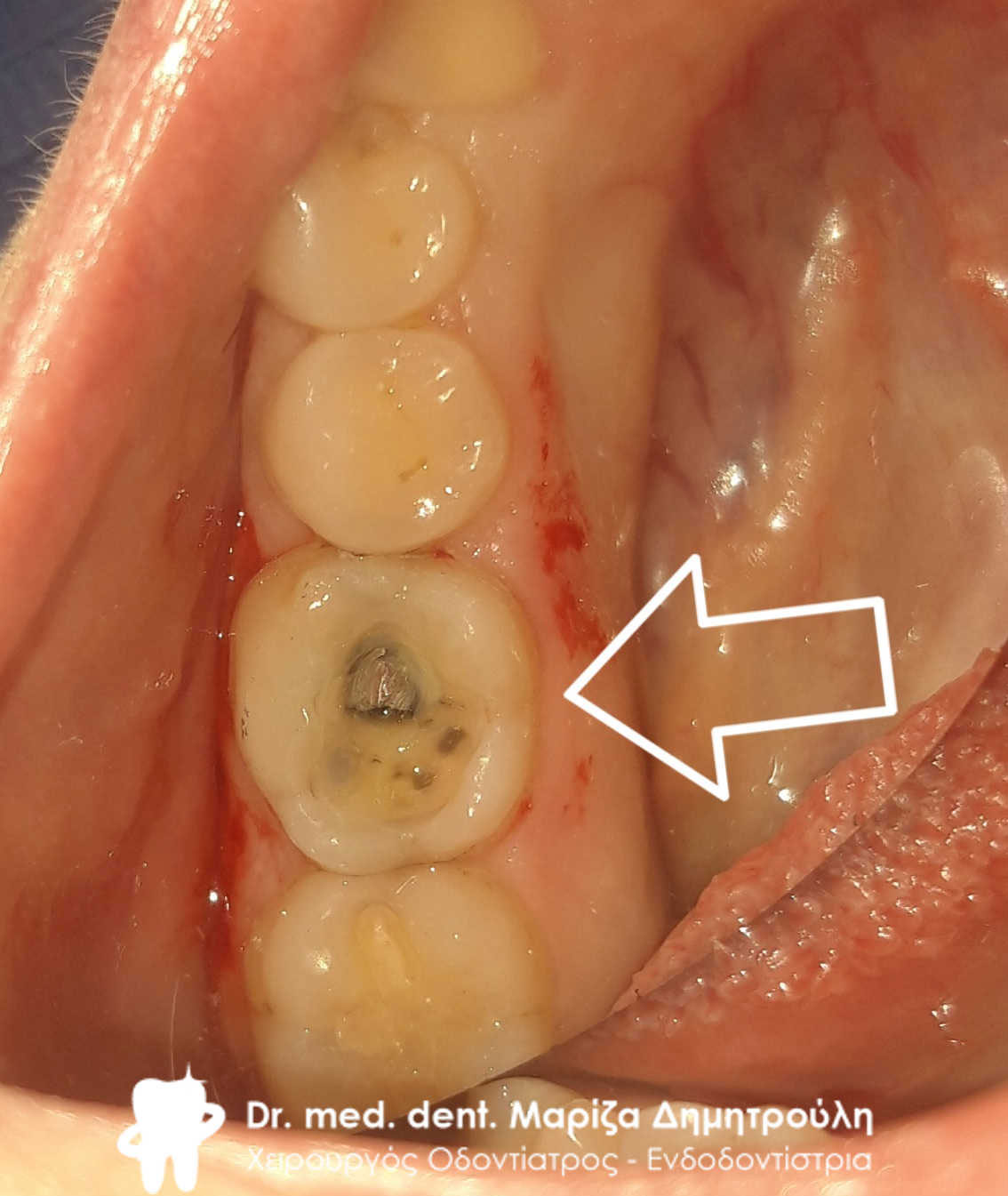 Ο συγκεκριμένος ασθενής επισκέφτηκε το ιατρείο με πολύ έντονο πόνο που τον ξύπνησε από τον βραδινό του ύπνο. Μετά την κλινική και ακτινογραφική εξέταση διαπιστώθηκε οτι ο αριστερός γομφίος της άνω γνάθου είχε ένα παλιό λευκό σφράγισμα, το οποίο είχε επανατερηδονιστεί. Αποφασίστηκε η αφαίρεση του παλιού λευκού σφραγίσματος και η διατήρηση του δοντιού ζωντανού με την τοποθέτηση νέου σφραγίσματος ρητίνης σε συνδυασμό με ειδικό υλικό προστασίας του νεύρου του δοντιού. Μετά την αφαίρεση του παλιού σφραγίσματος παρατηρήθηκε επίσης έντονη ευαισθησία στα ούλα και διαπιστώθηκε η ύπαρξη ενός βαθύ περιοδοντικού θύλακα, ο οποίος αποτυπώνεται ( με κάποιες δυσκολίες ) στις φωτογραφίες που ακολουθούν. Στον περιοδοντικό θύλακο συγκεντρωνόντουσαν υπολείμματα τροφών, τα οποία αύξαναν την ένταση του πόνου και δυσφορίας στον ασθενή.