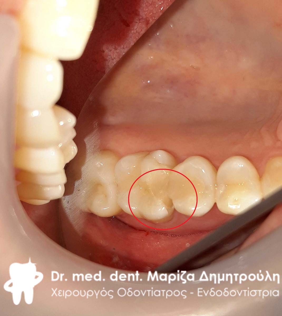 Η ασθενής είχε ένα παλιό σφράγισμα, το οποίο την πονούσε είτε όταν μασούσε είτε αυθόρμητα χωρίς την παρουσία κάποιου ερεθίσματος. Αποφασίστηκε η αφαίρεση του παλιού σφραγίσματος και η προσωρινή αποκατάσταση του δοντιού με ειδικό εμφρακτικό υλικό, το οποίο διαθέτει καταπραϋντική ιδιότητα. Εφόσον τα συμπτώματα της ασθενούς υποχώρησαν, πραγματοποιήθηκε σε δεύτερο ραντεβού η τελική αποκατάσταση του δοντιού με λευκό σφράγισμα σύνθετης ρητίνης.