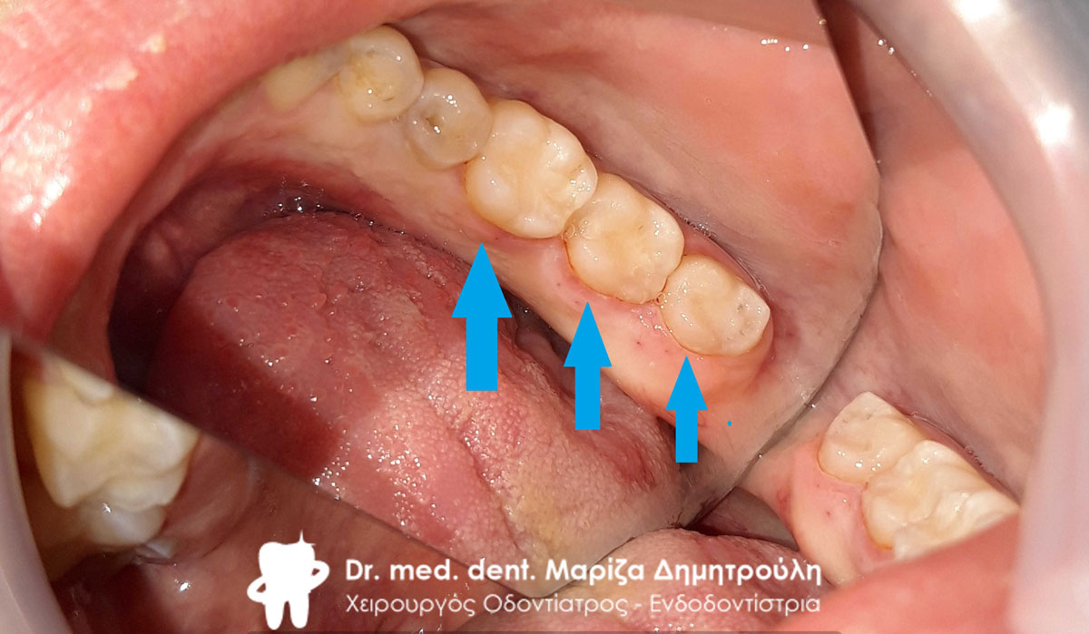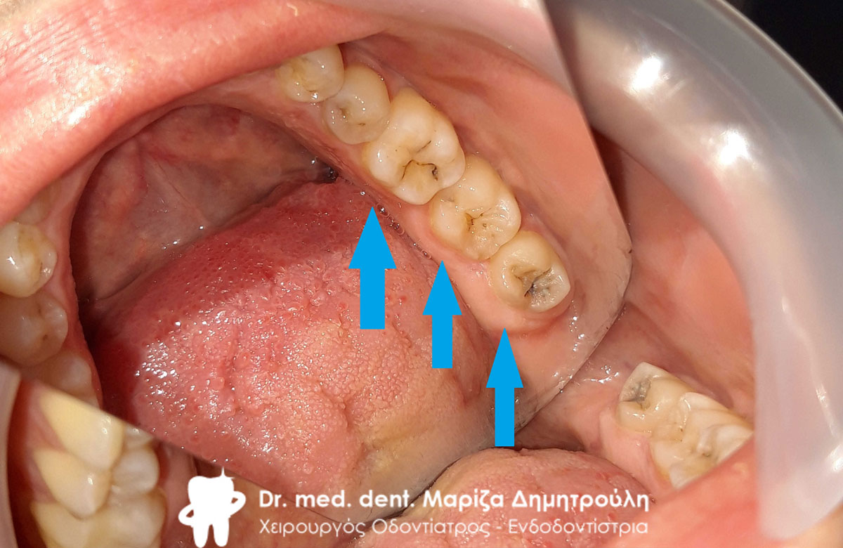 Στον ασθενή πραγματοποιήθηκαν δύο λευκά σφραγίσματα στην αριστερή πλευρά της κάτω γνάθου.