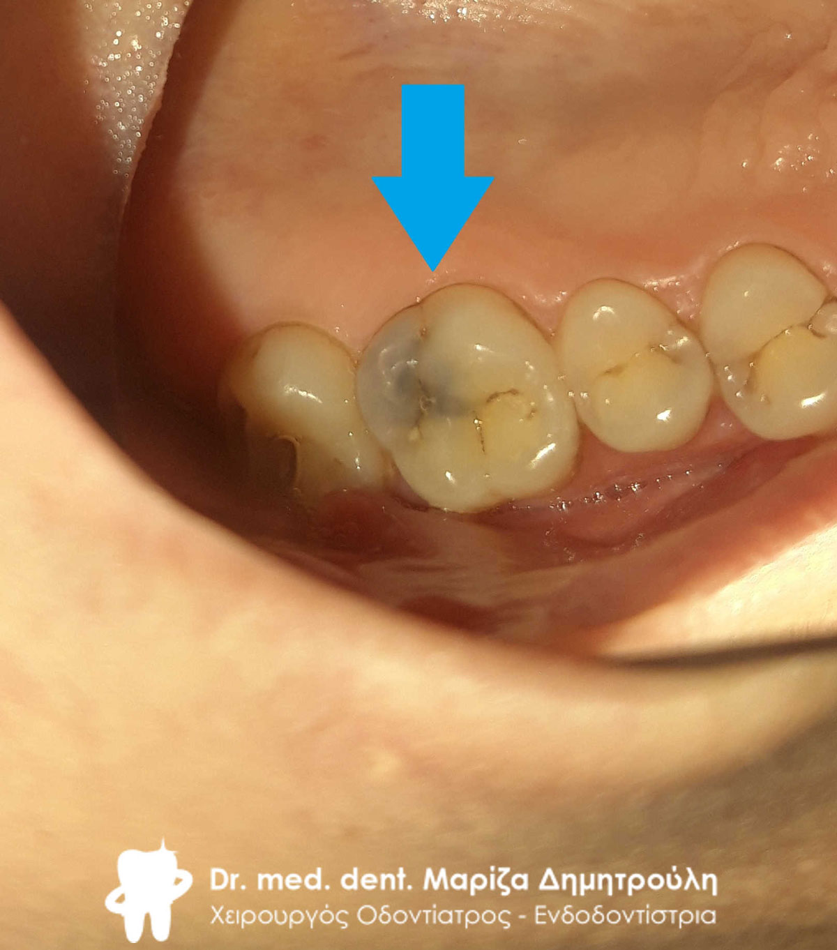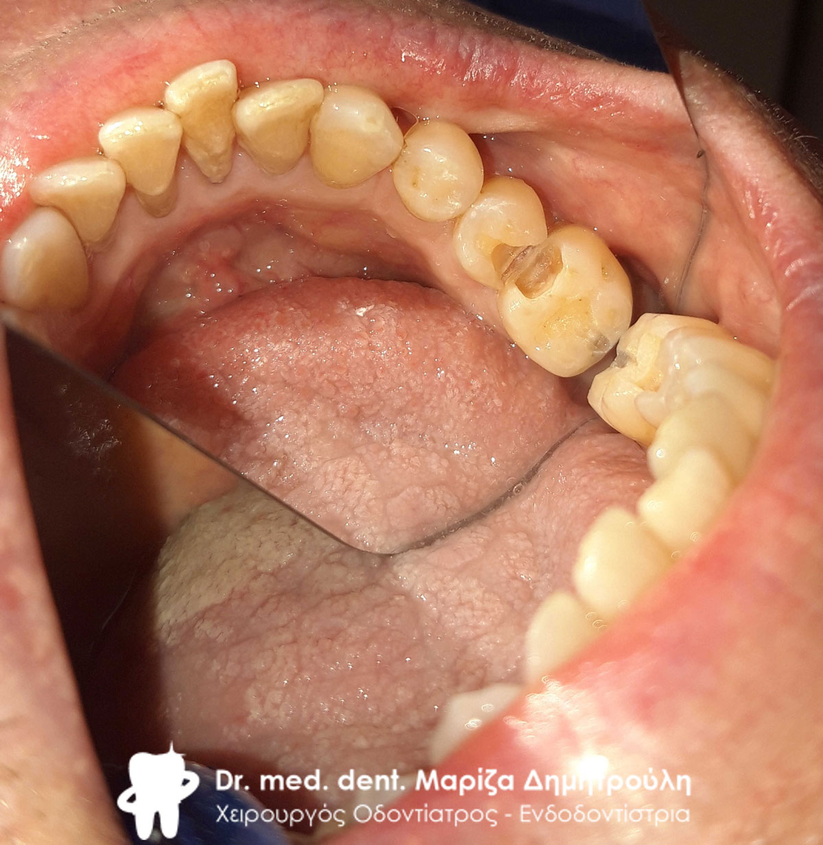 Στα πλαίσια του ετήσιου οδοντιατρικού ελέγχου εντοπίστηκε ένα τερηδονισμένο δόντι, το οποίο δεν είχε γίνει αντιληπτό από τον ασθενή. Προτού ξεκινήσει η διαδικασία τροχίσματος του δοντιού, ο ασθενής ενημερώθηκε οτι η τερηδόνα πιθανόν να εκτείνεται βαθιά (στο ύψος του νεύρου του δοντιού), γεγονός που επιβεβαιώθηκε κατά τη διάνοιξη της κοιλότητας (2η φωτογραφία). Η αποκατάσταση του δοντιού πραγματοποιήθηκε με λευκό σφράγισμα ρητίνης.