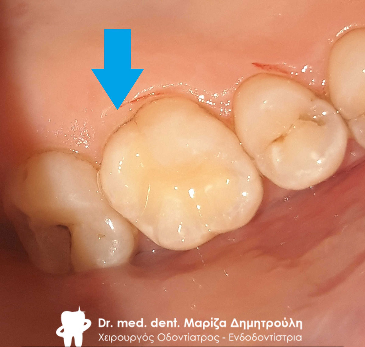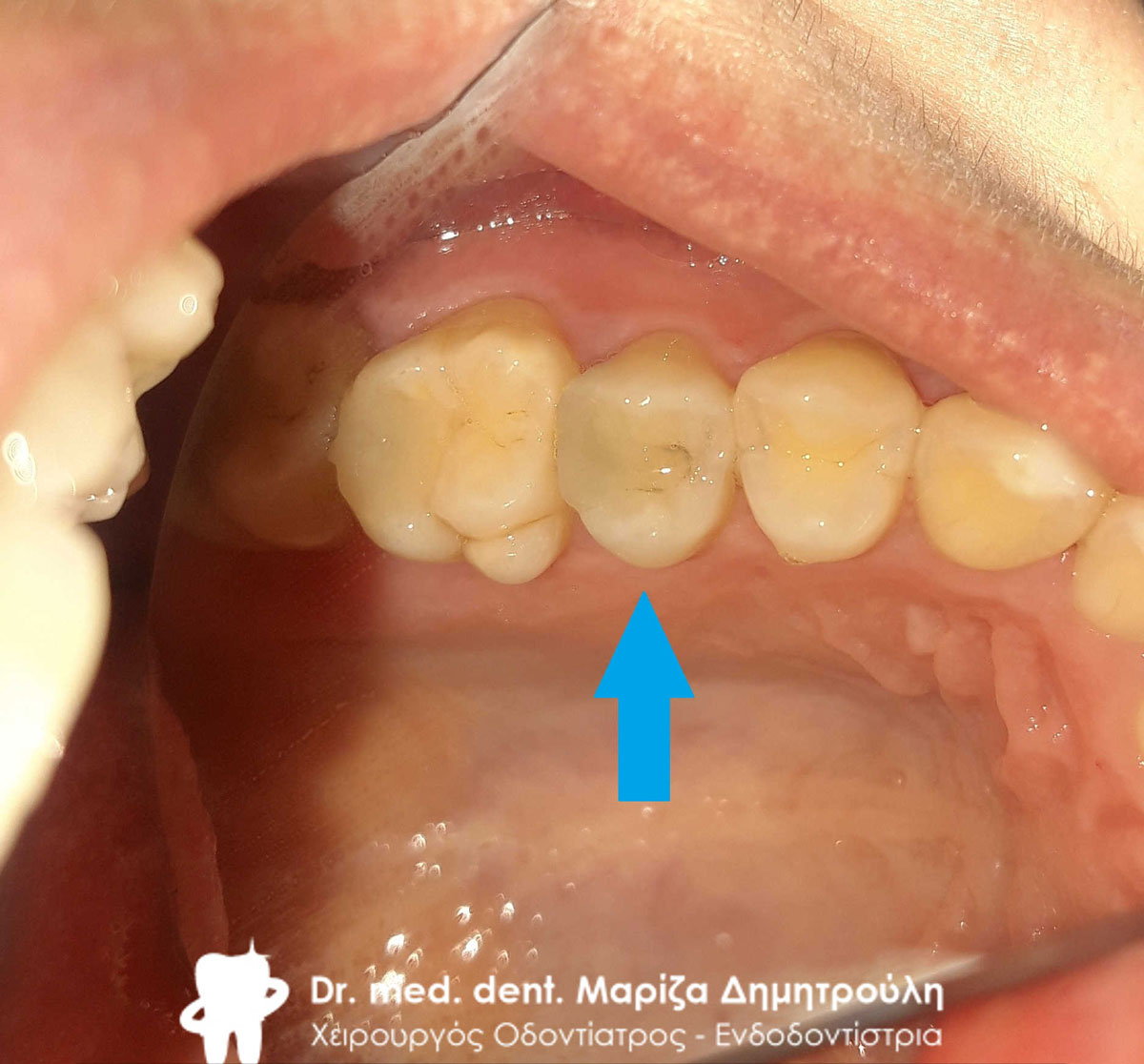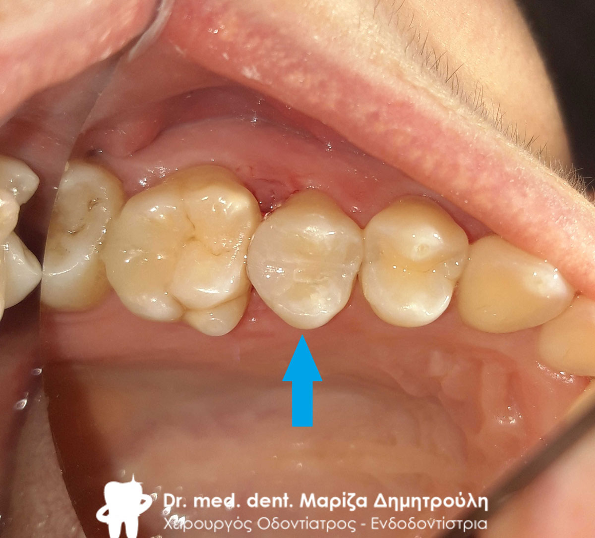 Ο ασθενής μετά το πέρας της ενδοδοντικής θεραπείας του δοντιού προτίμησε (για οικονομικούς λόγους) την αποκατάσταση του με λευκό σφράγισμα σύνθετης ρητίνης έναντι της τοποθέτησης θήκης δοντιού, η οποία σαφώς προστατεύει το δόντι με μεγαλύτερη ασφάλεια. Στο συγκεκριμένο δόντι επειδή απουσίαζε μεγάλο τμήμα οδοντικού ιστού δεν ήταν δυνατόν ένα απλό σφράγισμα ρητίνης να αποδώσει επαρκές σημείο επαφής με το παρακείμενο δόντι. Ο ασθενής ενημερώθηκε και δεν τον ενοχλούσε.