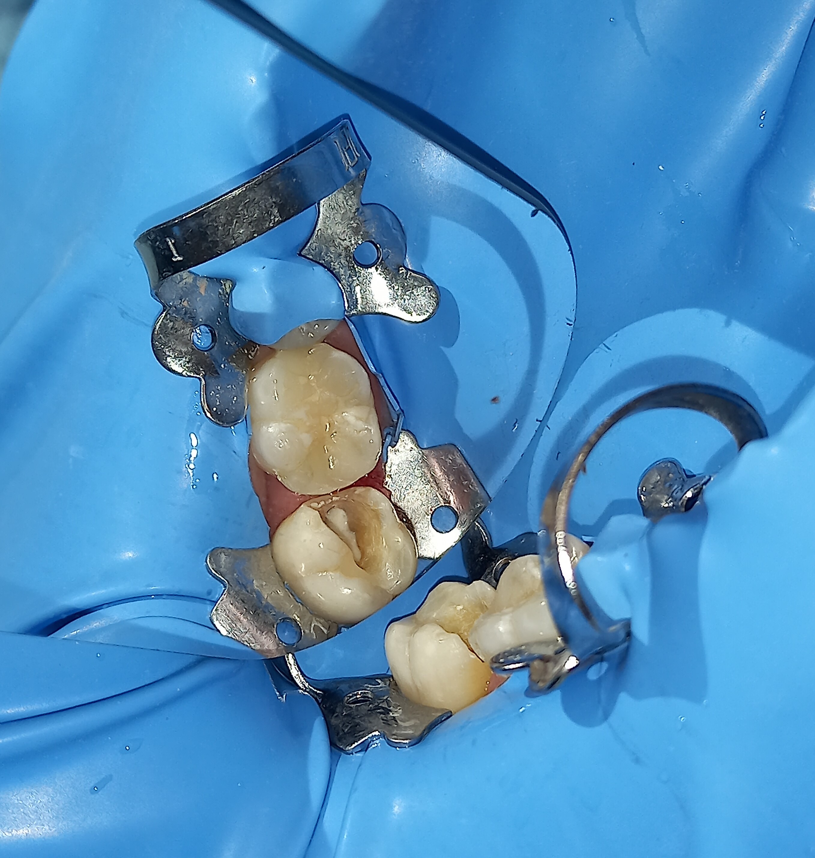 Στην ασθενή πραγματοποιήθηκαν λευκά σφραγίσματα στο γομφίο της άνω δεξιάς πλευράς και στο γομφίο της κάτω δεξιάς πλευράς. Στον κάτω γομφίο μετά την αφαίρεση του παλιού λευκού σφραγίσματος (απουσιάζει η αρχική εικόνα του παλιού σφραγίσματος) διαπιστώθηκε η ύπαρξη μαύρου σφραγίσματος αμαλγάματος. Τα δύο δόντια αποκαταστάθηκαν με νέα λευκά σφραγίσματα ρητίνης.