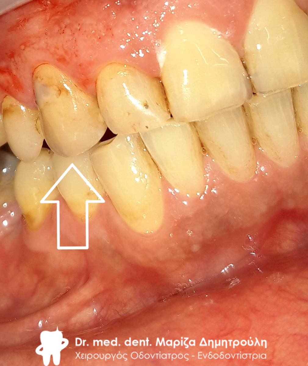 Μετά την κλινική εξέταση διαπιστώθηκε οτι το συγκεκριμένο δόντι είχε επανατερηδονιστεί. Η θεραπεία επιλογής ήταν η αφαίρεση του παλιού δυχρωμικού παλιού λευκού σφραγίσματος και η αντικατάσταση του με νέο λευκό σφράγισμα ρητίνης.