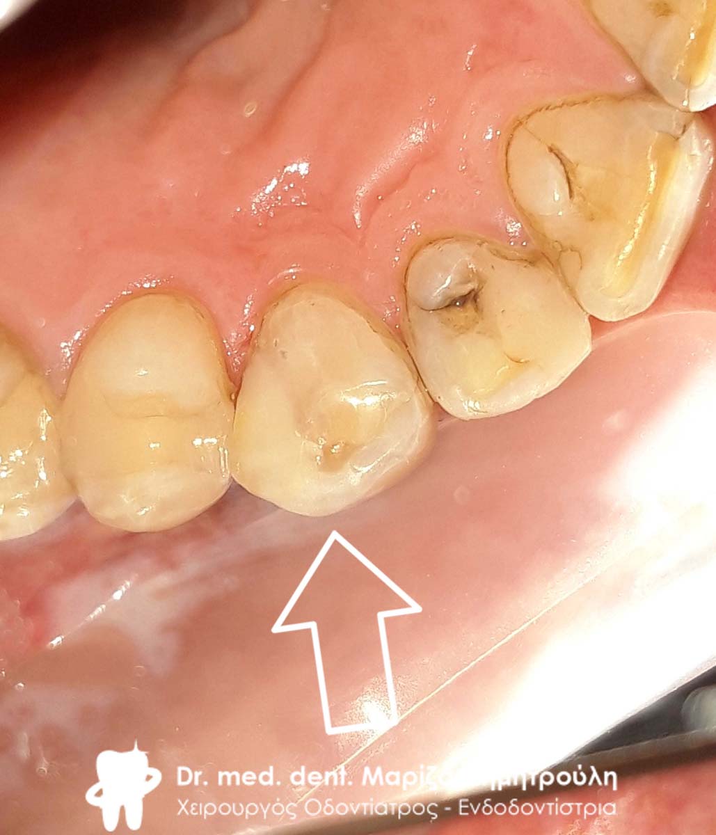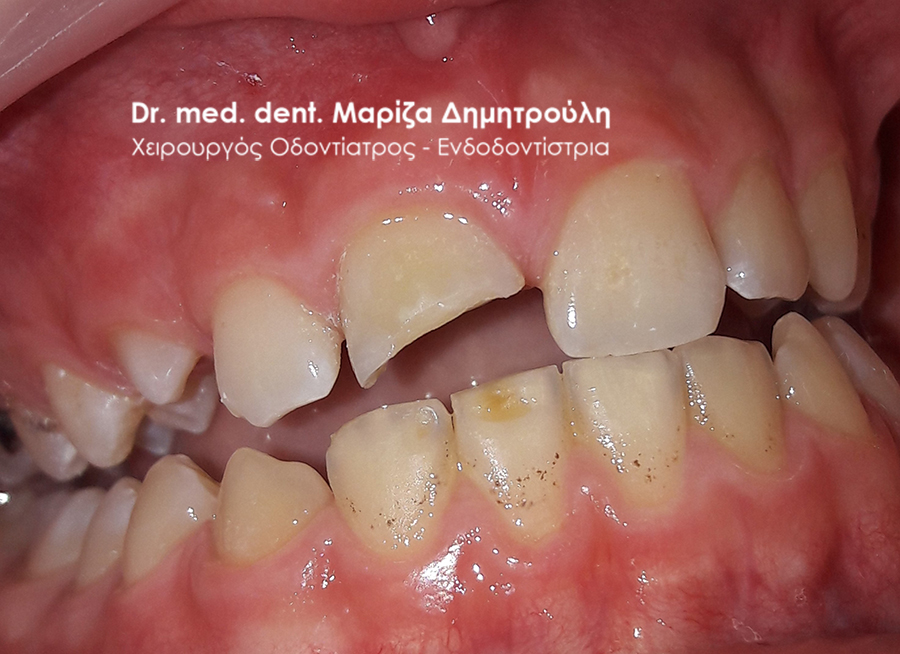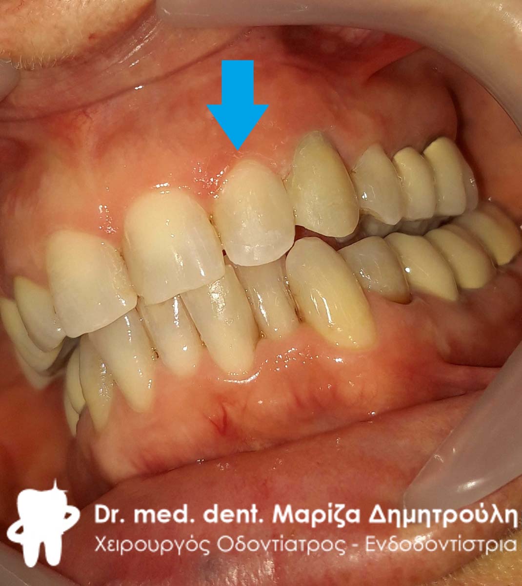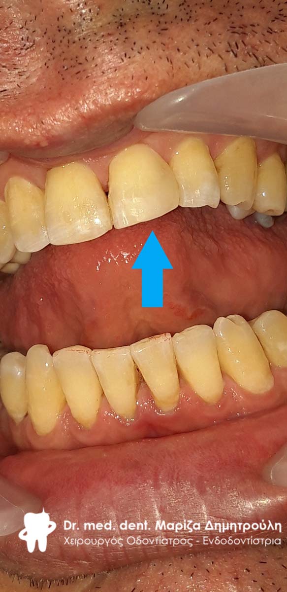 Στο συγκεκριμένο ασθενή πραγματοποιήθηκε στο ιατρείο απονεύρωση του άνω δεξιού κεντρικού τομέα. Κατά τη διάρκεια του τελευταίου ραντεβού της απονεύρωσης αποκόλλησε το λευκό σφράγισμα ρητίνης που είχε πραγματοποιηθεί από τον παραπέμποντα οδοντίατρο. Η αντιμετώπιση έπρεπε να πραγματοποιηθεί άμεσα λόγω της θέσης του δοντιού σε εμφανές σημείο του στόματος.