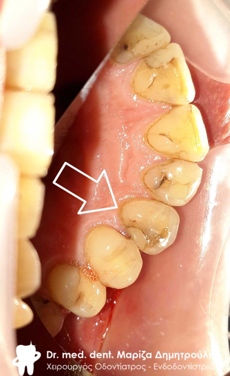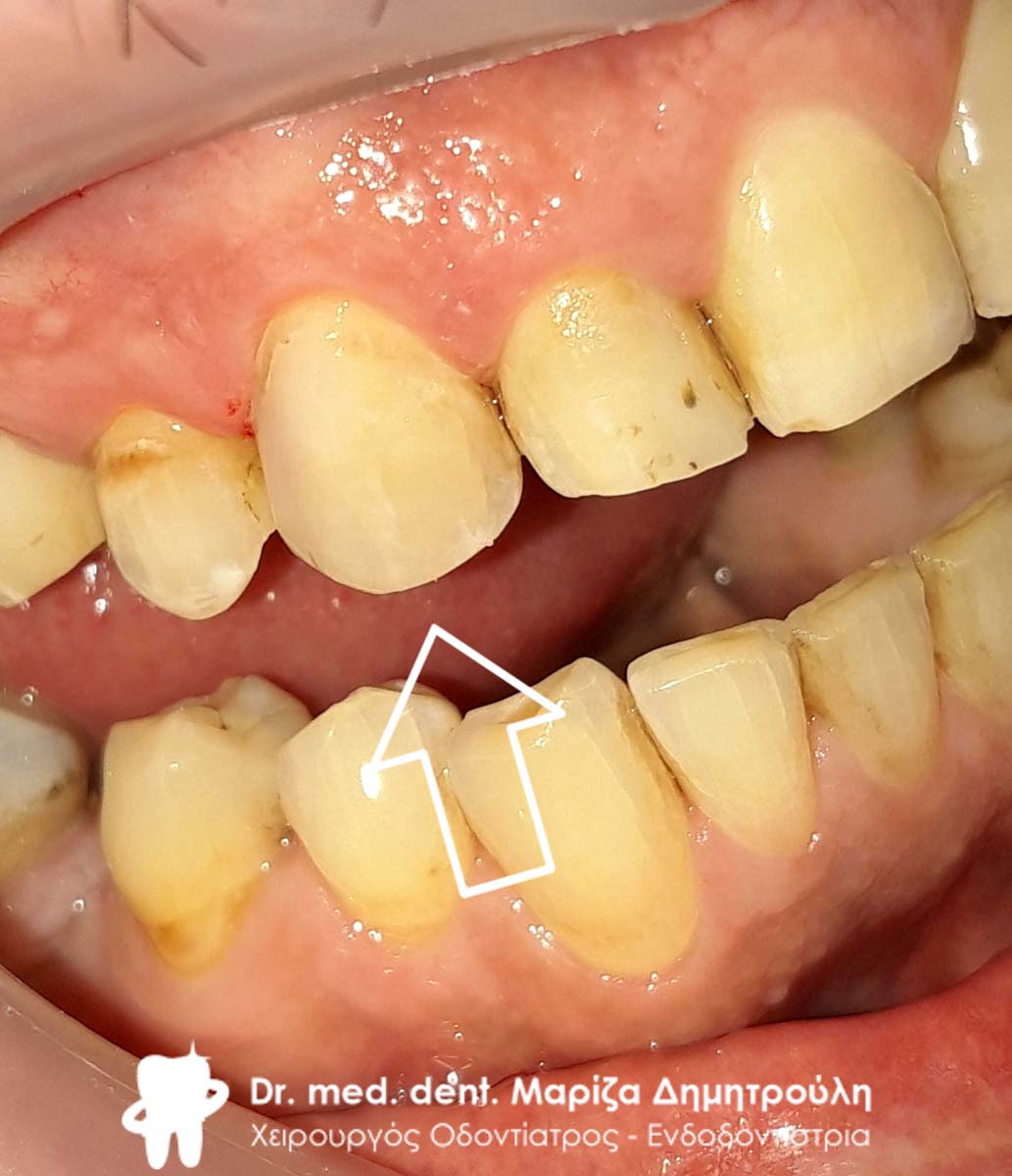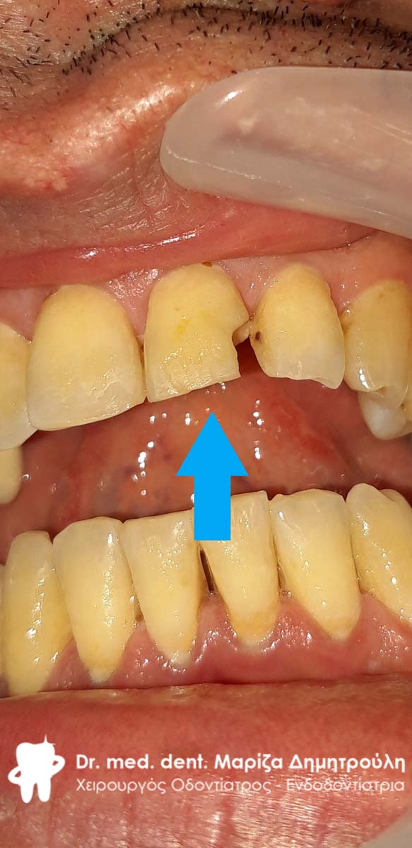 Στο συγκεκριμένο ασθενή πραγματοποιήθηκε στο ιατρείο απονεύρωση του άνω δεξιού κεντρικού τομέα. Κατά τη διάρκεια του τελευταίου ραντεβού της απονεύρωσης αποκόλλησε το λευκό σφράγισμα ρητίνης που είχε πραγματοποιηθεί από τον παραπέμποντα οδοντίατρο. Η αντιμετώπιση έπρεπε να πραγματοποιηθεί άμεσα λόγω της θέσης του δοντιού σε εμφανές σημείο του στόματος.