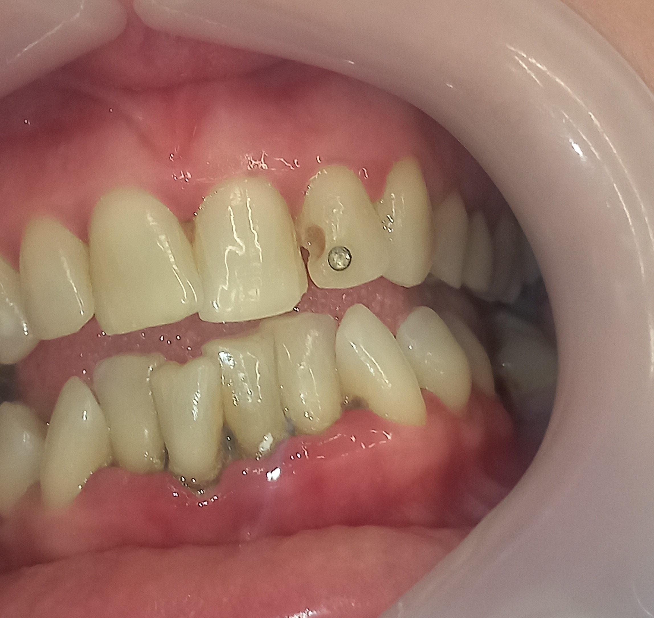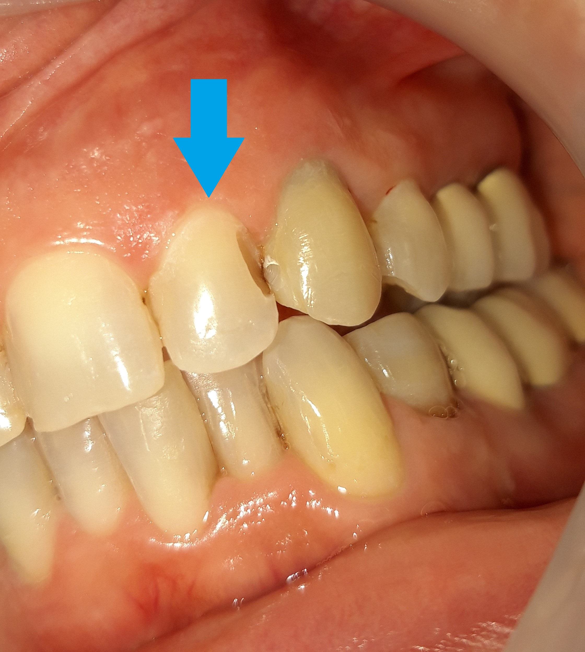 Η ασθενής είχε ένα παλιό λευκό σφράγισμα στον πλάγιο τομέα στην αριστερή πλευρά της άνω γνάθου, το οποίο είχε επανατερηδονιστεί και αποχρωματιστεί ελαφρώς. Η φωτογραφίας της αρχικής κλινικής εικόνας απουσιάζει. Μετά τον ελαφρύ εκτροχισμό του δοντιού και την αφαίρεση του παλιού σφραγίσματος ακολούθησε η αποκατάσταση της κοιλότητας με νέο λευκό σφράγισμα δοντιού.