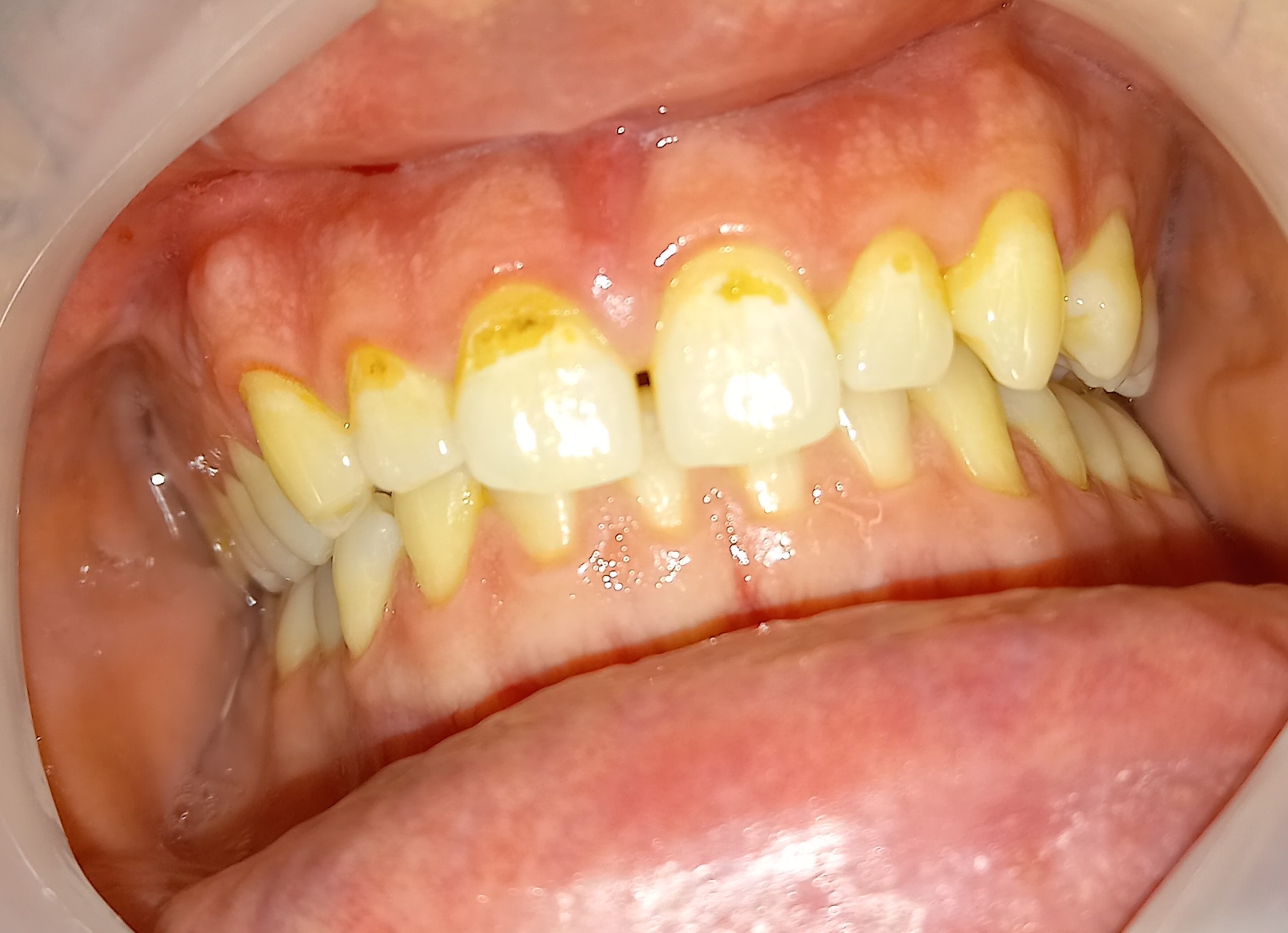 Ο ασθενής είχε έντονα χρωματισμένες (καφε- κίτρινες) μικρές τερηδονικές κοιλότητες στα άνω πρόσθια δόντια, που είχαν ως αποτέλεσμα ένα άσχημο αισθητικό χαμόγελο. Σε μία συνεδρία αφαιρέθηκαν οι τερηδονισμένοι οδοντικοί ιστοί και οι αλλοιώσεις αποκαταστάθηκαν με λευκά αισθητικά σφραγίσματα.