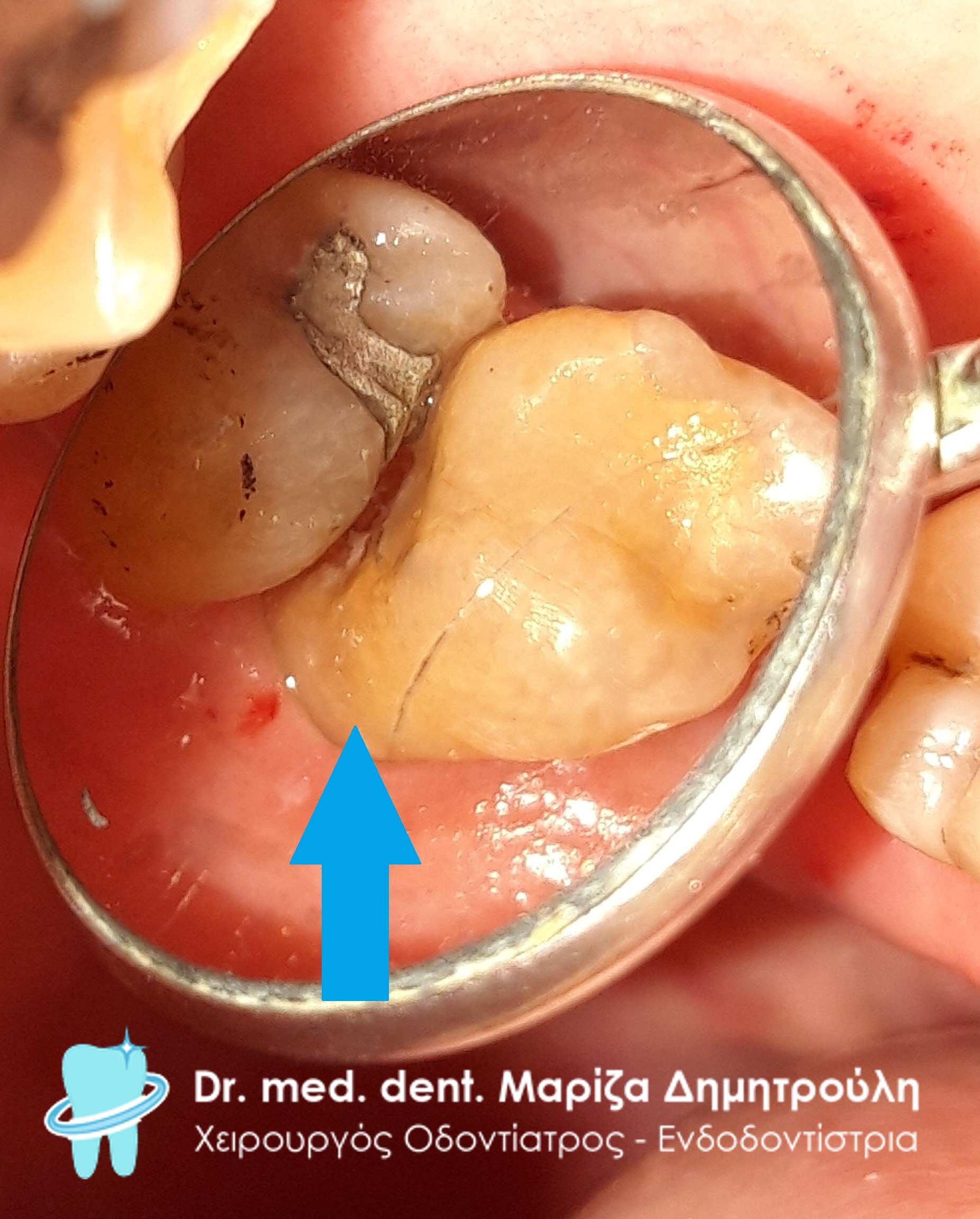 Μετά τη χορήγηση τοπικής αναισθησίας απομακρύνθηκαν οι τερηδονισμένοι οδοντικοί ιστοί, τοποθετήθηκε ειδικό υλικό προστασίας του νεύρου του δοντιού και ακολούθησε η ανασύσταση της οδοντικής βλάβης. Η παρουσία αίματος που φαίνεται στη φωτογραφία είναι ένας παροδικός ερεθισμός των ούλων από την οδοντιατρική διαδικασία, ο οποίος υποχωρεί σε διάστημα λίγων ωρών.