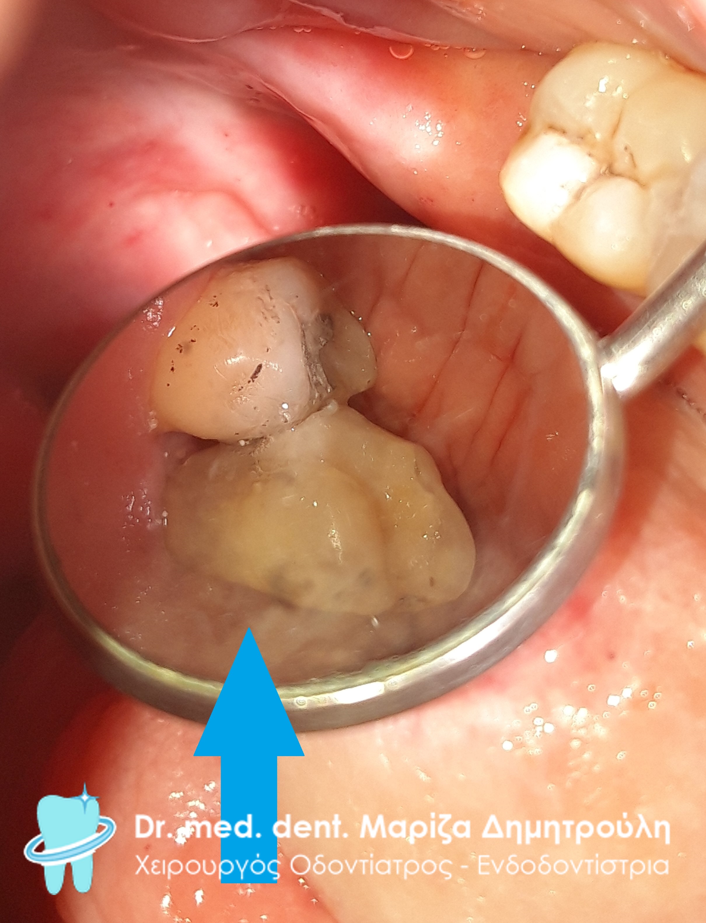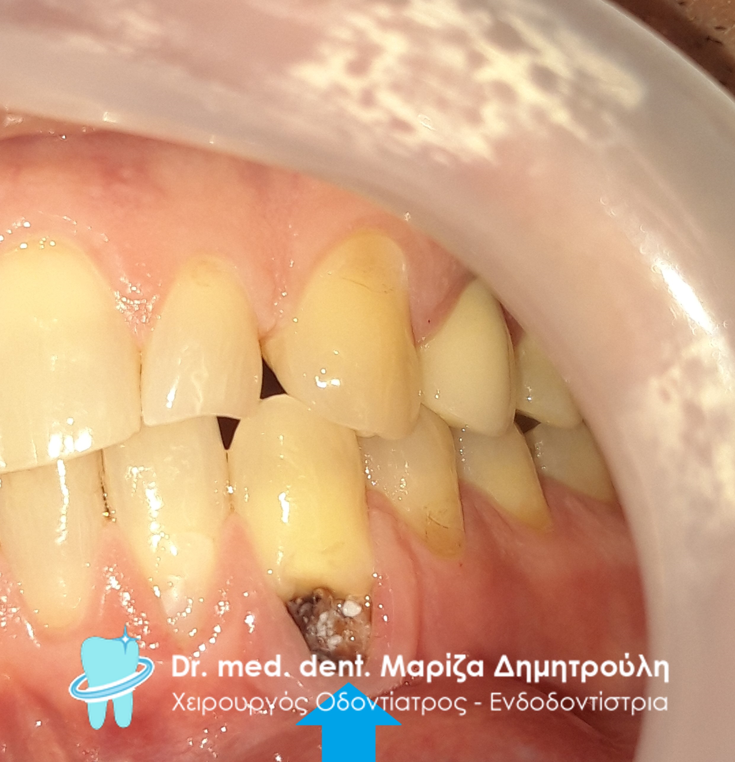 Ο ασθενής επισκέφτηκε τον οδοντίατρό του για τον ετήσιο τυπικό οδοντιατρικό έλεγχο. Η κλινική εξέταση αποκάλυψε μία τερηδόνα ρίζας και προτάθηκε στον ασθενή η εξαγωγή του δοντιού. Ο ασθενής σύμφωνα με τις υποδείξεις των γναθοχειρουργών αρνήθηκε την εξαγωγή του δοντιού του, επισκέφτηκε το ιατρείο μας και μας εξήγησε το ιστορικό του.