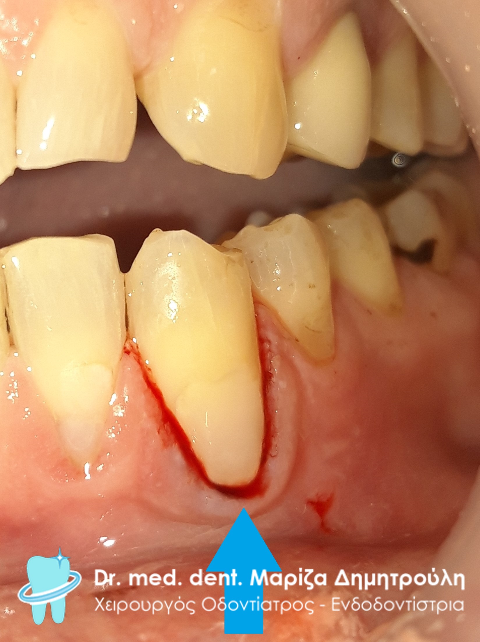 Ο ασθενής όταν επισκέφτηκε το ιατρείο με σκοπό τη διόρθωση μιας ” μαυρίλας ” που βλέπει εδώ και καιρό στον αριστερό κυνόδοντα της κάτω γνάθου. Η ” μαυρίλα ” αυτή δεν ήταν τόσο αθώα και εύκολη όσο ακουγόταν. Η κλινική εικόνα αποκάλυψε την ύπαρξη βαθιάς τερηδόνας στη ρίζα του δοντιού, η οποία έφτανε στο ύψος του νεύρου του δοντιού. Η τερηδόνα στη ρίζα του δοντιού οφείλεται στον τρόπο με τον οποίο ο ασθενής βούρτσιζε τα δόντια του και είχε προκαλέσει την υφίζηση ούλων. Η υφίζηση ούλων συνοδεύεται με αποκάλυψη οδοντικής ουσίας, η οποία υπό φυσιολογικές συνθήκες καλύπτεται με ούλα.